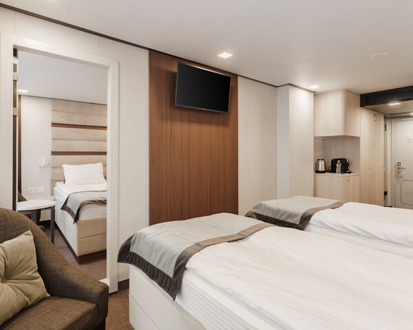 Просторные каюты с двуспальной кроватью и мягкой зоной для отдыха В каюте: двуспальная кровать (раздвигается), диван, панорамные окна, спутниковое ТВ, шкаф для одежды, холодильник, кондиционер, розетки 220V, телефон, радио, фен, капсульная кофемашина, электрочайник, сейф, ванна или душ, санузел. Площадь — до 37 м2.