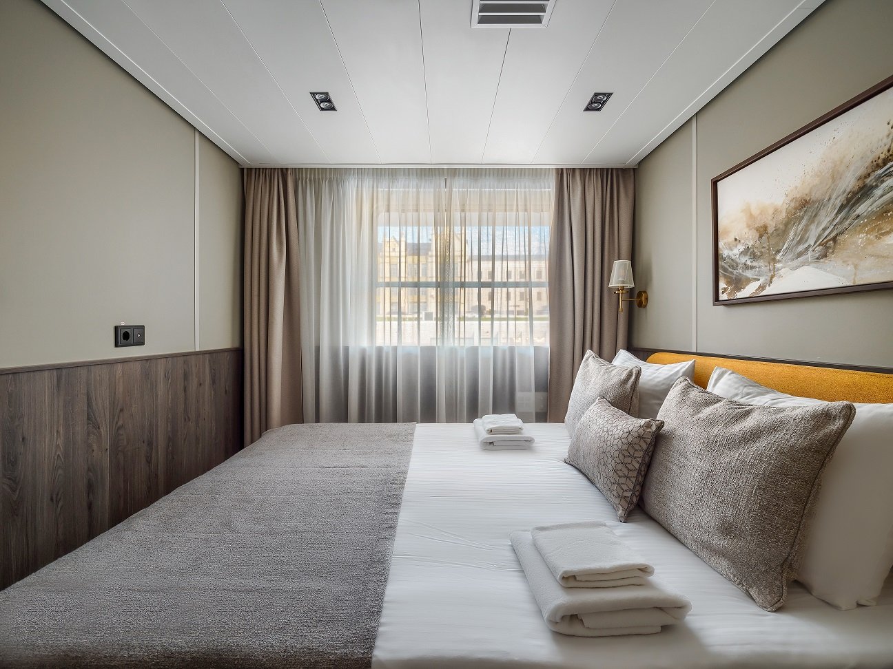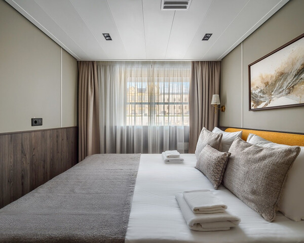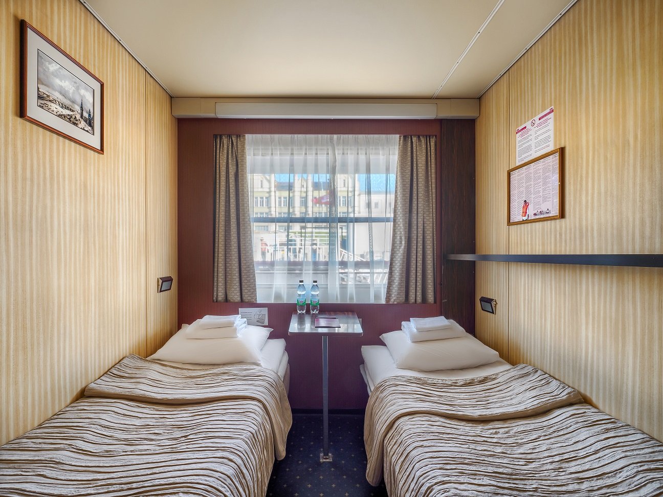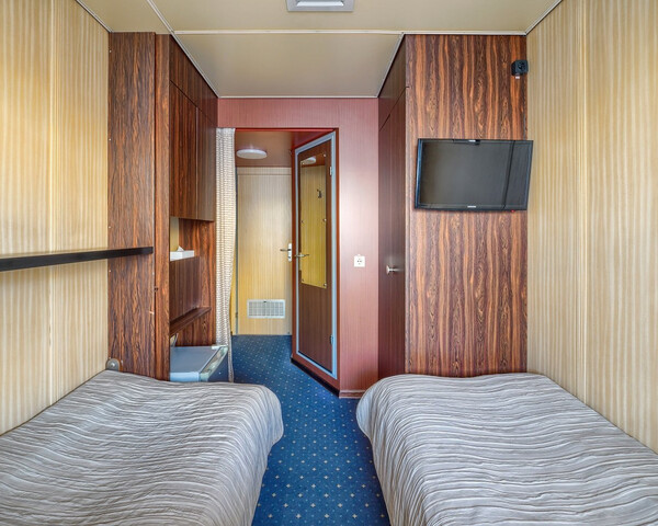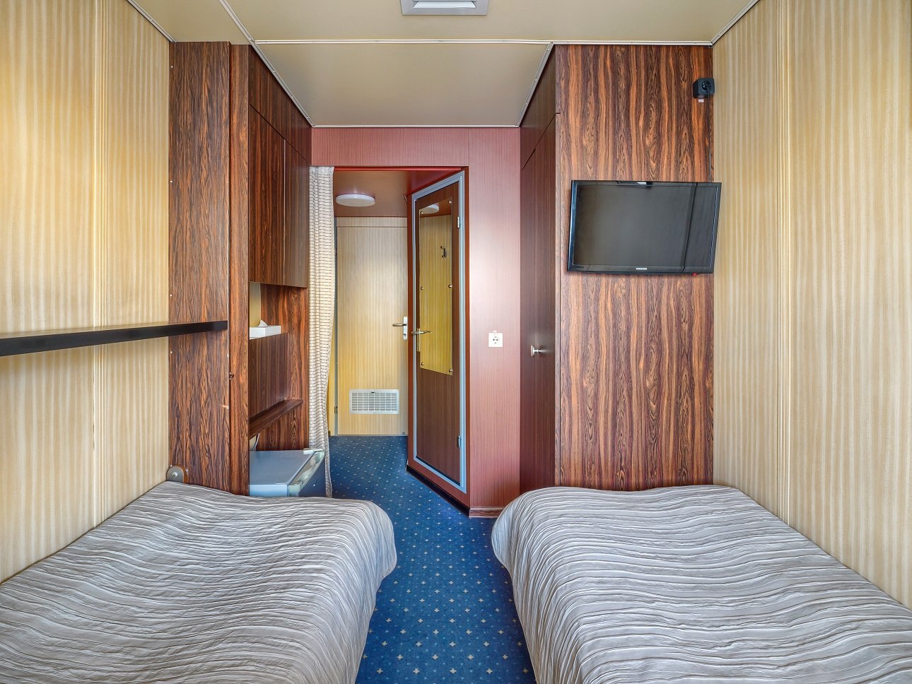 Однокомнатная одноярусная каюта, рассчитанная на размещение двух человек, площадь каюты до 7,9 кв.м. В каюте: два спальных места (не сдвигаются), шкаф для одежды, радио, кондиционер, телевизор, холодильник, фен, сейф, душ, санузел, обзорное окно, электророзетка на 220V.Размер кроватей 80х195 см