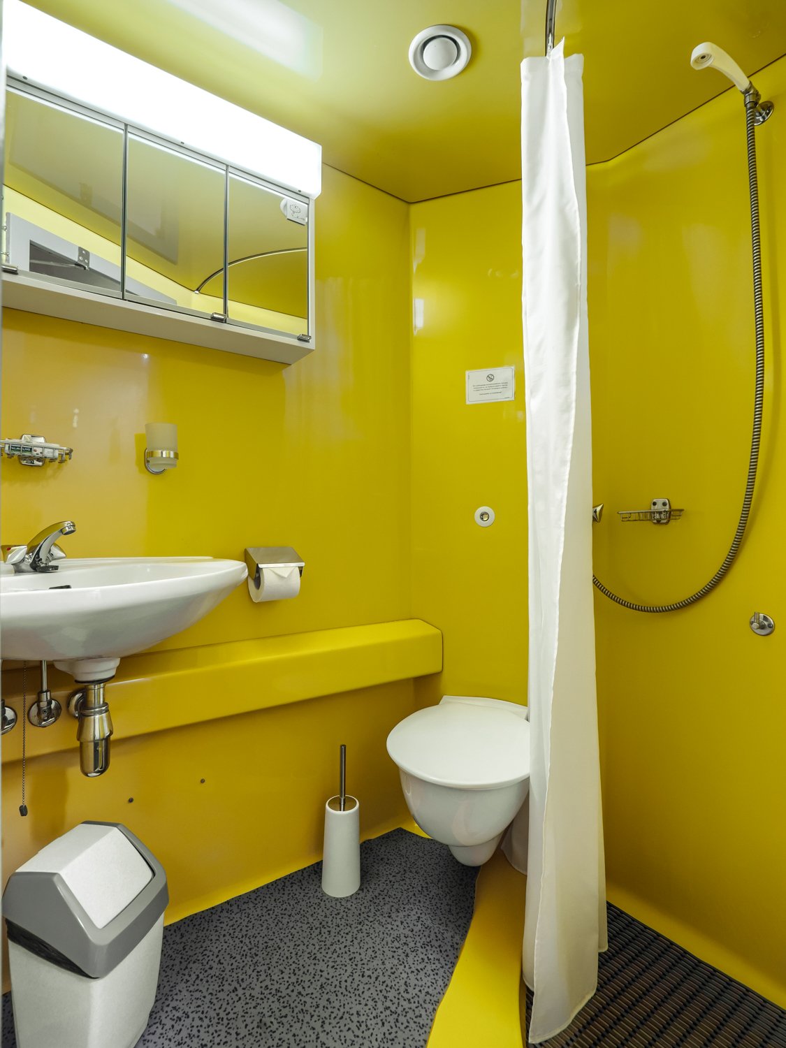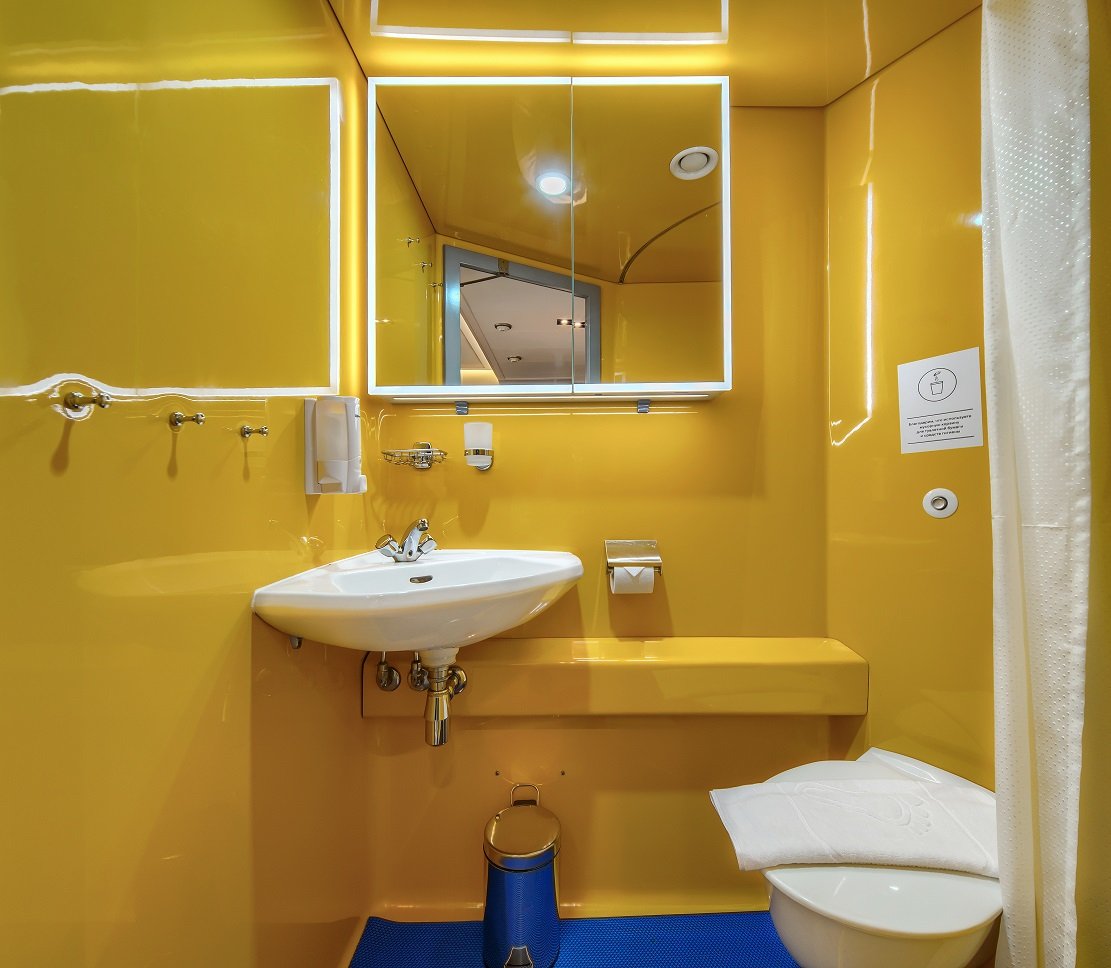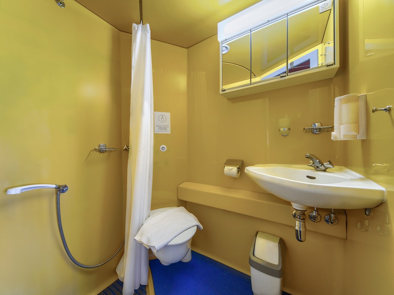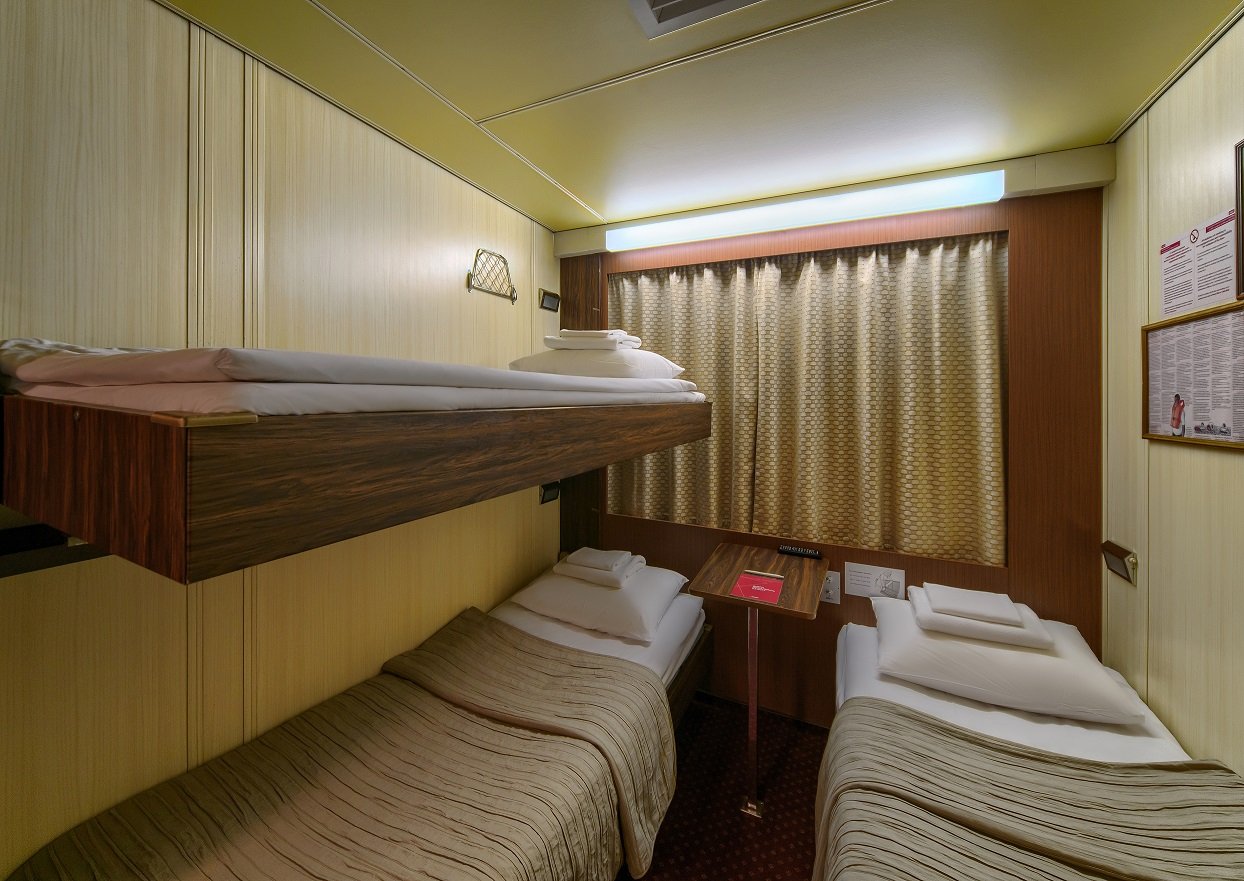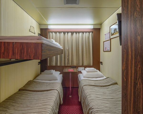 Однокомнатная двухъярусная каюта с удобствами, рассчитанная на размещение до трех человек, площадь каюты до 7,9 кв.м. В каюте три спальных места (не сдвигаются), шкаф для одежды, радио, телевизор, холодильник, фен, сейф, кондиционер, душ, санузел, обзорное окно, электророзетка на 220V.Размер кроватей: нижние — 80х195 см, верхние — 80х200 см