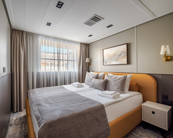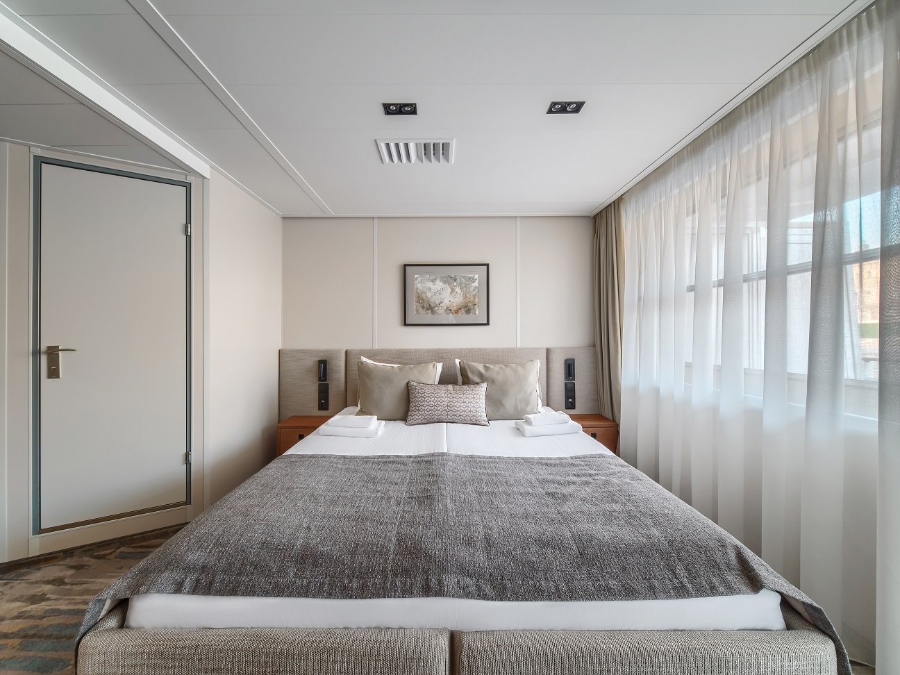 Однокомнатная каюта без балкона, рассчитанная на размещение до трех человек, площадь каюты 17,15 кв.м. Комфортабельная комната с современным интерьером. Удобства: диван (раскладывается), телевизор, двуспальная кровать (кровати раздвигаются), прикроватные тумбы, письменный стол, холодильник, книжный стеллаж, журнальный столик, пуф, шкаф для одежды, мини-бар, 4 розетки на 220V, две розетки USB, фен. Размер кровати — 175х210 см. В каюте возможно 3-местное размещение.
