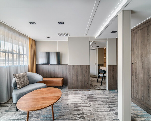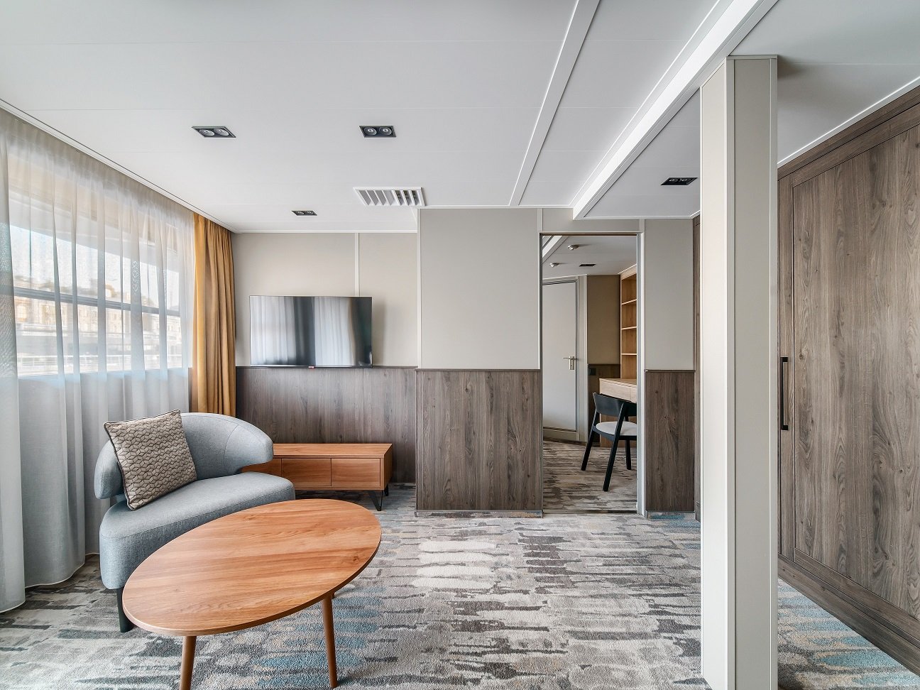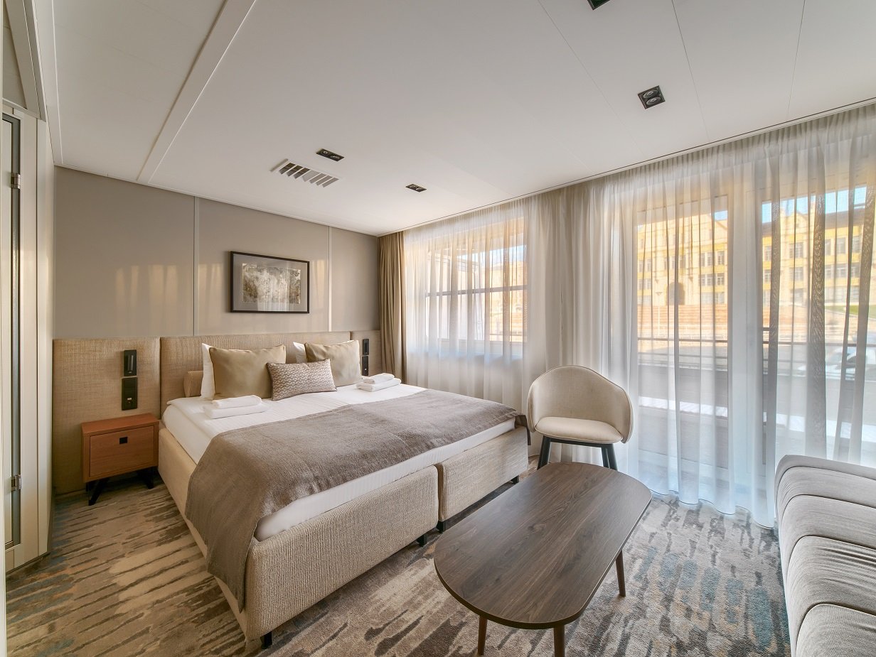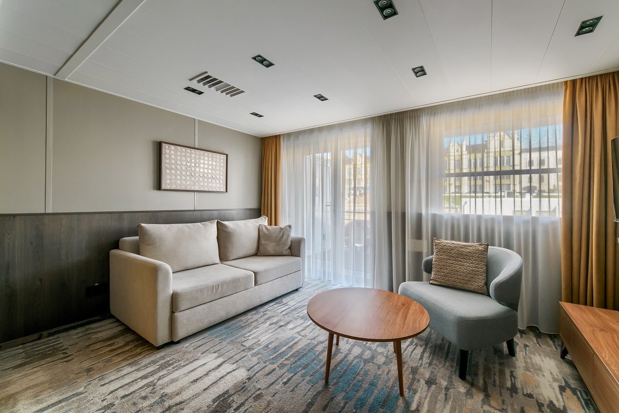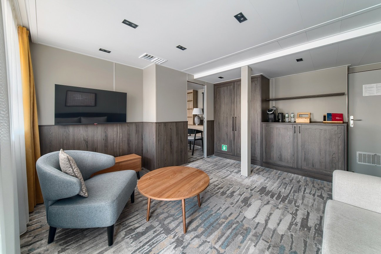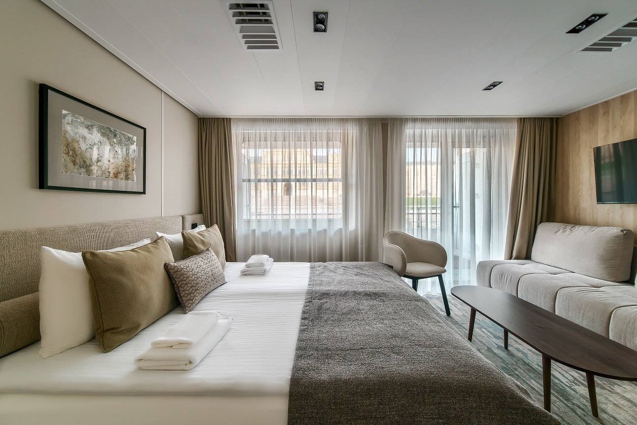 Двухкомнатная каюта с балконом, рассчитанная на размещение до четырех человек, площадь каюты до 26,8 кв.м. Комфортабельная гостиная с современным интерьером. Удобства: диван (раскладывается), кресло, журнальный столик, холодильник, телевизор, тумба, шкаф для одежды, прикроватные тумбы, 4 розетки на 220V, две розетки USB, фен. Балкон: два кресла, кофейный столик, два шезлонга. В спальне: двуспальная кровать (кровати раздвигаются), письменный стол, книжный стеллаж. В каюте возможно 4-местное размещение. Размер кровати —175х210 см. Размер дивана — 150х185 см.