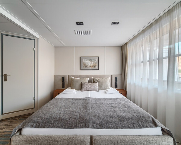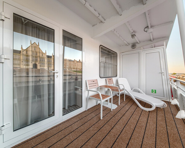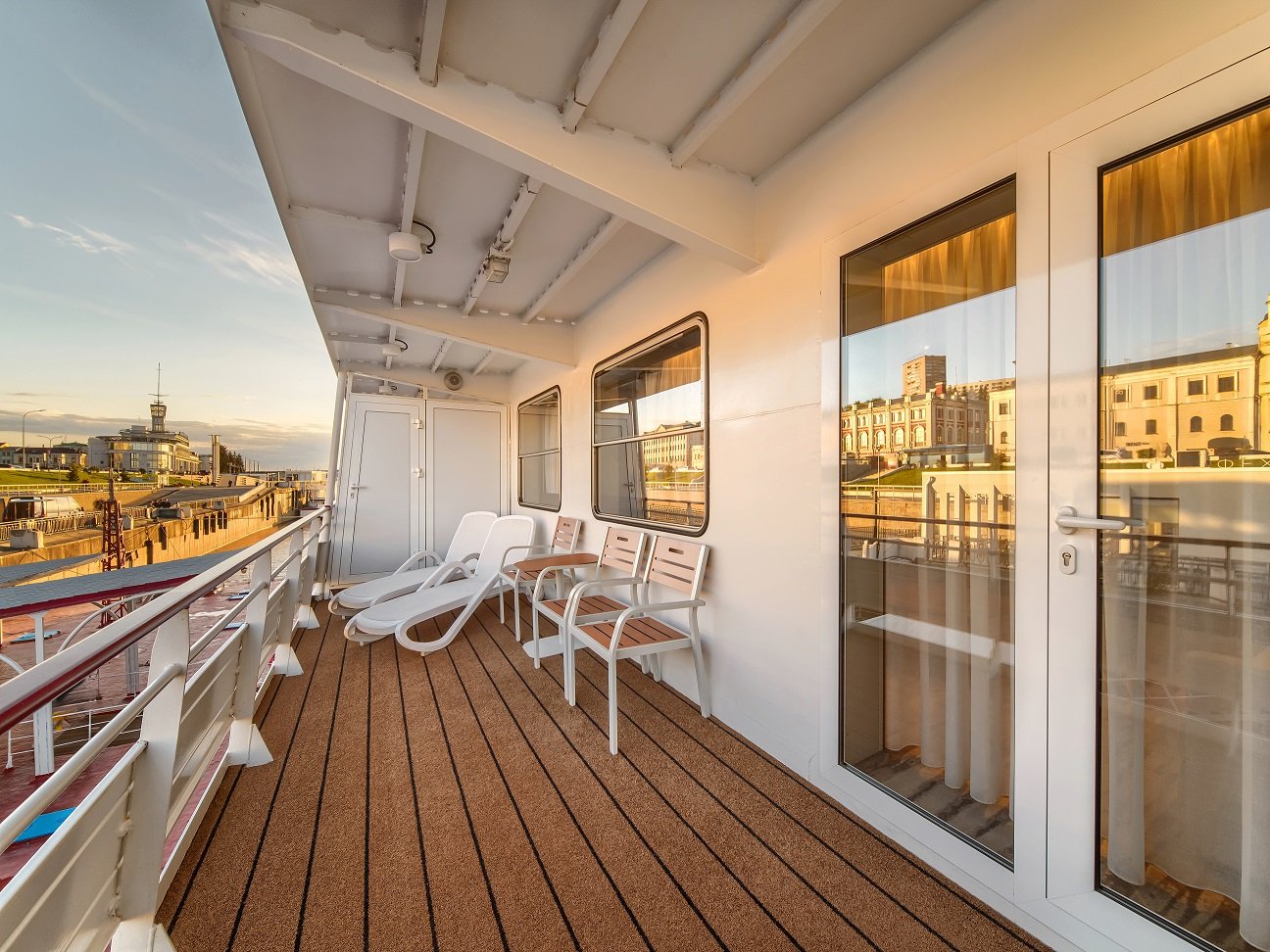 Однокомнатная каюта с балконом, рассчитанная на размещение до трех человек, площадь каюты 17,15 кв.м. Комфортабельная комната с современным интерьером. Удобства: диван (раскладывается), телевизор, двуспальная кровать (кровати раздвигаются), прикроватные тумбы, письменный стол, холодильник, книжный стеллаж, журнальный столик, пуф, шкаф для одежды, 4 розетки на 220V, две розетки USB, фен. Балкон: два кресла, кофейный столик. Размер кровати — 175х210 см. В каюте возможно 3-местное размещение.