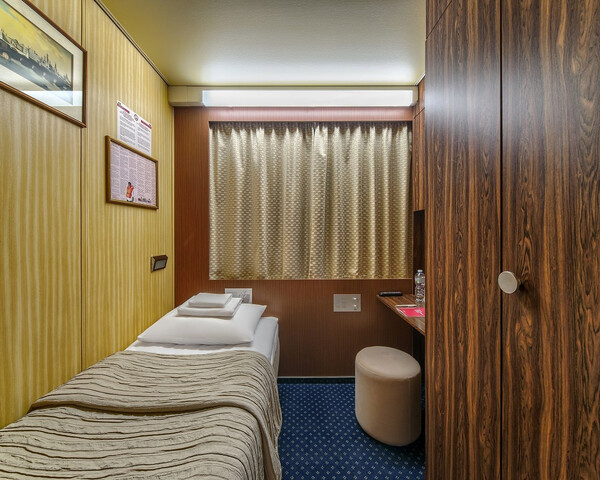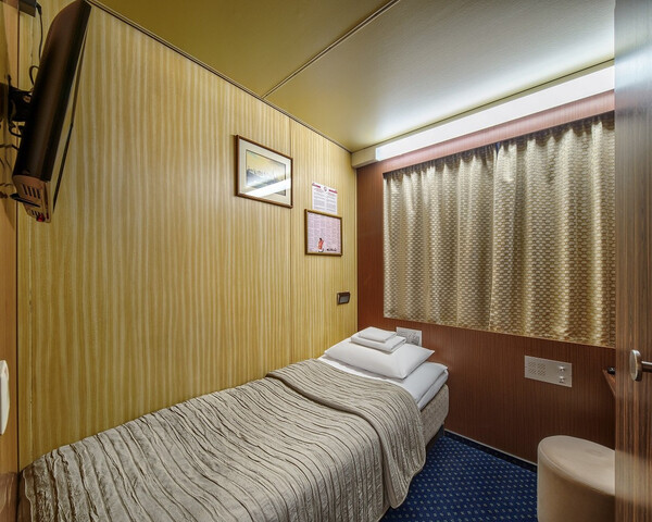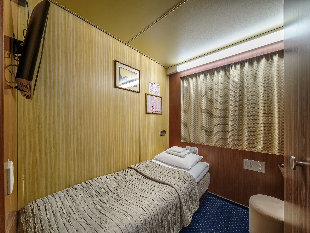 Однокомнатная каюта с удобствами, рассчитанная на размещение одного человека, площадь каюты до 7,9 кв.м. В каюте: одно спальное место, шкаф для одежды, радио, кондиционер, телевизор, холодильник, фен, сейф, душ, санузел, обзорное окно, электророзетка на 220V.Размер кроватей 80х195 см