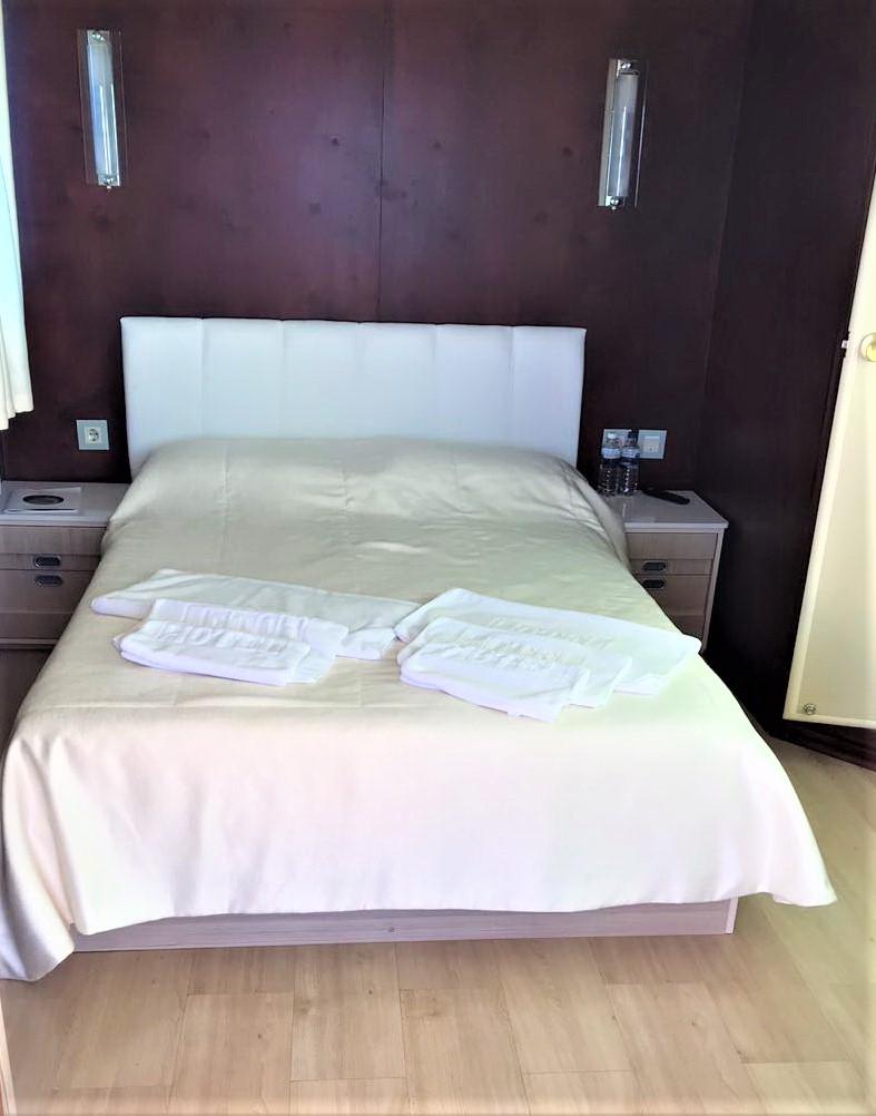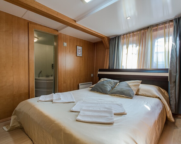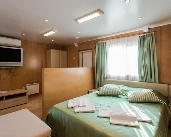 В каюте: одна двуспальная кровать, две прикроватные тумбы, телевизор со встроенным DVD, шкаф для одежды, ванная комната (раковина, душ, туалет) в одной зоне, фен, розетки 220V, прикроватные светильники, телефон (звонки по теплоходу), обогреватель, обзорное окно.
