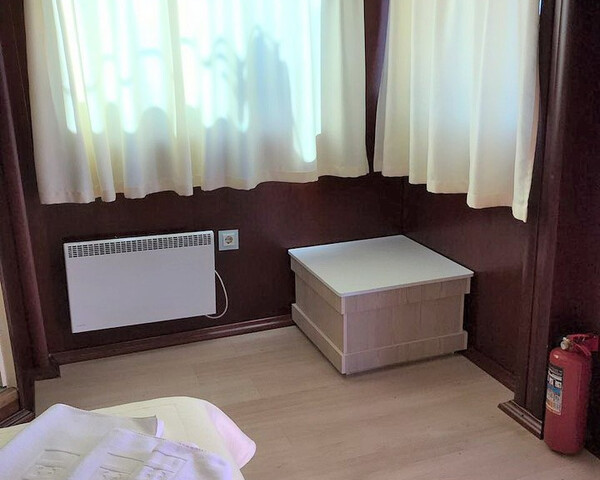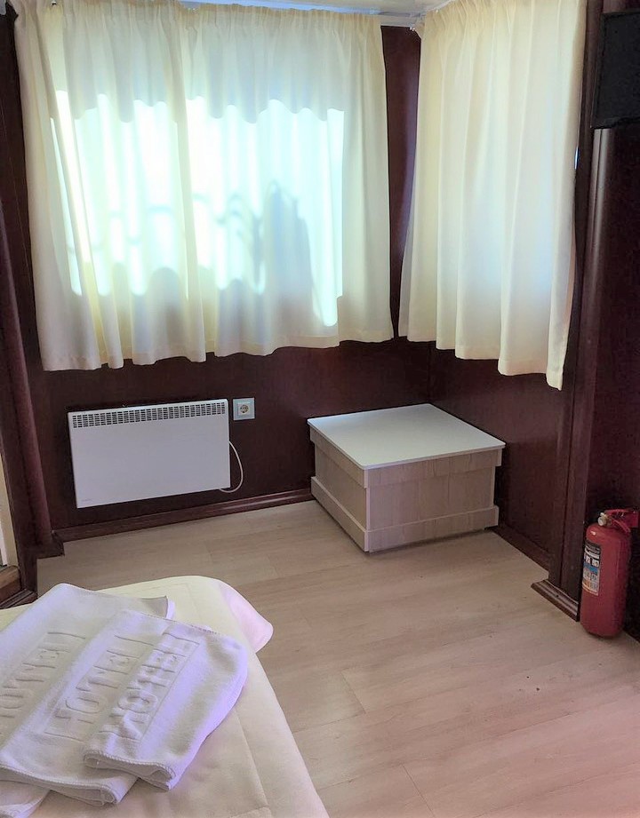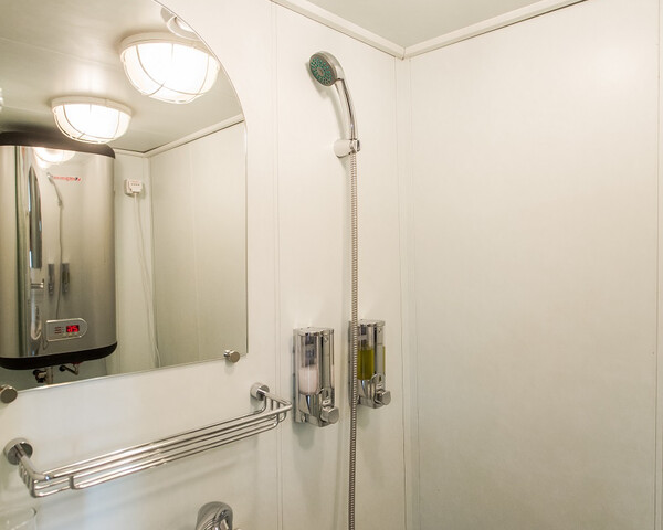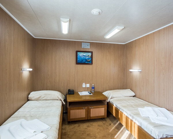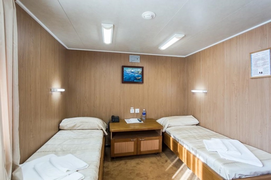 В каюте: две раздельные одноместные кровати (параллельно вдоль стены), прикроватная тумба, телевизор со встроенным DVD, шкаф для одежды, ванная комната (раковина, душ, туалет) в одной зоне, фен, розетки 220V, прикроватные светильники, телефон (звонки по теплоходу), обогреватель, обзорное окно (не открывается).