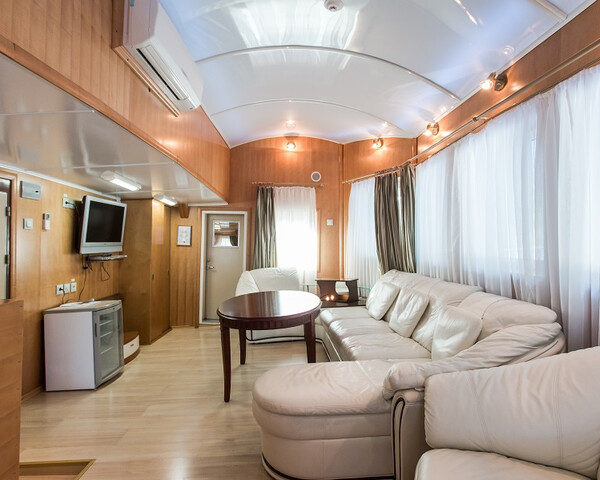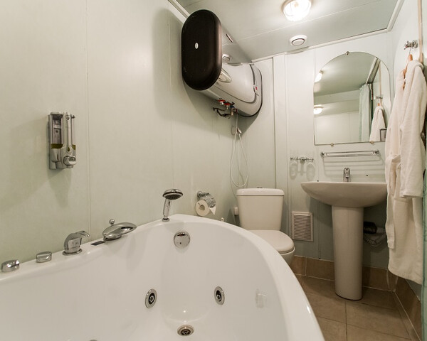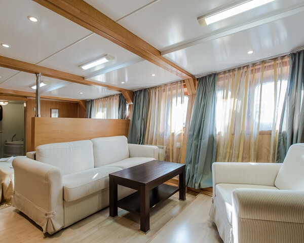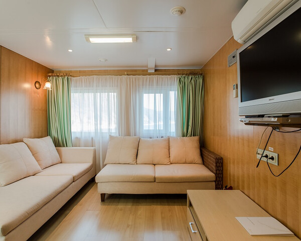 В каюте: двуспальная кровать, шкаф для одежды, диван двухместный, кресло, тумба под ТВ, телевизор, журнальный столик, DVD, ванная комната (джакузи, раковина, туалет), фен, розетки 220V, телефон (звонки по теплоходу), обогреватель, мини-бар, обзорные окна (не открываются).