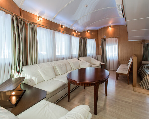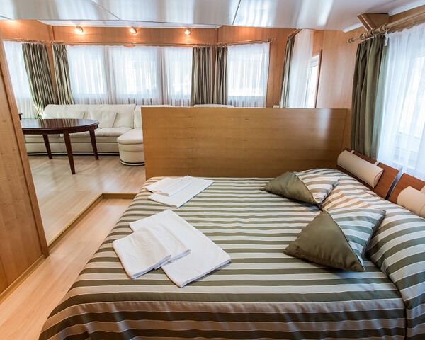 В каюте: двуспальная кровать, прикроватные тумбочки, прикроватные светильники, шкаф для одежды, угловой диван, два кресла, большой круглый стол, стулья, тумба под ТВ, телевизор, журнальный столик, DVD, ванная комната (джакузи, раковина, туалет), фен, розетки 220V телефон (звонки по теплоходу), обогреватель, кондиционер, мини-бар, обзорные окна.
