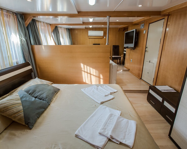 В каюте: двуспальная кровать, две прикроватные тумбочки, шкаф для одежды, диван, кресло, тумба под ТВ, телевизор, DVD, ванная комната (джакузи, раковина, туалет), фен, розетки 220V, телефон (звонки по теплоходу), обогреватель, кондиционер, мини-бар, обзорные окна.