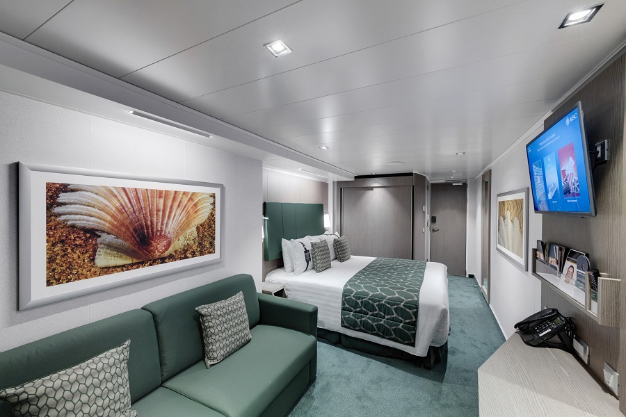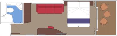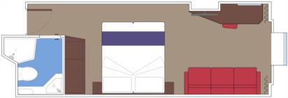 В каюте: две односпальные кровати (при необходимости трансформируются в двуспальную кровать), ванная комната (раковина, душ, туалет), двуспальный раскладной диван, телефон, фен, сейф, кондиционер, интерактивное TV, мини-бар (за дополнительную плату), беспроводной интернет (оплачивается дополнительно), стеклянная балконная дверь-окно, персональный балкон с мебелью для отдыха.