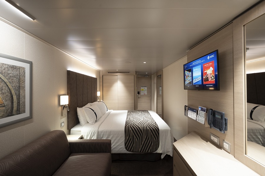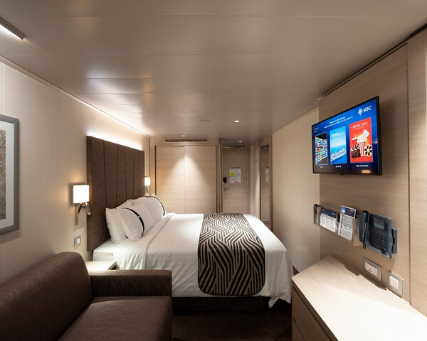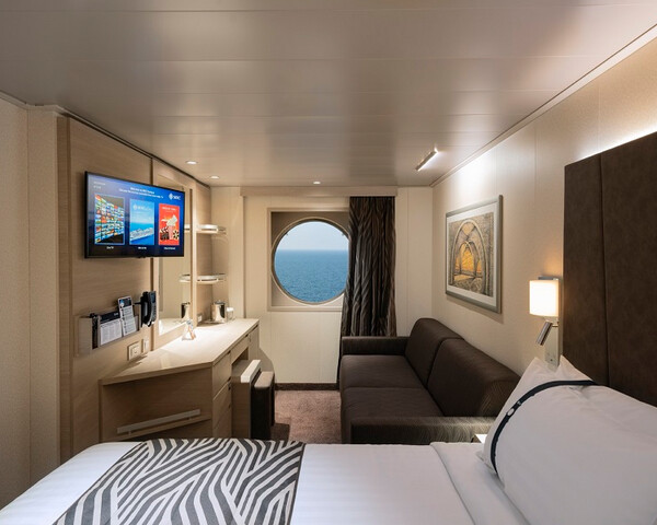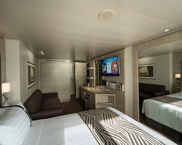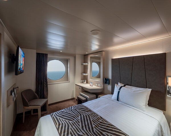 В каюте: две односпальные кровати (при необходимости трансформируются в двуспальную кровать), ванная комната (раковина, душ, туалет), телефон, фен, мини-бар, сейф, кондиционер, интерактивное TV, беспроводной интернет (оплачивается дополнительно), обзорное окно (не открывается).