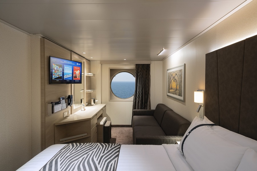В каюте: одна двуспальная кровать (при необходимости трансформируются в две односпальные), ванная комната (раковина, душ, туалет), телефон, фен, мини-бар, сейф, кондиционер, интерактивное TV, беспроводной интернет (оплачивается дополнительно), обзорное окно (не открывается).