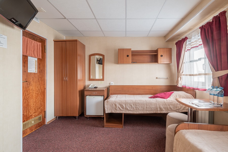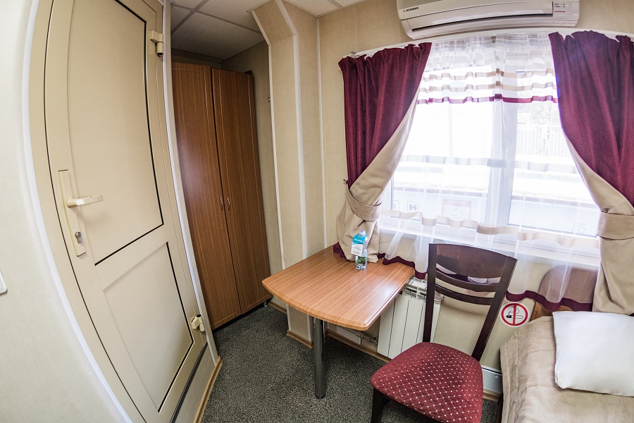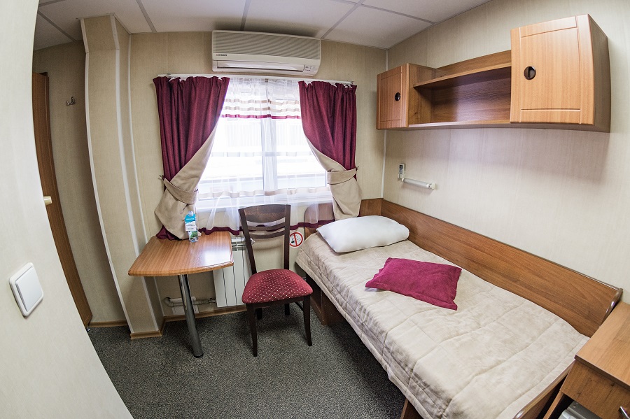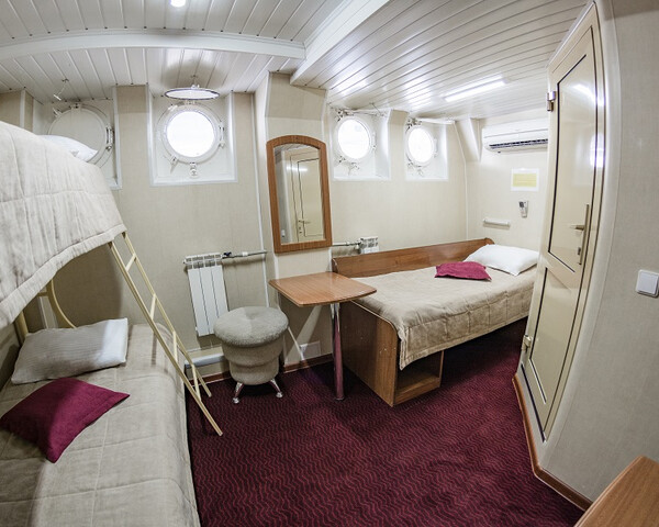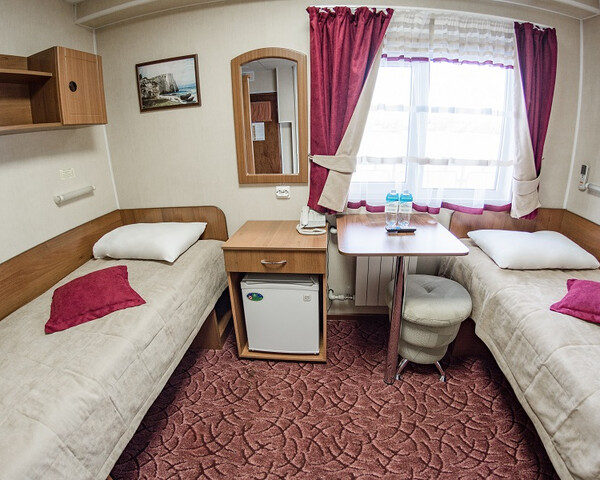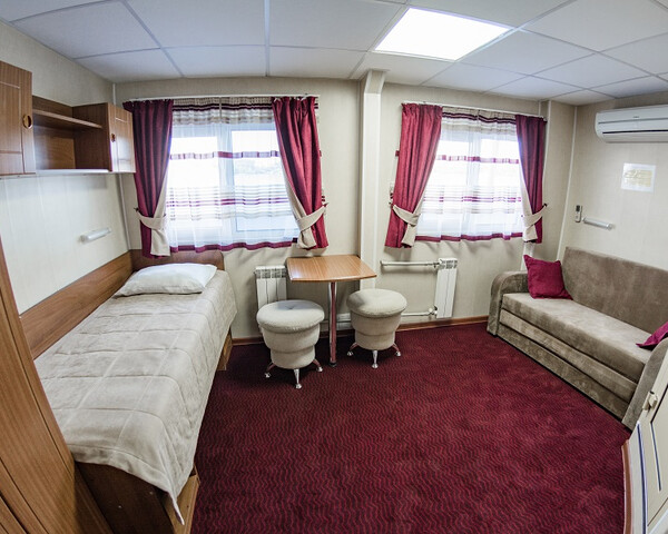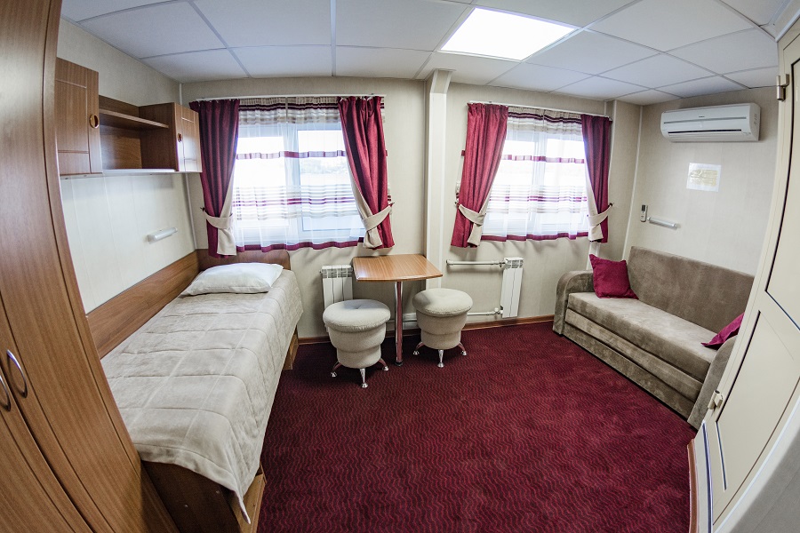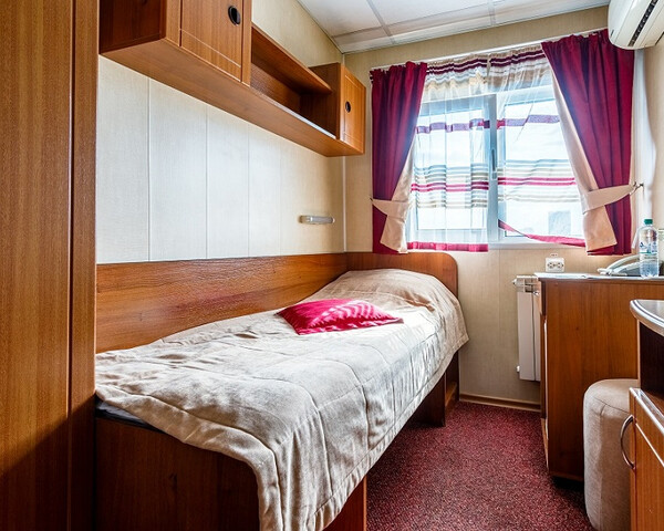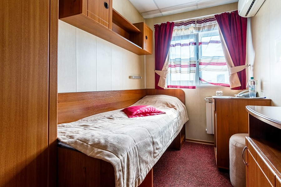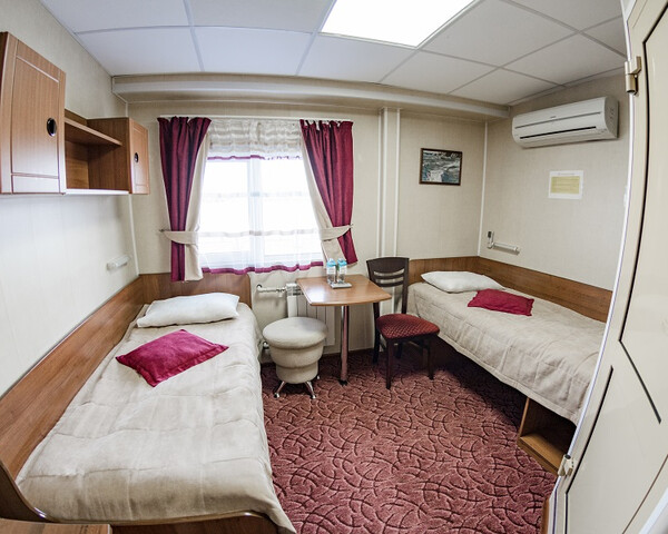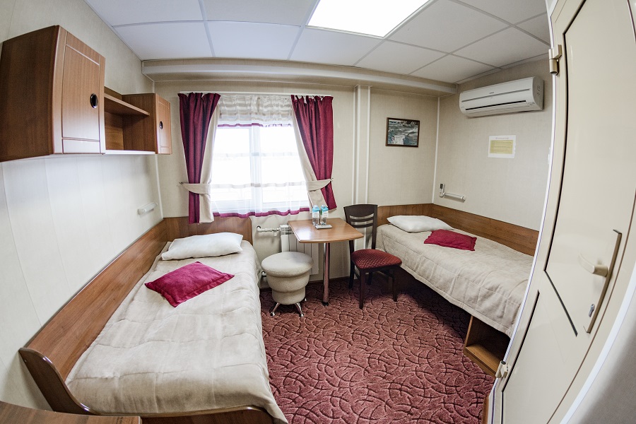 В каюте: двуспальная кровать (при необходимости трансформируется в две односпальные кровати) и кресло-кровать (1 спальное место), ванная комната (раковина, душевая кабина, туалет), шкаф, прикроватные тумбы, кресло, туалетный стол, книжная полка, вешалка для верхней одежды, телевизор с кабельным и спутниковым вещанием, холодильник, кондиционер, сейф, телефон внутренней связи, розетки 220 V, фен, плед для каждого туриста, обзорные окна.Также к услугам туристов в каютах: косметика для душа, туалетные принадлежности, щетка для одежды, банные халаты, маски для сна, тапочки, набор посуды и столовых приборов, чайная пара, питьевая вода и «приветственный набор» (игристый напиток, фрукты), кофе/чай, мини-бар (за дополнительную плату), капсульная кофемашина (одна чашка кофе на человека – в подарок).