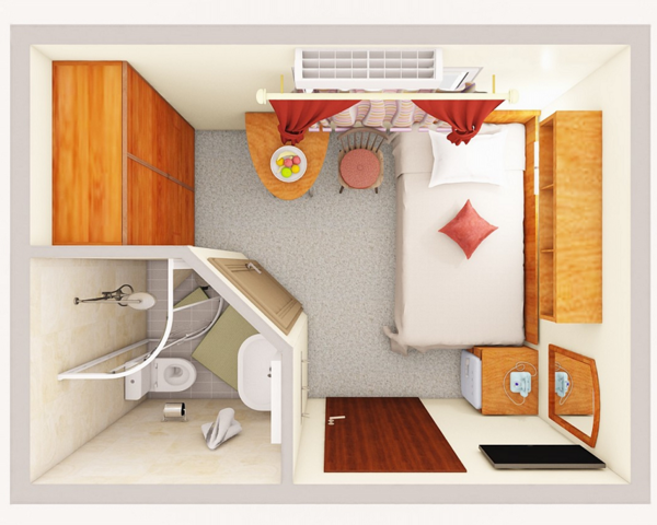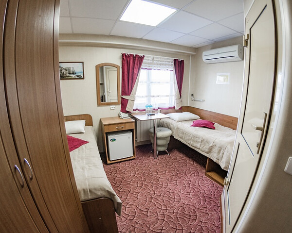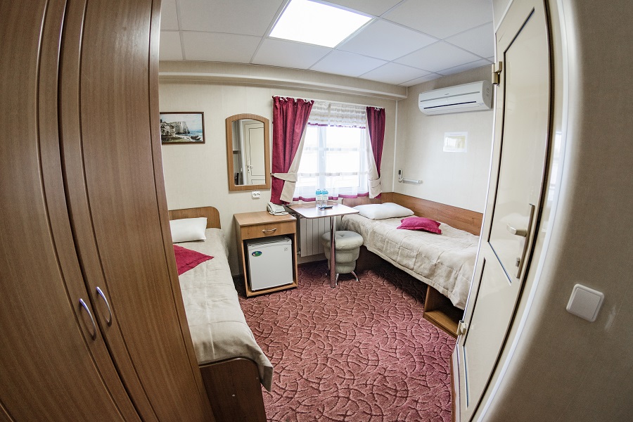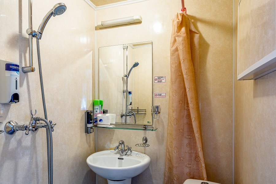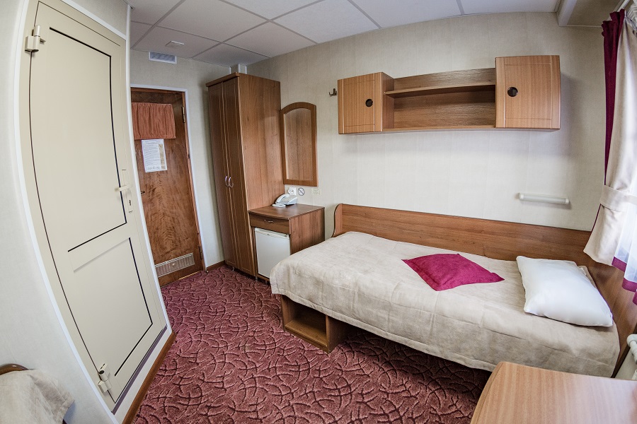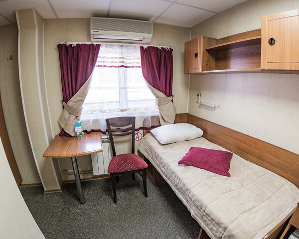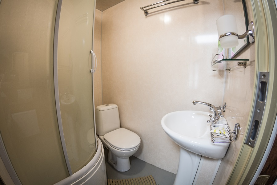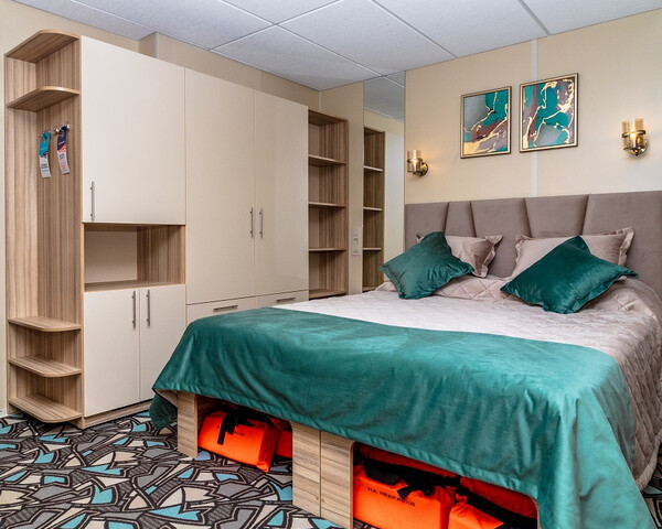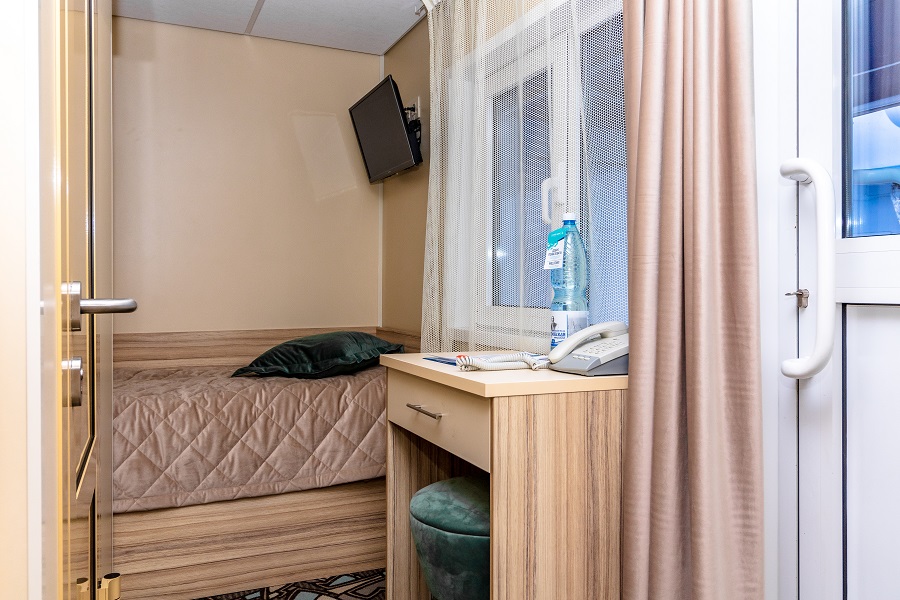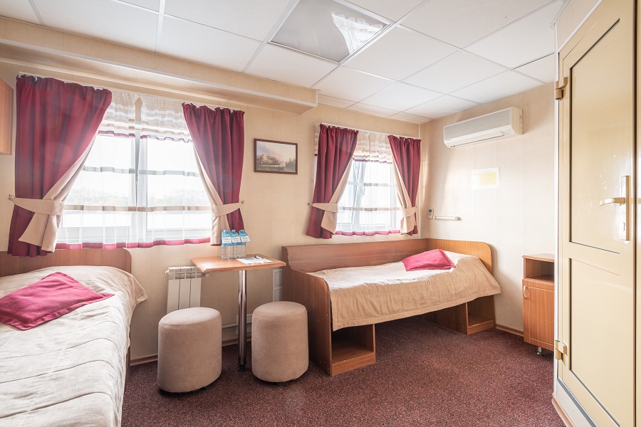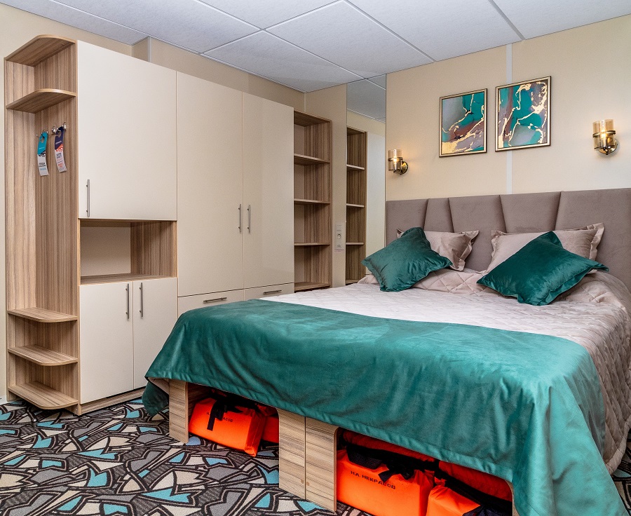 В каюте: двуспальная кровать (при необходимости трансформируется в две односпальные кровати) и кресло-кровать (1 спальное место), ванная комната (раковина, душевая кабина, туалет), шкаф, прикроватные тумбы, кресло, туалетный стол, книжная полка, вешалка для верхней одежды, телевизор с кабельным и спутниковым вещанием, холодильник, кондиционер, сейф, телефон внутренней связи, розетки 220 V, фен, плед для каждого туриста, обзорные окна.Также к услугам туристов в каютах: косметика для душа, туалетные принадлежности, щетка для одежды, банные халаты, маски для сна, тапочки, набор посуды и столовых приборов, чайная пара, питьевая вода и «приветственный набор» (игристый напиток, фрукты), кофе/чай, мини-бар (за дополнительную плату), капсульная кофемашина (одна чашка кофе на человека – в подарок).