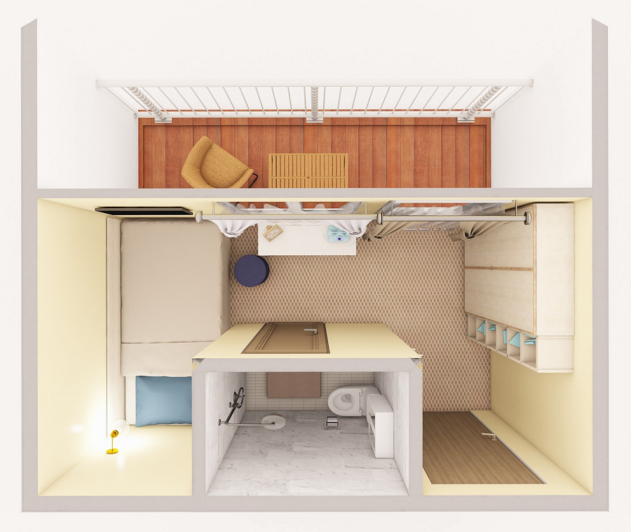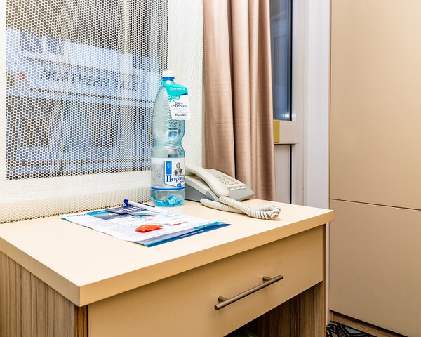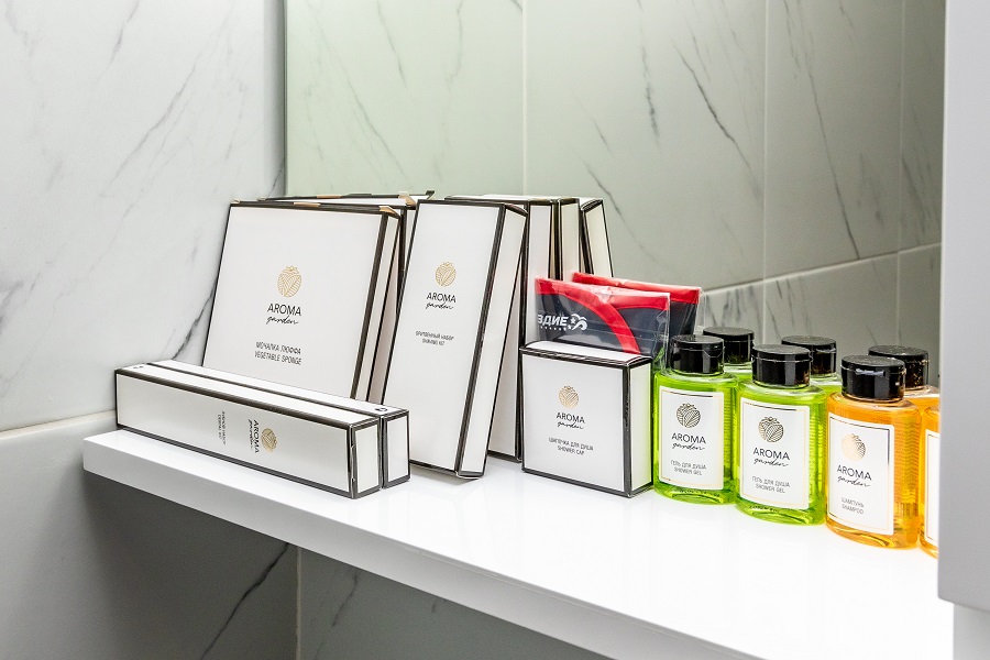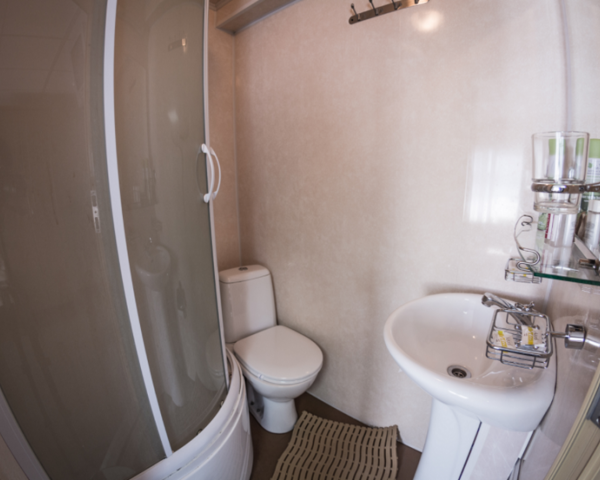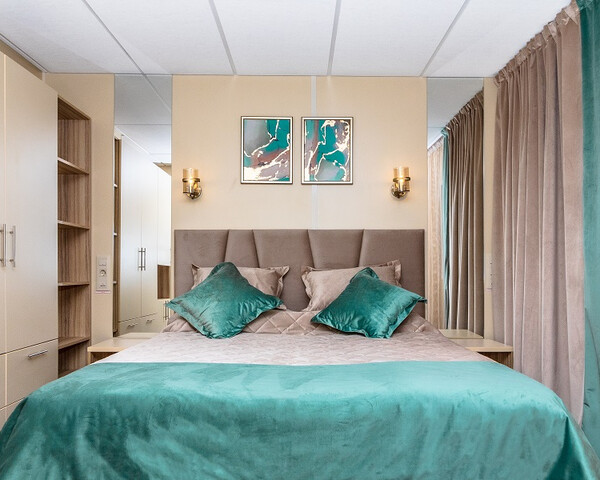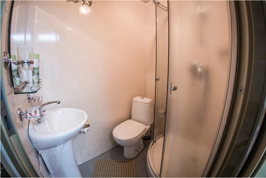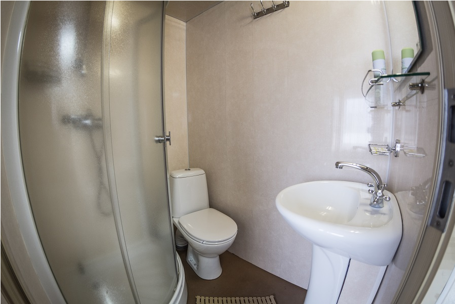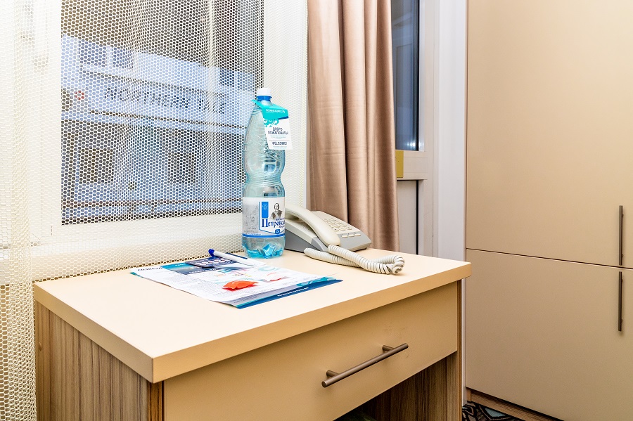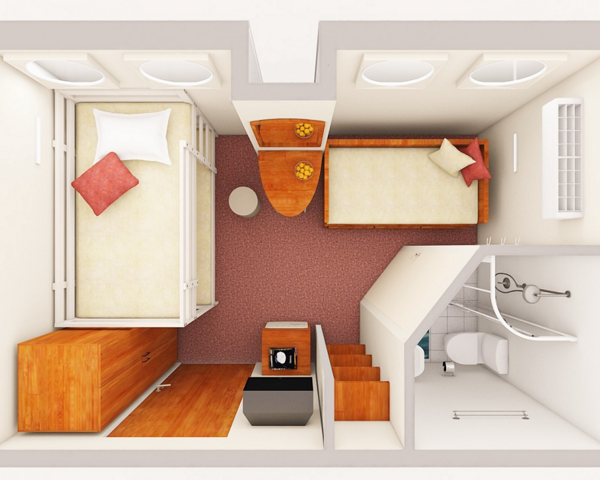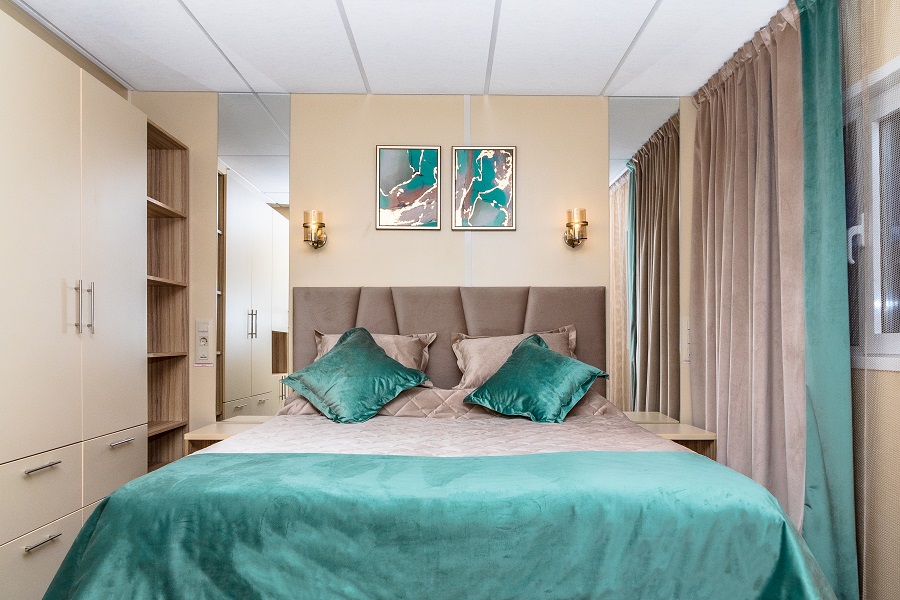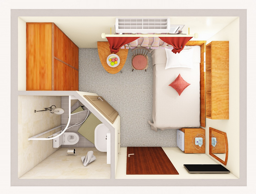 В каюте: двуспальная кровать (при необходимости трансформируется в две односпальные кровати) и кресло-кровать (1 спальное место), ванная комната (раковина, душевая кабина, туалет), шкаф, прикроватные тумбы, кресло, туалетный стол, книжная полка, вешалка для верхней одежды, телевизор с кабельным и спутниковым вещанием, холодильник, кондиционер, сейф, телефон внутренней связи, розетки 220 V, фен, плед для каждого туриста, обзорные окна.Также к услугам туристов в каютах: косметика для душа, туалетные принадлежности, щетка для одежды, банные халаты, маски для сна, тапочки, набор посуды и столовых приборов, чайная пара, питьевая вода и «приветственный набор» (игристый напиток, фрукты), кофе/чай, мини-бар (за дополнительную плату), капсульная кофемашина (одна чашка кофе на человека – в подарок).