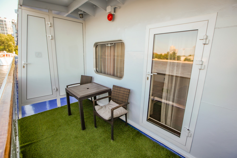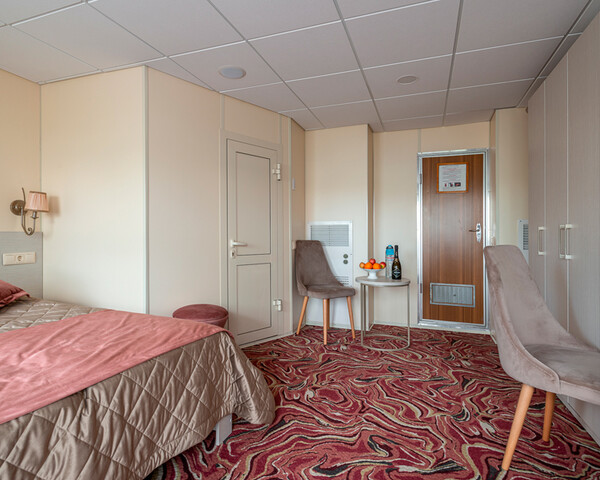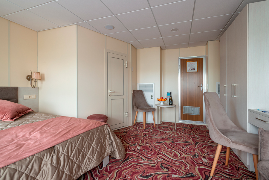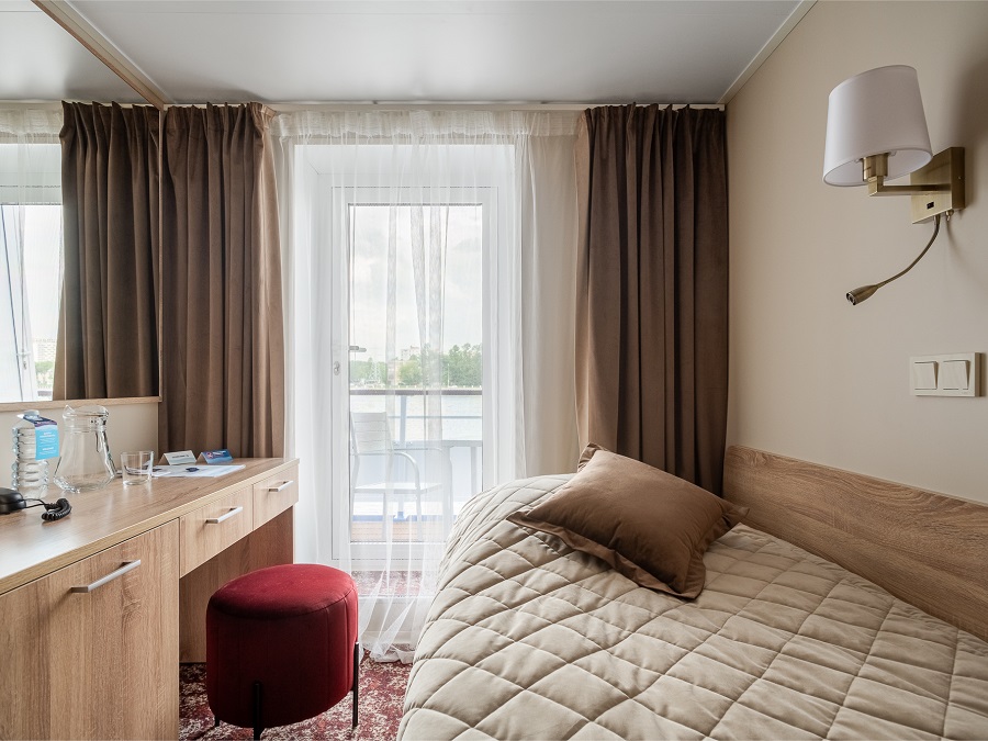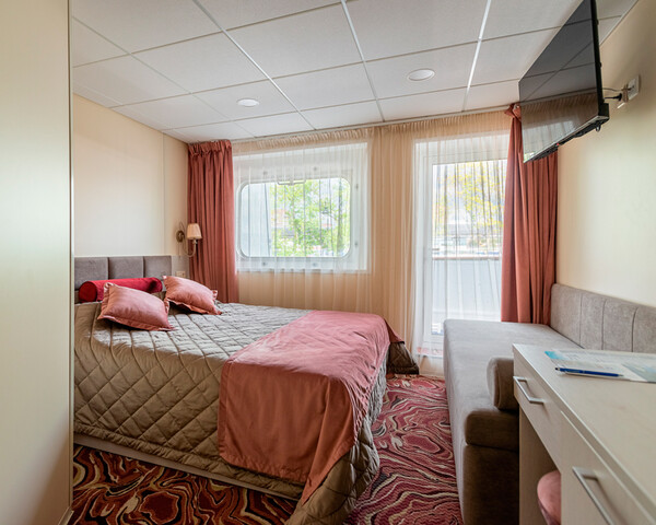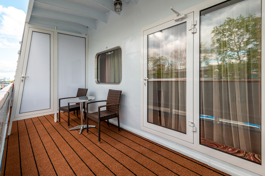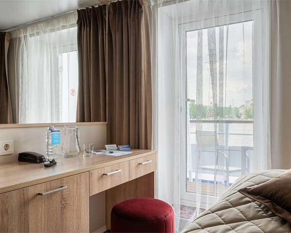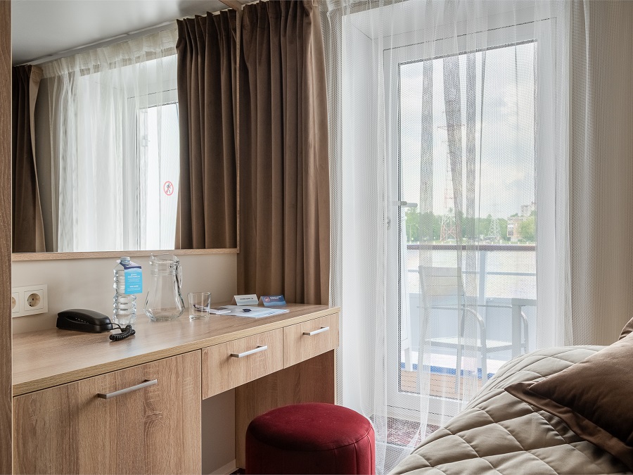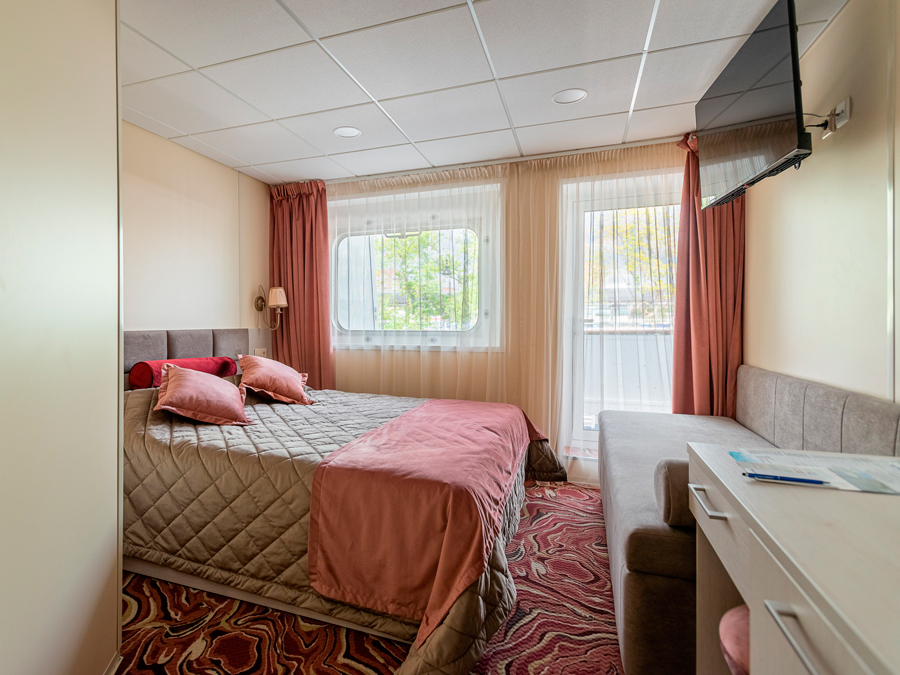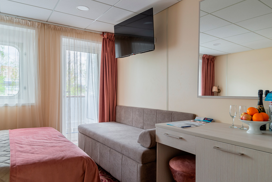 В каюте: одна двуспальная кровать (при необходимости трансформируется в две односпальные кровати), двуспальный диван, ванная комната (раковина, душевая кабина, туалет), шкаф, прикроватные тумбы, туалетный стол, пуф/кресло, вешалка для верхней одежды, холодильник, кондиционер, радио, плед для каждого туриста, сейф, фен, телевизор с кабельным и спутниковым вещанием, щетка для одежды, розетки 220 V, обзорное окно, персональный балкон с мебелью для отдыха.Также к услугам туристов в каюте: косметика для душа, банные халаты, маски для сна, тапочки, чайная пара, набор посуды и столовых приборов, питьевая вода и «приветственный набор» (игристый напиток, фрукты), мини-бар (за дополнительную плату), капсульная кофемашина (одна чашка кофе на человека – в подарок).