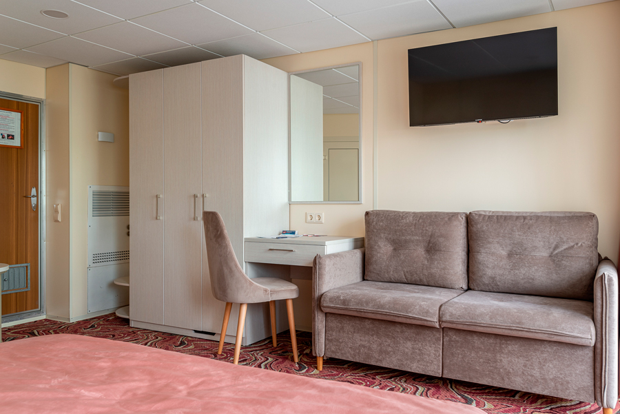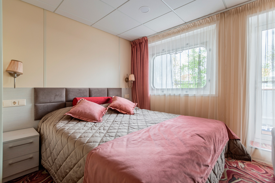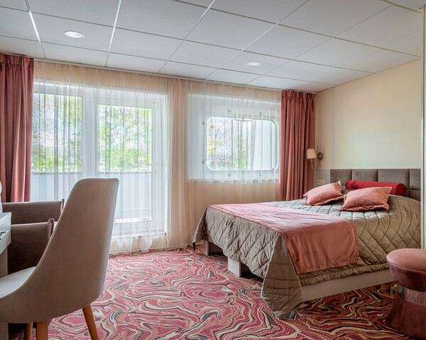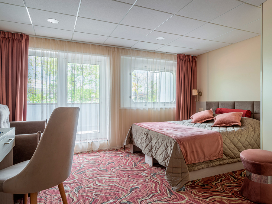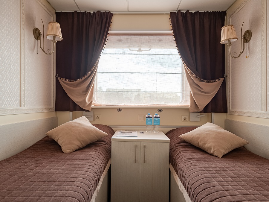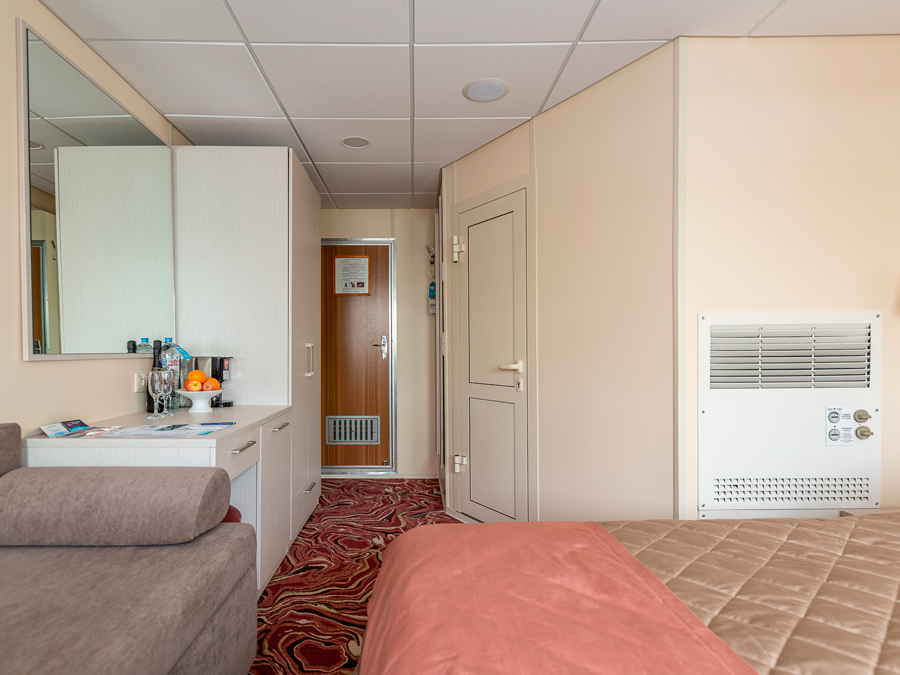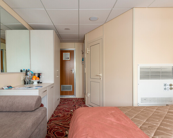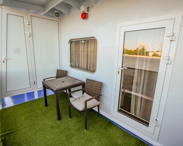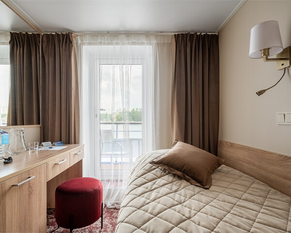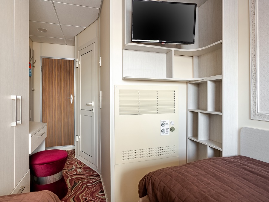 В каюте: одна двуспальная кровать (при необходимости трансформируется в две односпальные кровати), двуспальный диван, ванная комната (раковина, душевая кабина, туалет), шкаф, прикроватные тумбы, туалетный стол, пуф/кресло, вешалка для верхней одежды, холодильник, кондиционер, радио, плед для каждого туриста, сейф, фен, телевизор с кабельным и спутниковым вещанием, щетка для одежды, розетки 220 V, обзорное окно, персональный балкон с мебелью для отдыха.Также к услугам туристов в каюте: косметика для душа, банные халаты, маски для сна, тапочки, чайная пара, набор посуды и столовых приборов, питьевая вода и «приветственный набор» (игристый напиток, фрукты), мини-бар (за дополнительную плату), капсульная кофемашина (одна чашка кофе на человека – в подарок).