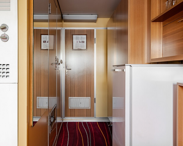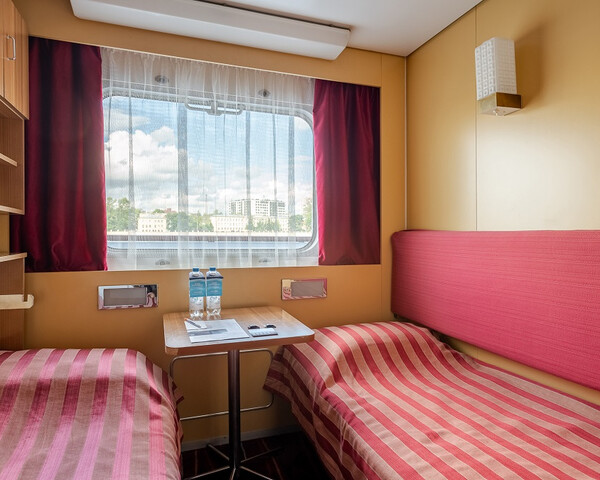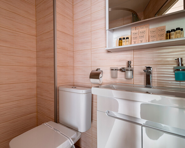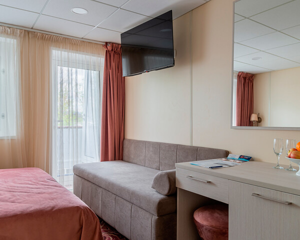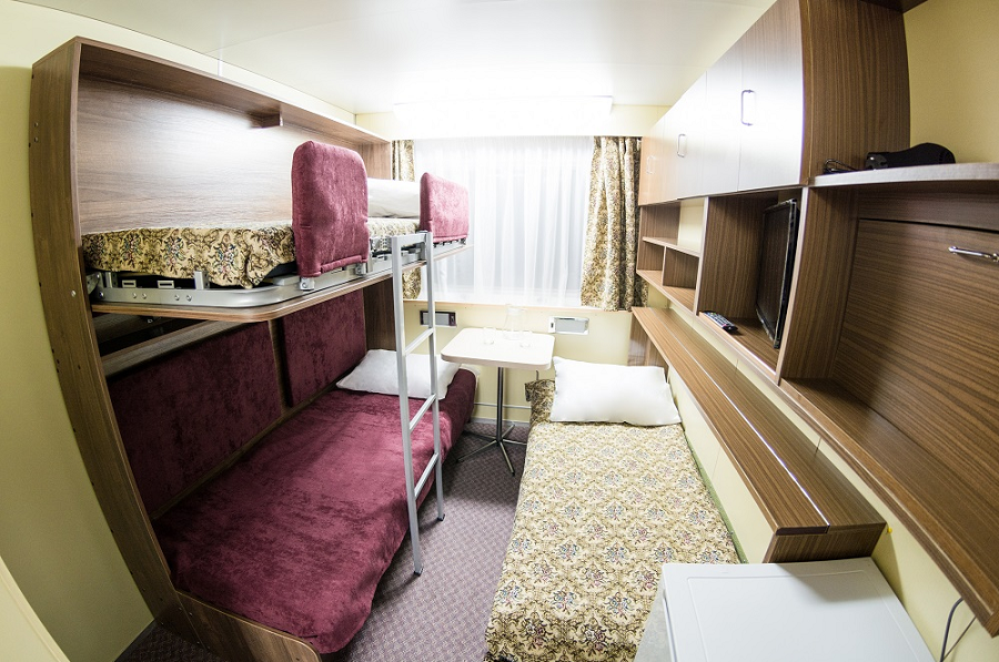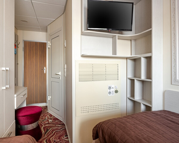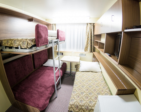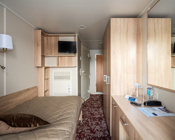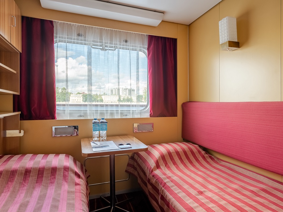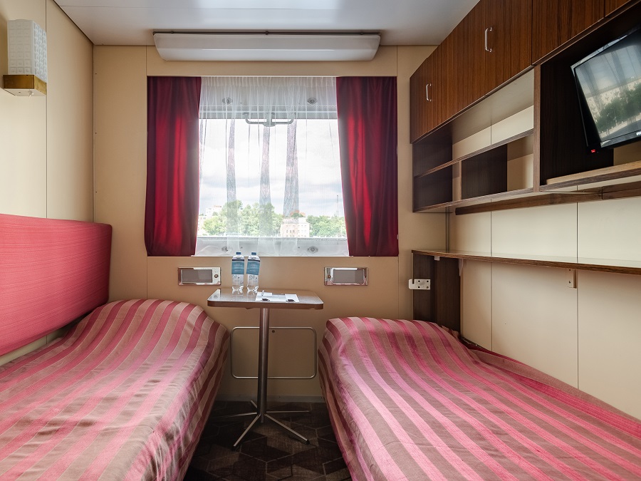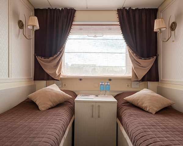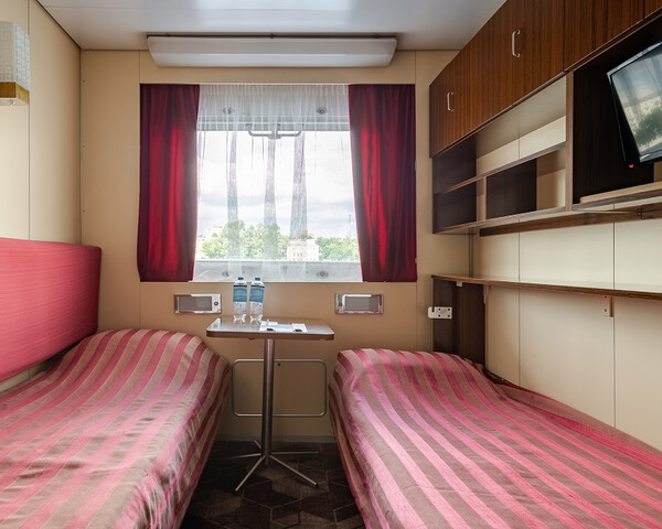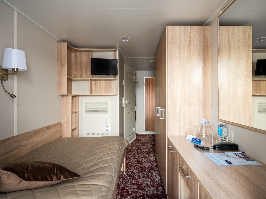 В каюте: одна двуспальная кровать (при необходимости трансформируется в две односпальные кровати), двуспальный диван, ванная комната (раковина, душевая кабина, туалет), шкаф, прикроватные тумбы, туалетный стол, пуф/кресло, вешалка для верхней одежды, холодильник, кондиционер, радио, плед для каждого туриста, сейф, фен, телевизор с кабельным и спутниковым вещанием, щетка для одежды, розетки 220 V, обзорное окно, персональный балкон с мебелью для отдыха.Также к услугам туристов в каюте: косметика для душа, банные халаты, маски для сна, тапочки, чайная пара, набор посуды и столовых приборов, питьевая вода и «приветственный набор» (игристый напиток, фрукты), мини-бар (за дополнительную плату), капсульная кофемашина (одна чашка кофе на человека – в подарок).