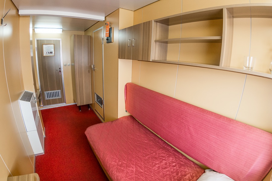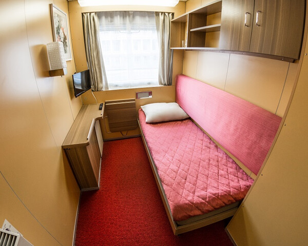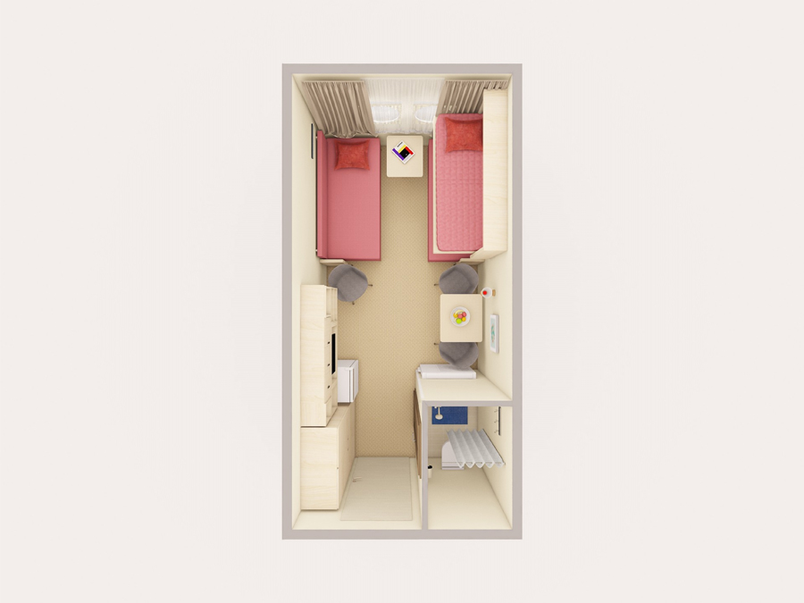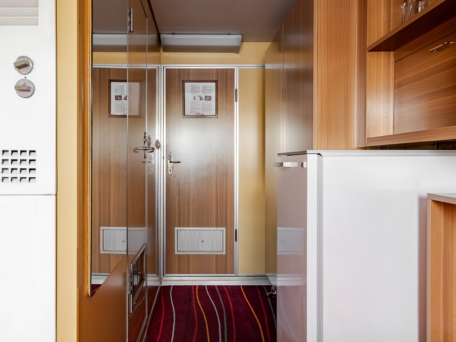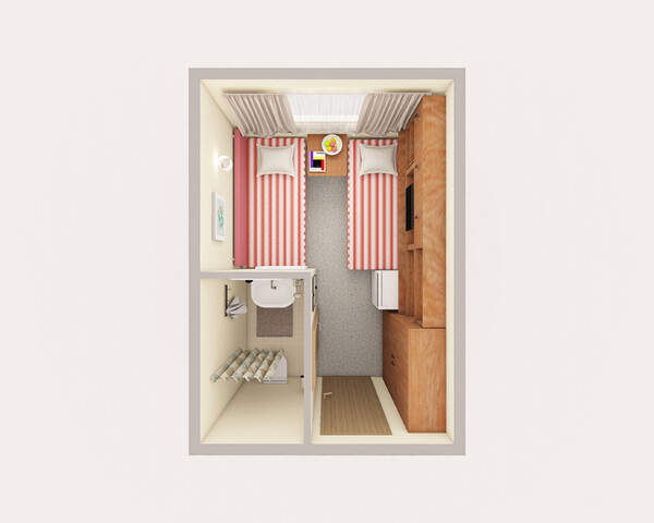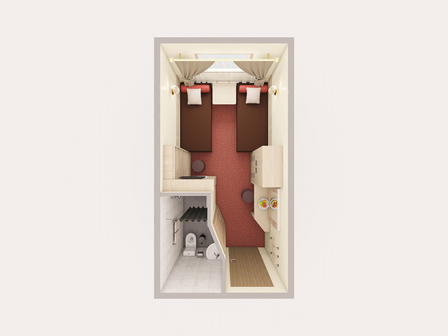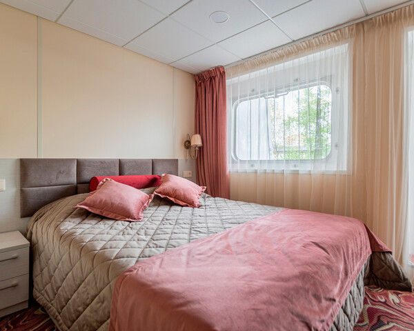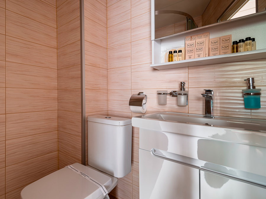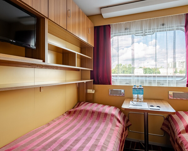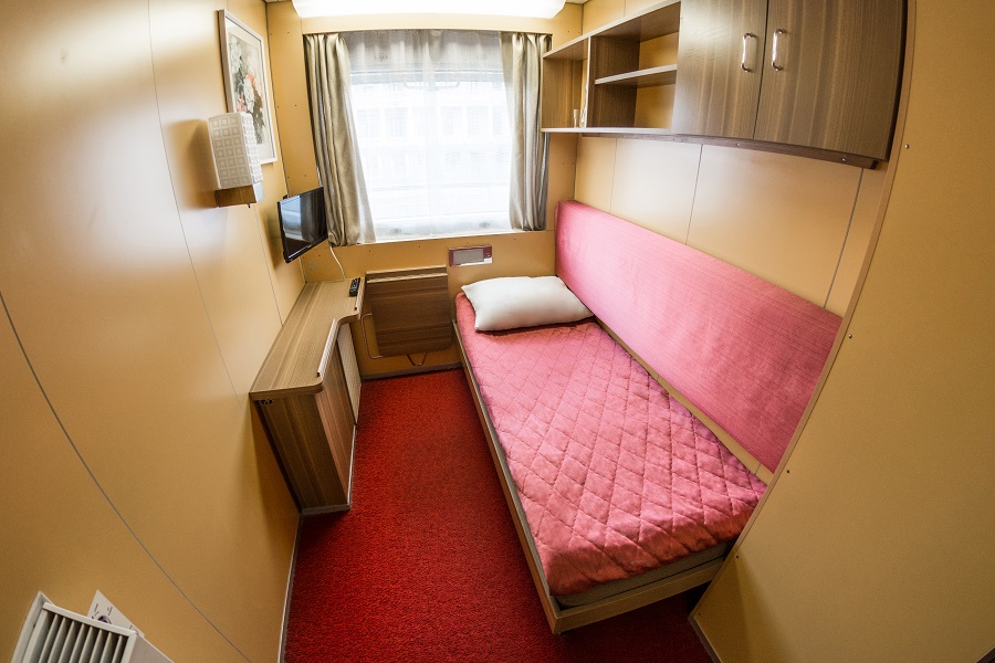 В каюте: одна двуспальная кровать (при необходимости трансформируется в две односпальные кровати), двуспальный диван, ванная комната (раковина, душевая кабина, туалет), шкаф, прикроватные тумбы, туалетный стол, пуф/кресло, вешалка для верхней одежды, холодильник, кондиционер, радио, плед для каждого туриста, сейф, фен, телевизор с кабельным и спутниковым вещанием, щетка для одежды, розетки 220 V, обзорное окно, персональный балкон с мебелью для отдыха.Также к услугам туристов в каюте: косметика для душа, банные халаты, маски для сна, тапочки, чайная пара, набор посуды и столовых приборов, питьевая вода и «приветственный набор» (игристый напиток, фрукты), мини-бар (за дополнительную плату), капсульная кофемашина (одна чашка кофе на человека – в подарок).