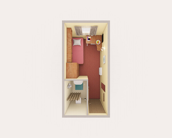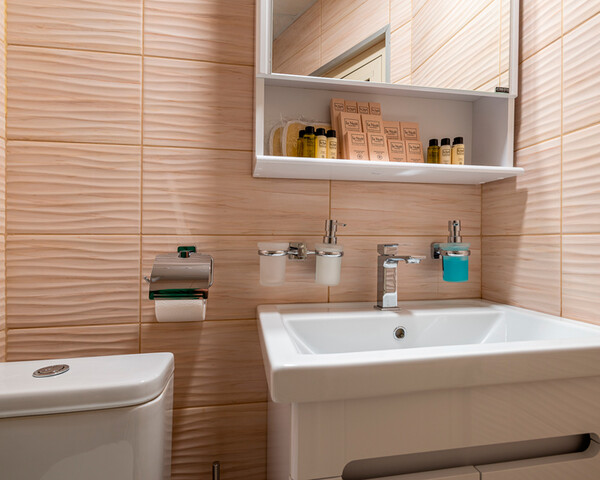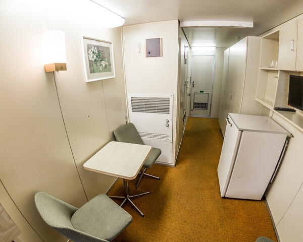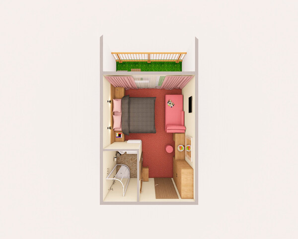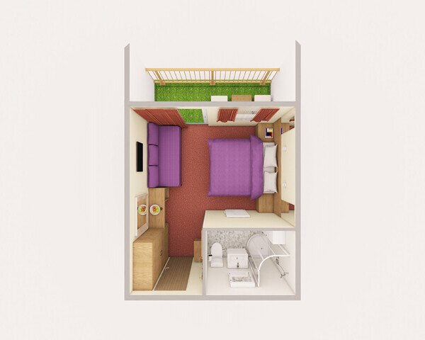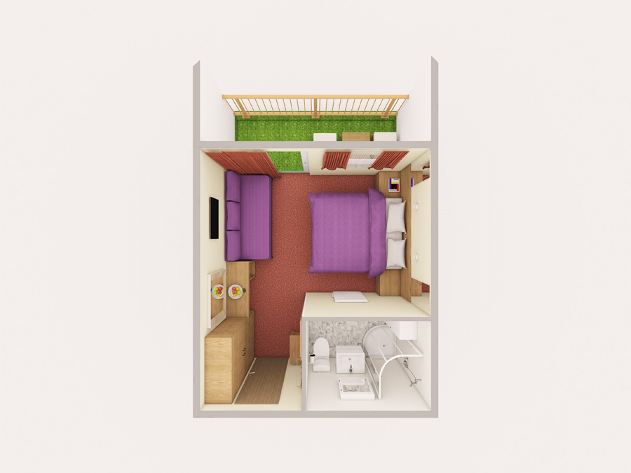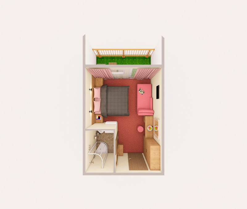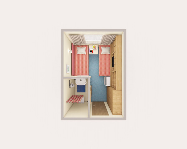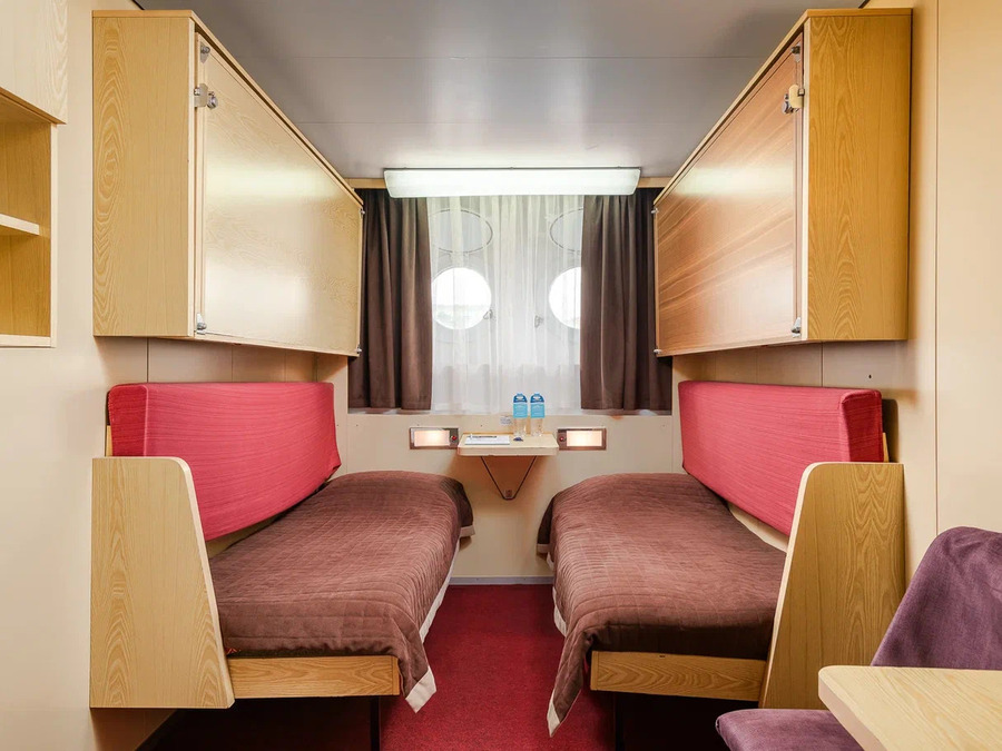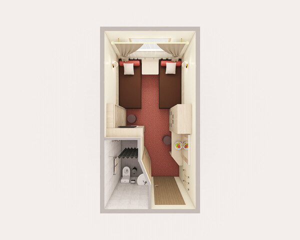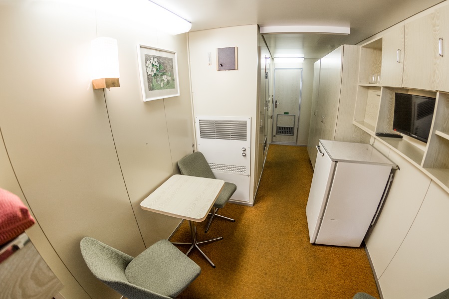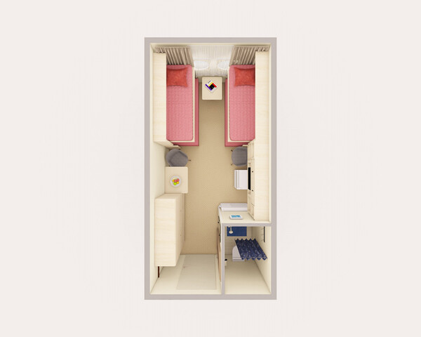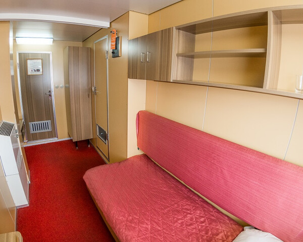 В каюте: одна двуспальная кровать (при необходимости трансформируется в две односпальные кровати), двуспальный диван, ванная комната (раковина, душевая кабина, туалет), шкаф, прикроватные тумбы, туалетный стол, пуф/кресло, вешалка для верхней одежды, холодильник, кондиционер, радио, плед для каждого туриста, сейф, фен, телевизор с кабельным и спутниковым вещанием, щетка для одежды, розетки 220 V, обзорное окно, персональный балкон с мебелью для отдыха.Также к услугам туристов в каюте: косметика для душа, банные халаты, маски для сна, тапочки, чайная пара, набор посуды и столовых приборов, питьевая вода и «приветственный набор» (игристый напиток, фрукты), мини-бар (за дополнительную плату), капсульная кофемашина (одна чашка кофе на человека – в подарок).