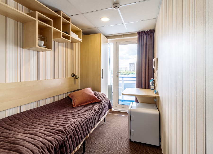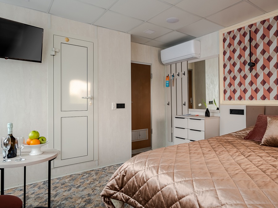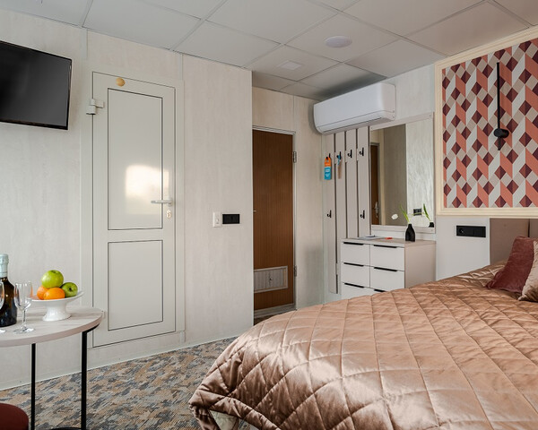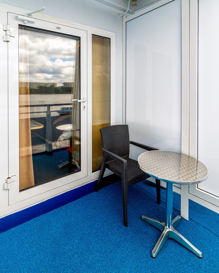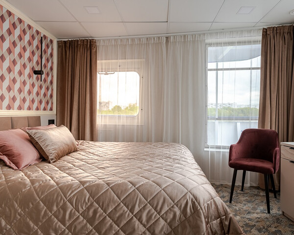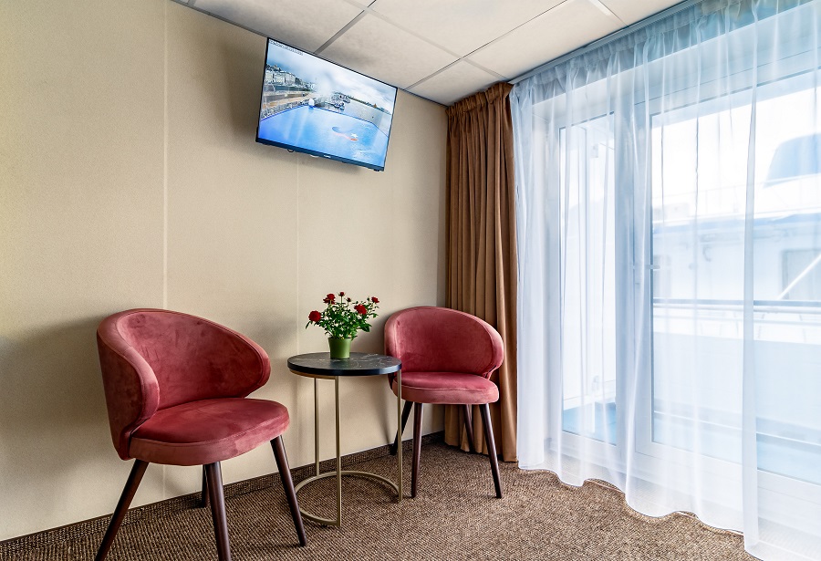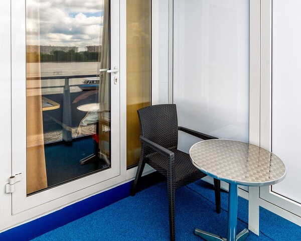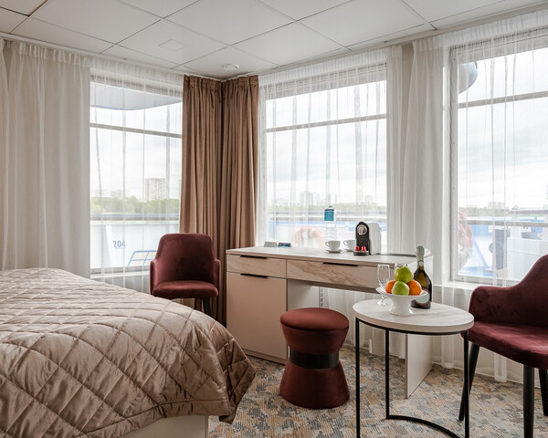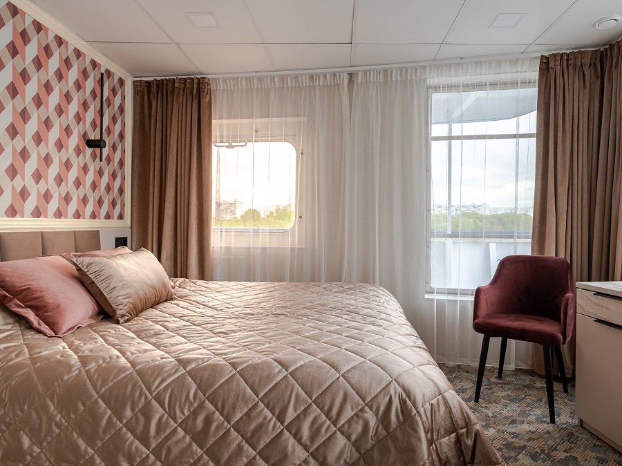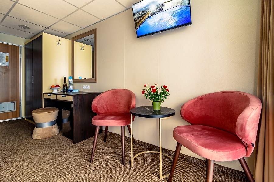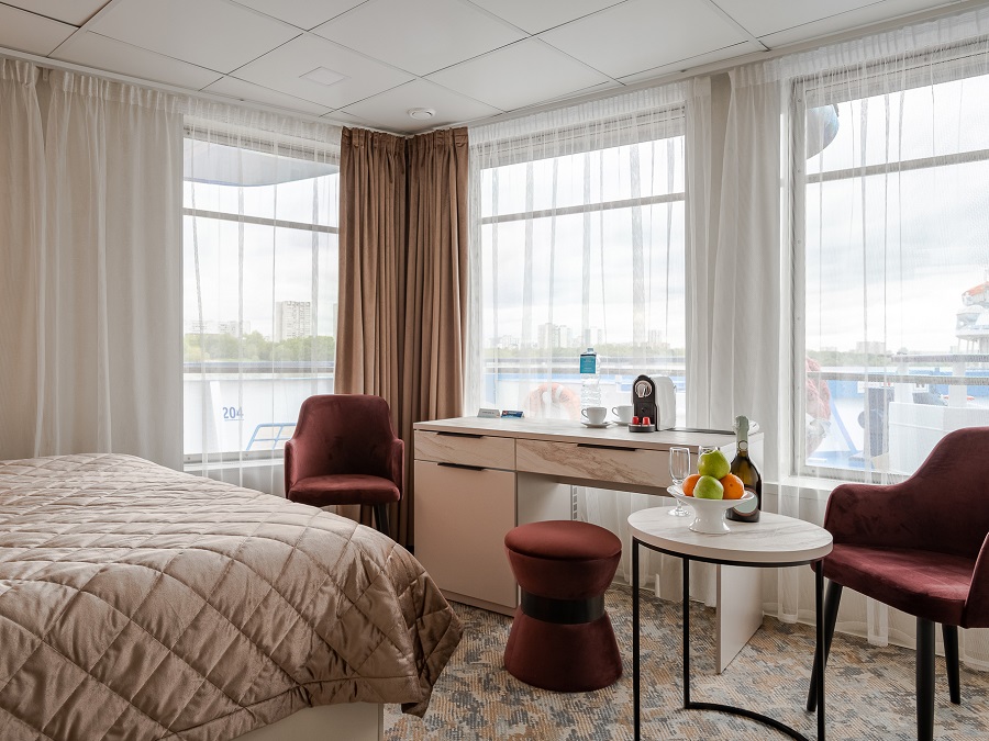 В каютах 404, 405, 420: одна двуспальная кровать (при необходимости трансформируется в две односпальные кровати), двуспальный диван, ванная комната (раковина, душевая кабина, туалет), прикроватные тумбы, пуф, стол, зеркало, кресло, стол журнальный, вешалка для верхней одежды, холодильник, кондиционер, сейф, радио, шкаф, фен, плед для каждого туриста, телевизор с кабельным и спутниковым вещанием, розетки 220 V, обзорное окно, стеклянная балконная дверь, персональный балкон с мебелью для отдыха. В каютах 408, 409, 412, 416, 417: одна двуспальная кровать (при необходимости трансформируется в две односпальные кровати), односпальный диван, ванная комната (раковина, душевая кабина, туалет), прикроватные тумбы, пуф, стол, зеркало, шкаф, стол журнальный, 2 кресла, вешалка для верхней одежды, холодильник, кондиционер, радио, сейф, фен, плед для каждого туриста, телевизор с кабельным и спутниковым вещанием, розетки 220 V, обзорное окно, стеклянная балконная дверь, персональный балкон с мебелью для отдыха. В каютах 421, 422: одна двуспальная кровать (при необходимости трансформируется в две односпальные кровати), ванная комната (раковина, душевая кабина, туалет), прикроватные тумбы, пуф, стол, зеркало, шкаф, стол журнальный, 2 кресла, вешалка для верхней одежды, холодильник, кондиционер, радио, сейф, фен, плед для каждого туриста, телевизор с кабельным и спутниковым вещанием, розетки 220 V, обзорное окно, стеклянная балконная дверь, персональный балкон с мебелью для отдыха. Также к услугам туристов в каюте: косметика для душа, туалетные принадлежности, щетка для одежды, банные халаты, маски для сна, тапочки, набор посуды и столовых приборов, чайная пара, питьевая вода, приветственный набор (игристый напиток, фрукты), капсульная кофемашина (одна чашка кофе на человека – в подарок), мини-бар (за дополнительную плату).