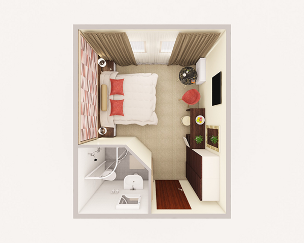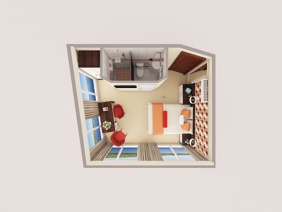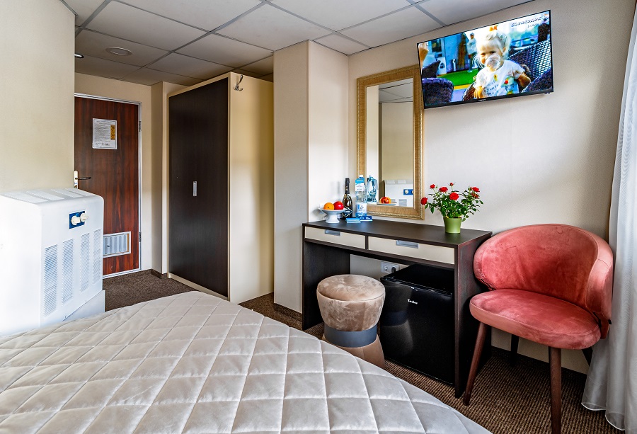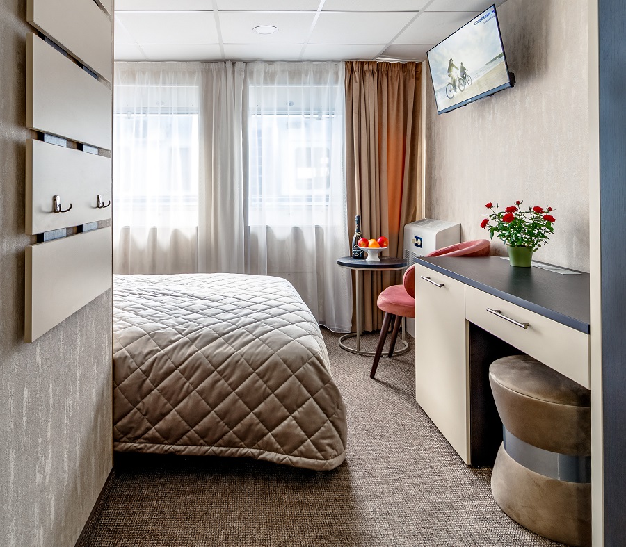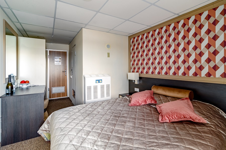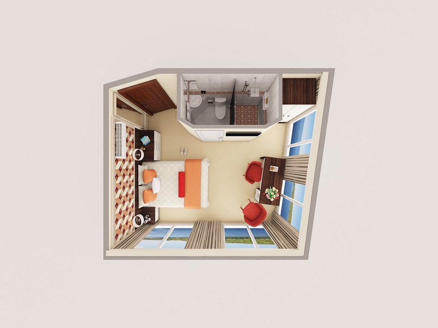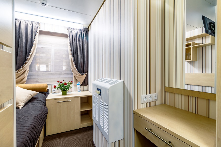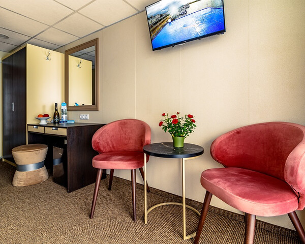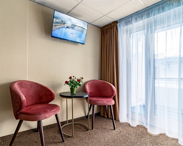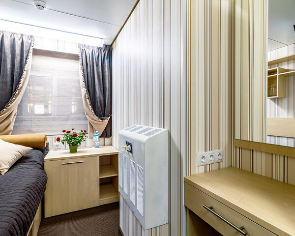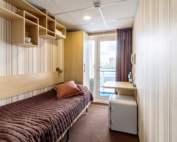 В каютах 404, 405, 420: одна двуспальная кровать (при необходимости трансформируется в две односпальные кровати), двуспальный диван, ванная комната (раковина, душевая кабина, туалет), прикроватные тумбы, пуф, стол, зеркало, кресло, стол журнальный, вешалка для верхней одежды, холодильник, кондиционер, сейф, радио, шкаф, фен, плед для каждого туриста, телевизор с кабельным и спутниковым вещанием, розетки 220 V, обзорное окно, стеклянная балконная дверь, персональный балкон с мебелью для отдыха. В каютах 408, 409, 412, 416, 417: одна двуспальная кровать (при необходимости трансформируется в две односпальные кровати), односпальный диван, ванная комната (раковина, душевая кабина, туалет), прикроватные тумбы, пуф, стол, зеркало, шкаф, стол журнальный, 2 кресла, вешалка для верхней одежды, холодильник, кондиционер, радио, сейф, фен, плед для каждого туриста, телевизор с кабельным и спутниковым вещанием, розетки 220 V, обзорное окно, стеклянная балконная дверь, персональный балкон с мебелью для отдыха. В каютах 421, 422: одна двуспальная кровать (при необходимости трансформируется в две односпальные кровати), ванная комната (раковина, душевая кабина, туалет), прикроватные тумбы, пуф, стол, зеркало, шкаф, стол журнальный, 2 кресла, вешалка для верхней одежды, холодильник, кондиционер, радио, сейф, фен, плед для каждого туриста, телевизор с кабельным и спутниковым вещанием, розетки 220 V, обзорное окно, стеклянная балконная дверь, персональный балкон с мебелью для отдыха. Также к услугам туристов в каюте: косметика для душа, туалетные принадлежности, щетка для одежды, банные халаты, маски для сна, тапочки, набор посуды и столовых приборов, чайная пара, питьевая вода, приветственный набор (игристый напиток, фрукты), капсульная кофемашина (одна чашка кофе на человека – в подарок), мини-бар (за дополнительную плату).