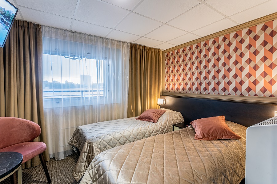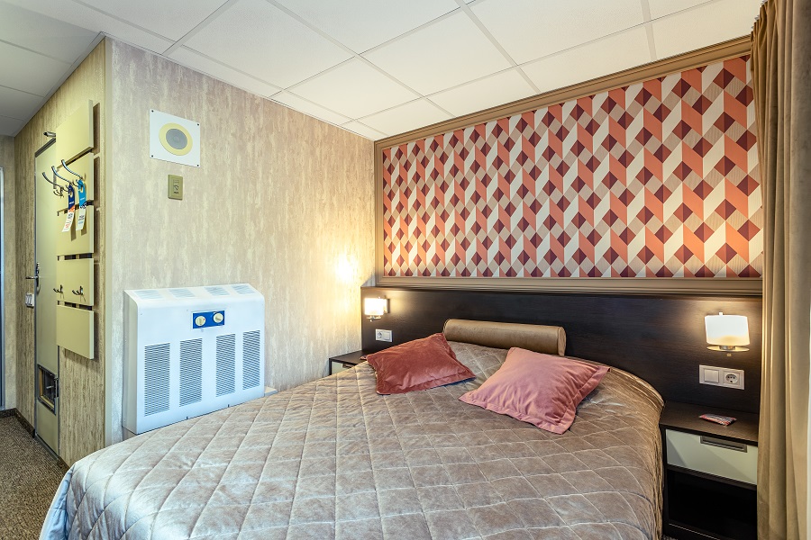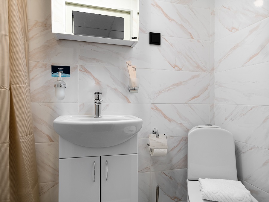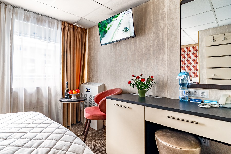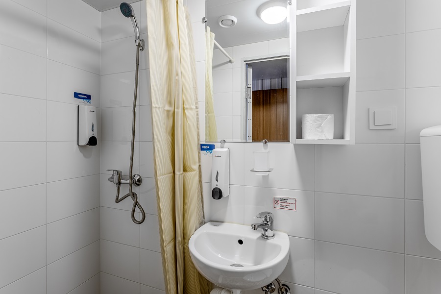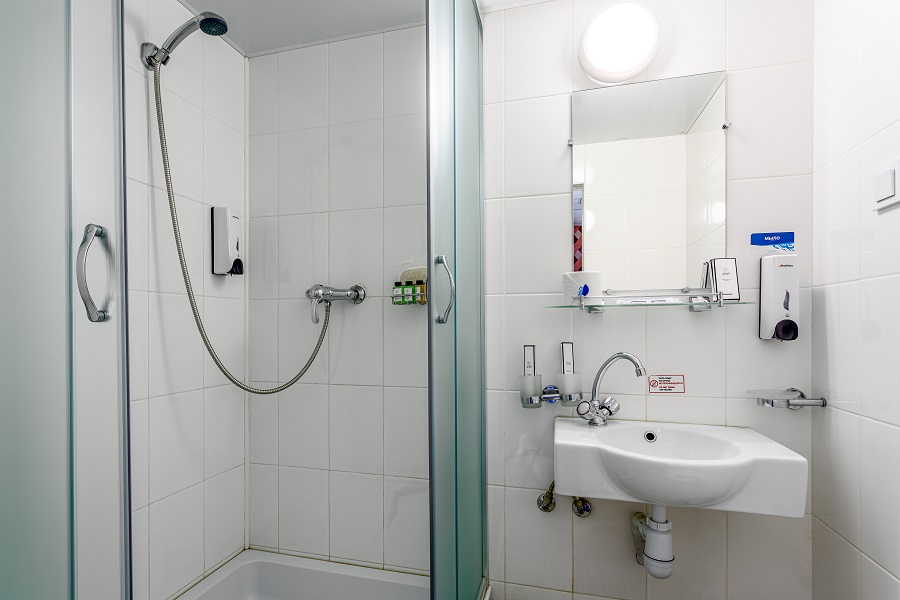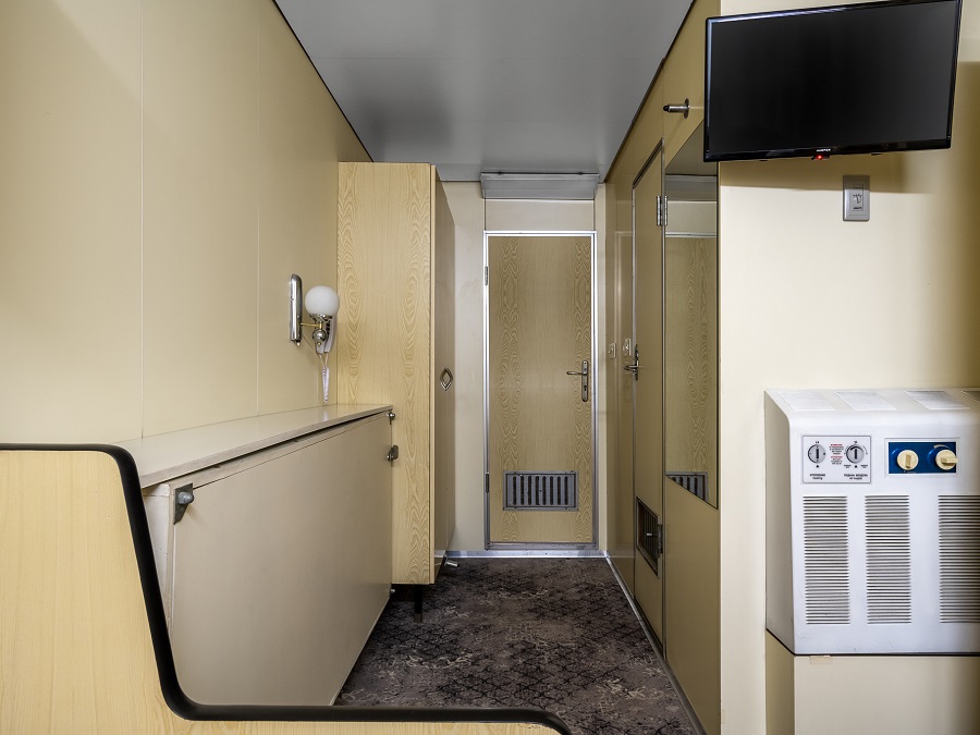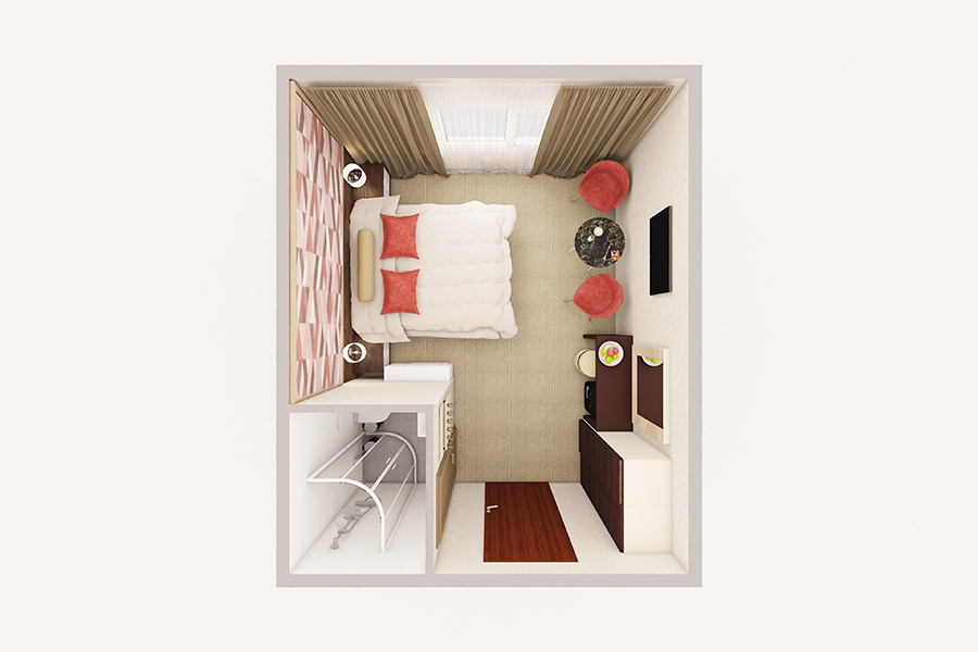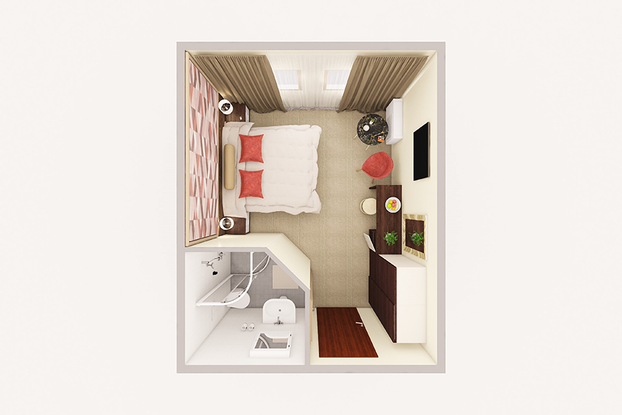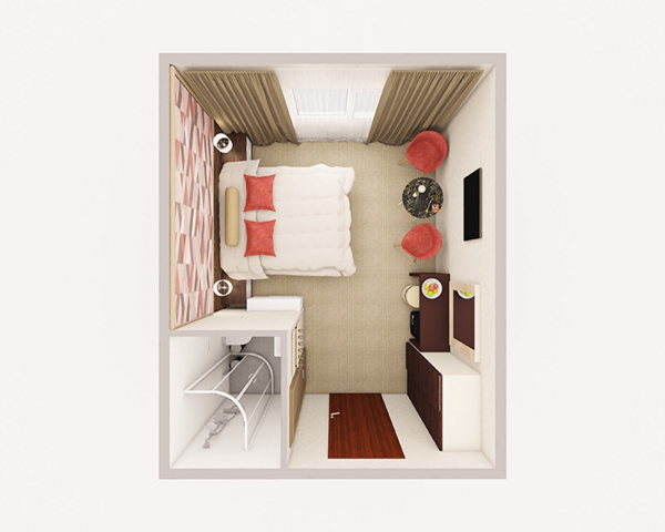 В каютах 404, 405, 420: одна двуспальная кровать (при необходимости трансформируется в две односпальные кровати), двуспальный диван, ванная комната (раковина, душевая кабина, туалет), прикроватные тумбы, пуф, стол, зеркало, кресло, стол журнальный, вешалка для верхней одежды, холодильник, кондиционер, сейф, радио, шкаф, фен, плед для каждого туриста, телевизор с кабельным и спутниковым вещанием, розетки 220 V, обзорное окно, стеклянная балконная дверь, персональный балкон с мебелью для отдыха. В каютах 408, 409, 412, 416, 417: одна двуспальная кровать (при необходимости трансформируется в две односпальные кровати), односпальный диван, ванная комната (раковина, душевая кабина, туалет), прикроватные тумбы, пуф, стол, зеркало, шкаф, стол журнальный, 2 кресла, вешалка для верхней одежды, холодильник, кондиционер, радио, сейф, фен, плед для каждого туриста, телевизор с кабельным и спутниковым вещанием, розетки 220 V, обзорное окно, стеклянная балконная дверь, персональный балкон с мебелью для отдыха. В каютах 421, 422: одна двуспальная кровать (при необходимости трансформируется в две односпальные кровати), ванная комната (раковина, душевая кабина, туалет), прикроватные тумбы, пуф, стол, зеркало, шкаф, стол журнальный, 2 кресла, вешалка для верхней одежды, холодильник, кондиционер, радио, сейф, фен, плед для каждого туриста, телевизор с кабельным и спутниковым вещанием, розетки 220 V, обзорное окно, стеклянная балконная дверь, персональный балкон с мебелью для отдыха. Также к услугам туристов в каюте: косметика для душа, туалетные принадлежности, щетка для одежды, банные халаты, маски для сна, тапочки, набор посуды и столовых приборов, чайная пара, питьевая вода, приветственный набор (игристый напиток, фрукты), капсульная кофемашина (одна чашка кофе на человека – в подарок), мини-бар (за дополнительную плату).
