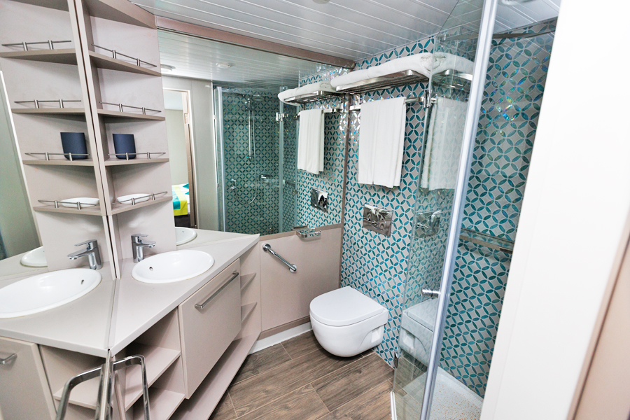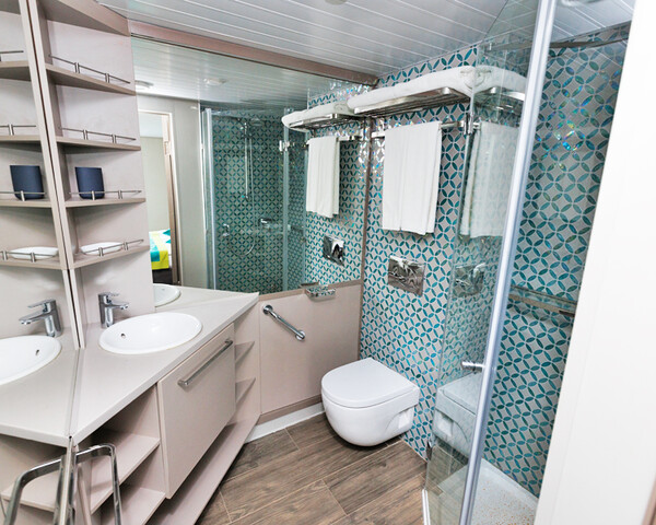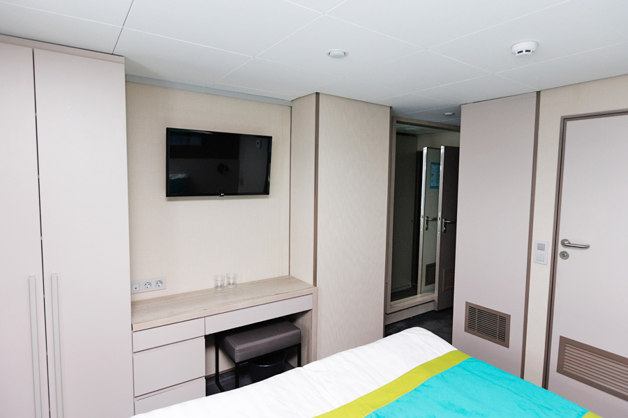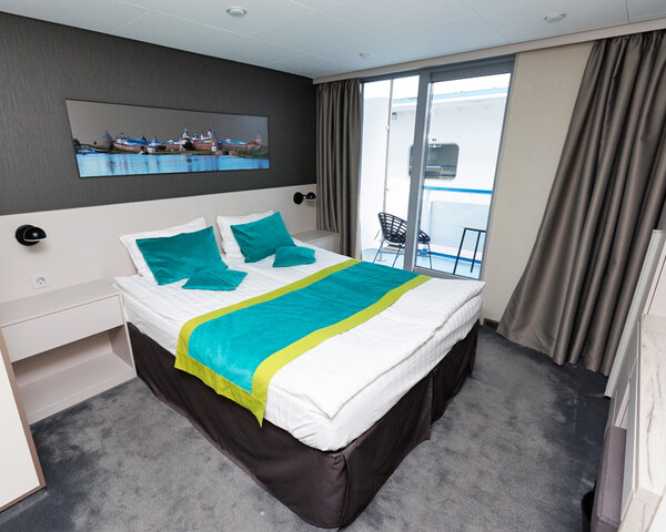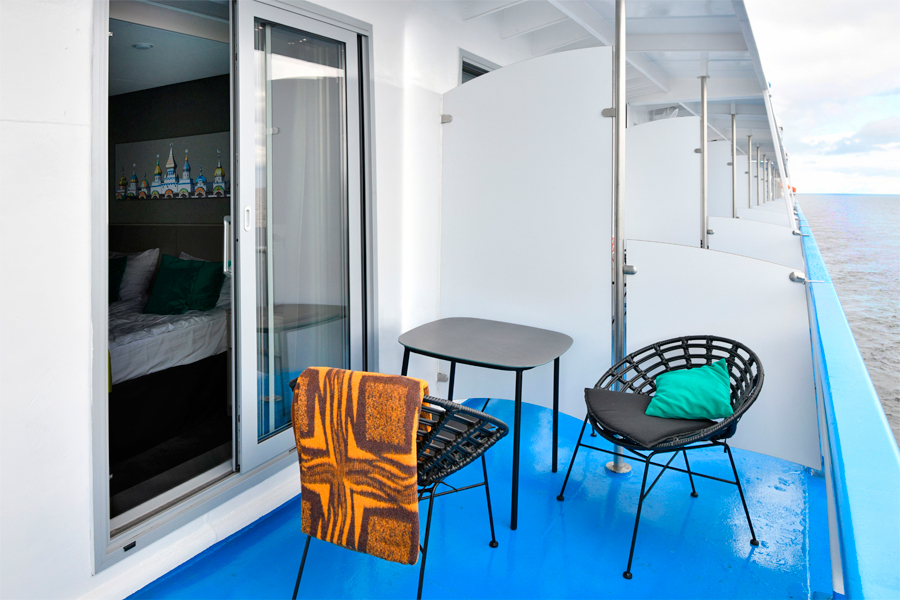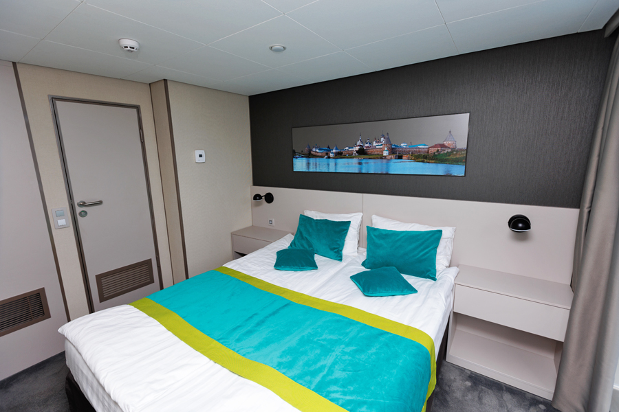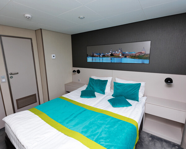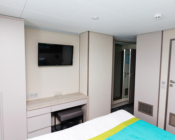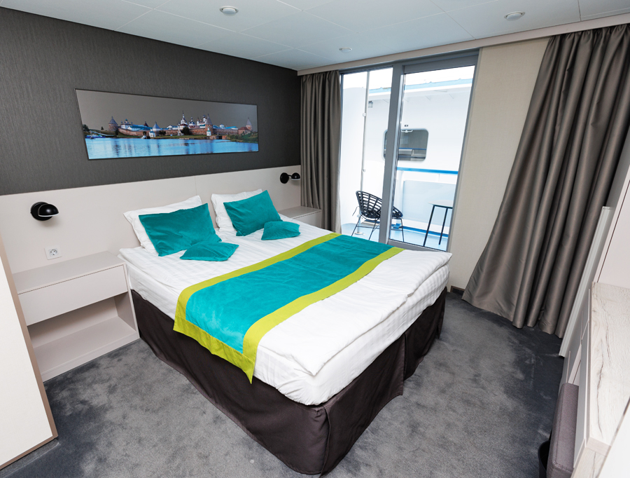В каюте: двуспальная кровать (можно раздвинуть), кондиционер/обогреватель, телевизор, сейф, внутренний телефон, фен, холодильник, стаканы для питья, щетка для одежды, тапочки, панорамное остекление и выход на балкон. В ванной комнате: душ, зеркало, 2 стакана, туалетные принадлежности (мыло, шампунь, гель для душа в тюбиках, туалетная бумага), комплект полотенец (полотенце банное большое, полотенце для рук среднее).