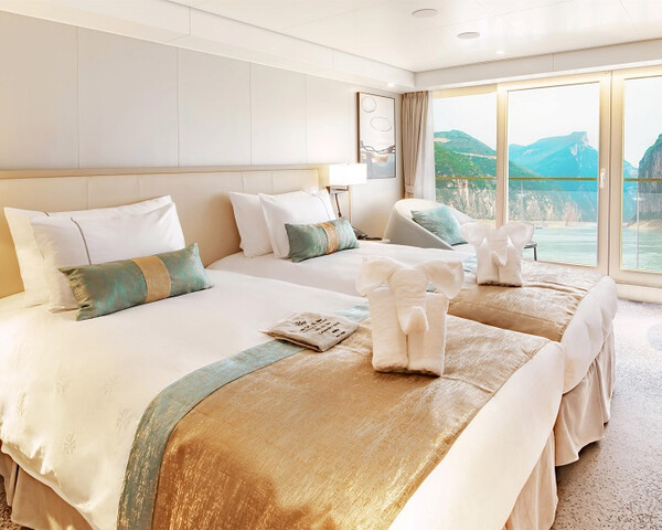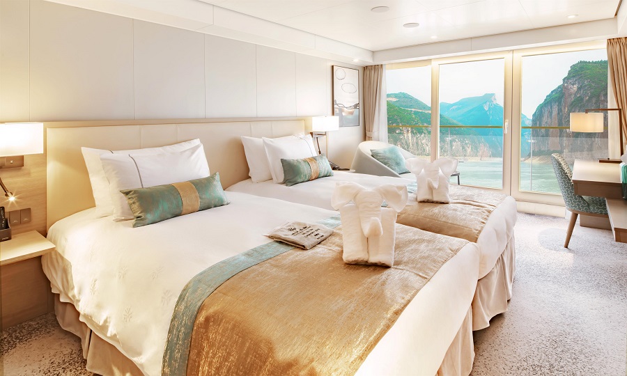 В каюте: две односпальные кровати, ванная комната (раковина, душевая кабина с ванной, туалет), система кондиционирования воздуха, спутниковое телевидение, питьевая вода (ежедневно), чайник и чайный набор, туалетные принадлежности, приветственный набор, стеклянная балконная дверь-окно, персональный балкон с мебелью для отдыха.