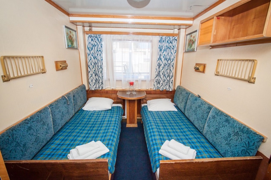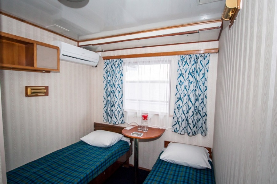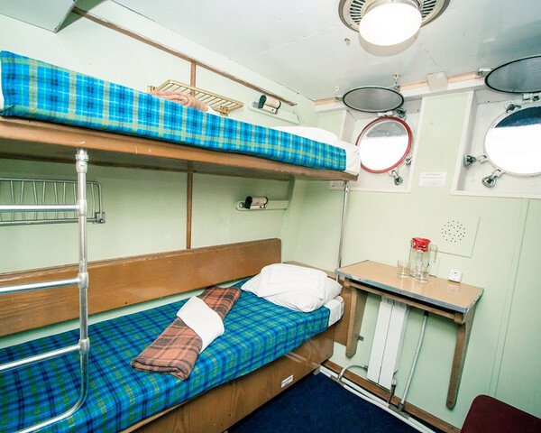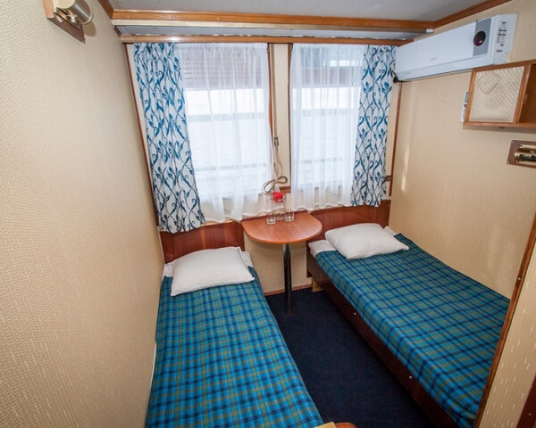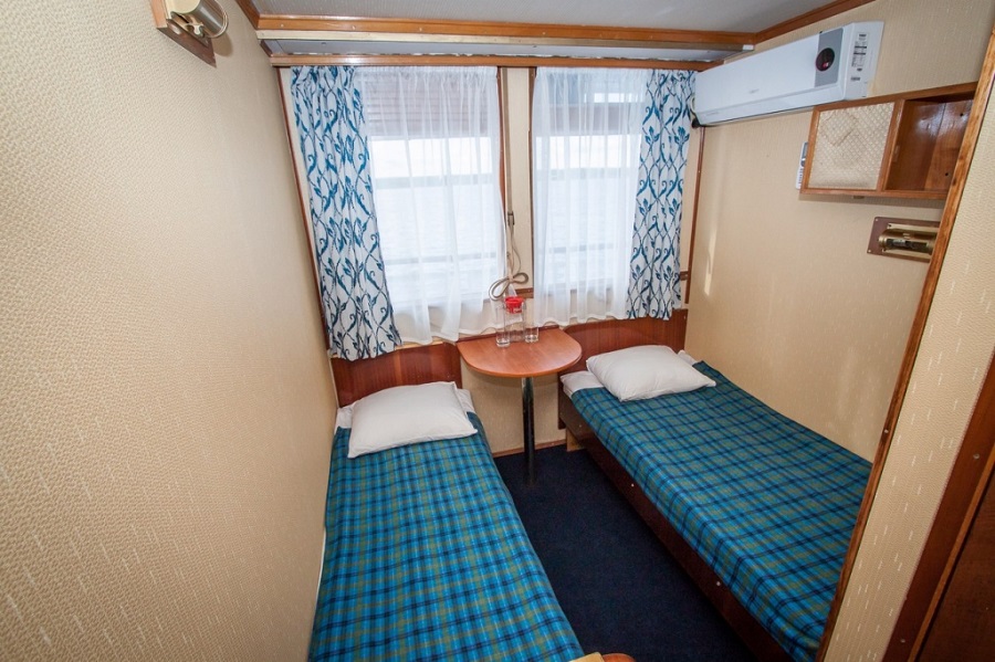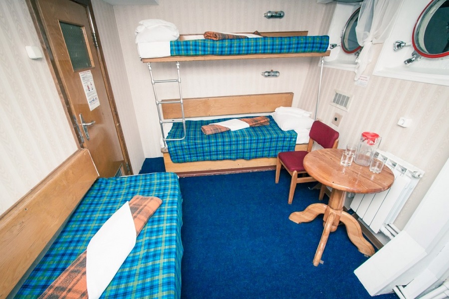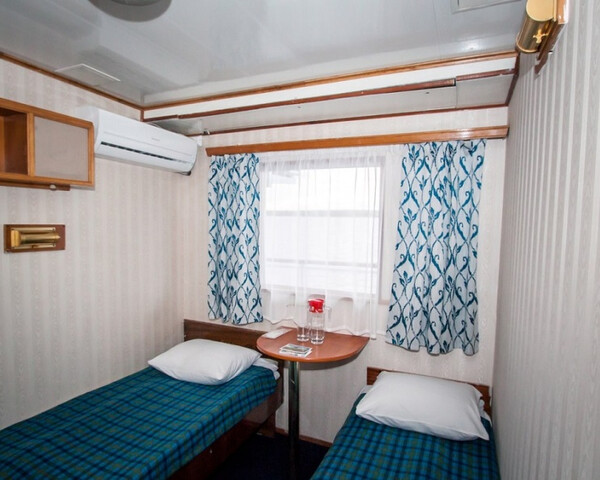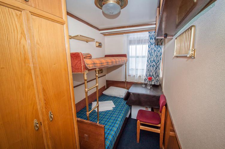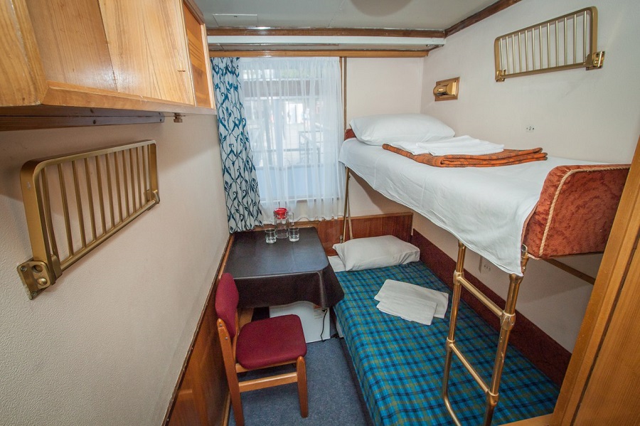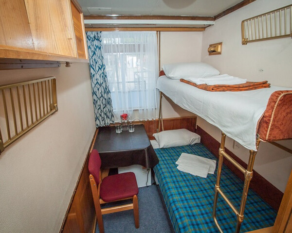 В каюте: двухъярусная кровать, раковина с холодной и горячей водой, полка с плечиками для одежды, стол и стул, радио, розетка, обзорное окно.