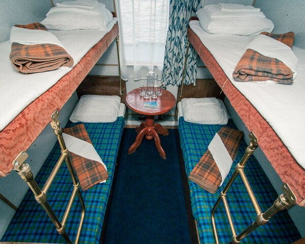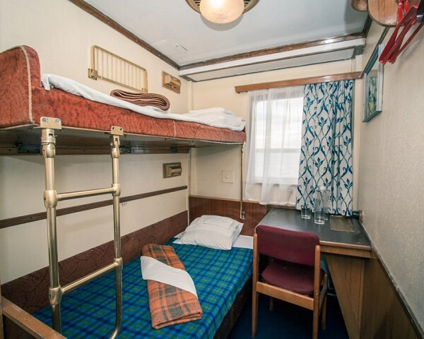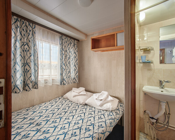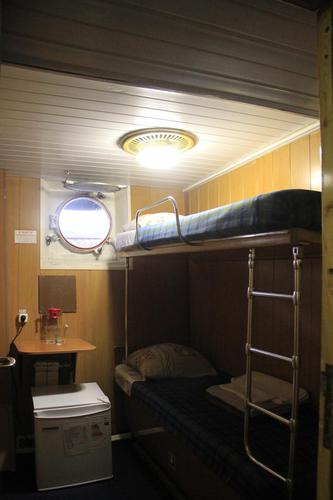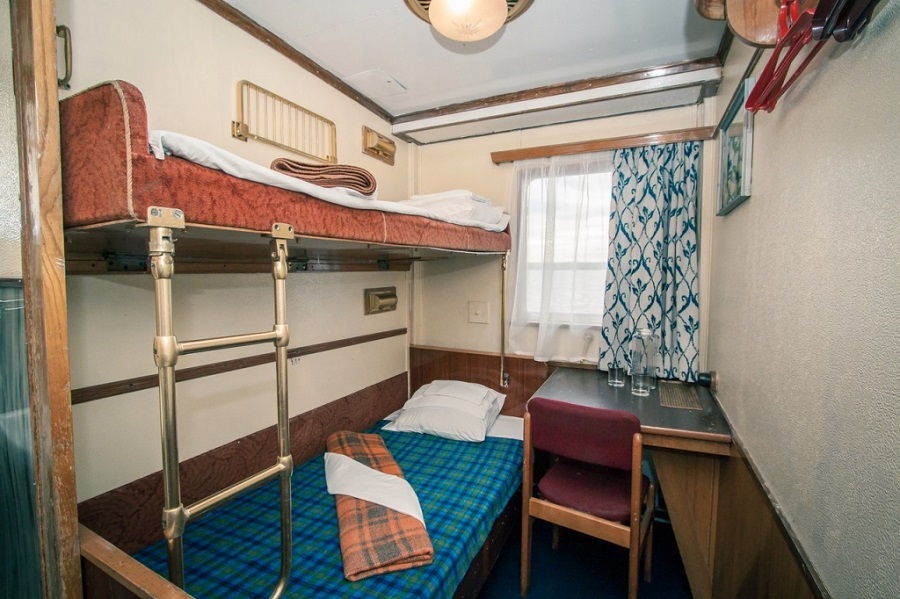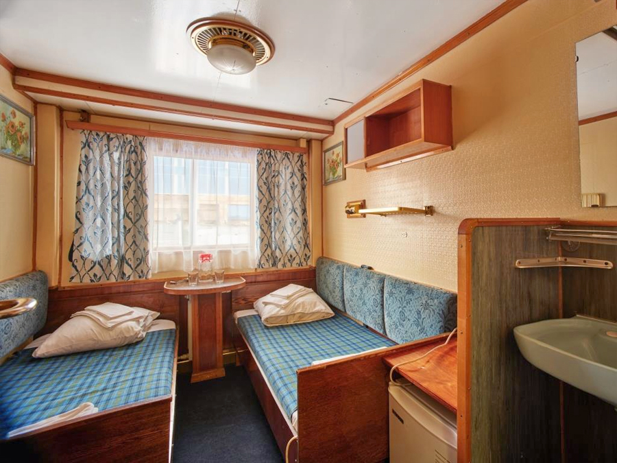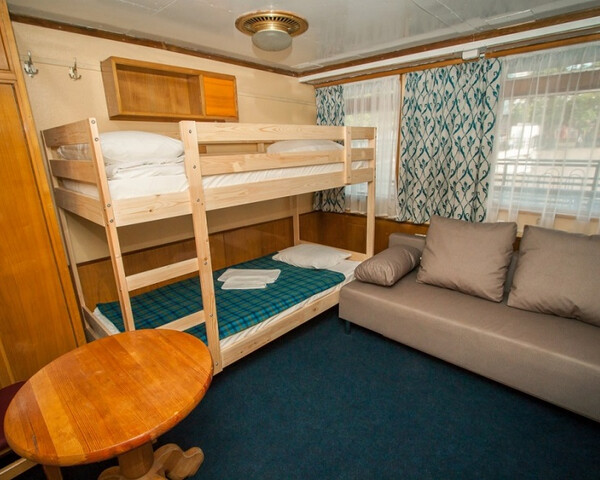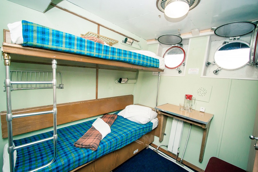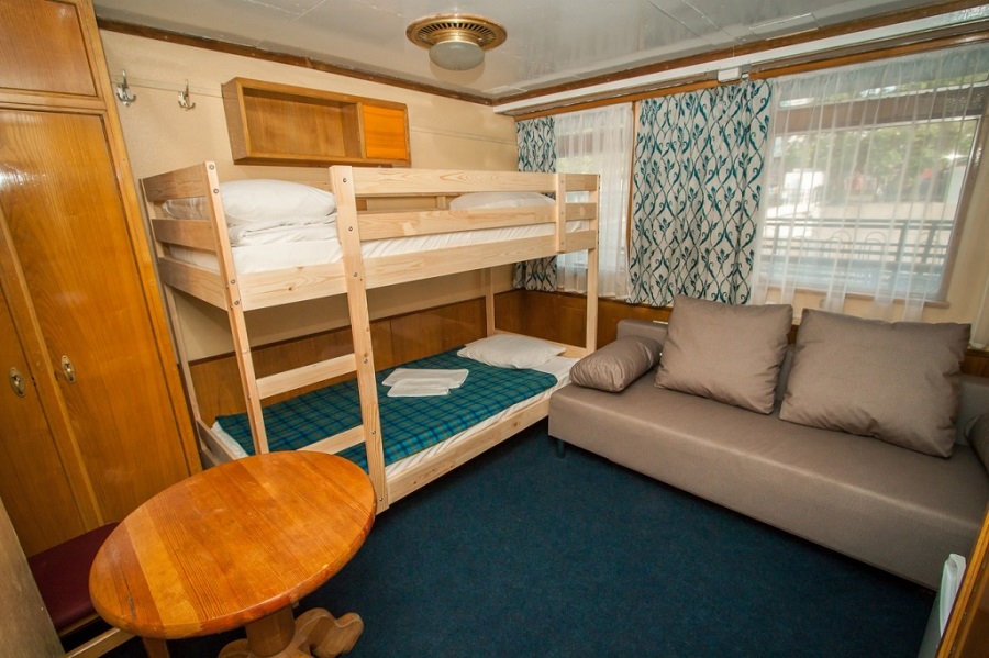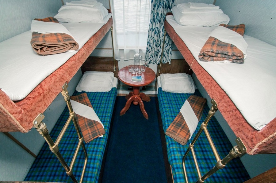 В каюте: двухъярусная кровать, раковина с холодной и горячей водой, полка с плечиками для одежды, стол и стул, радио, розетка, обзорное окно.