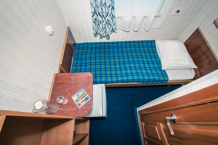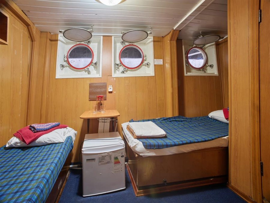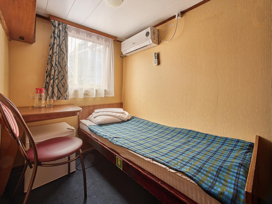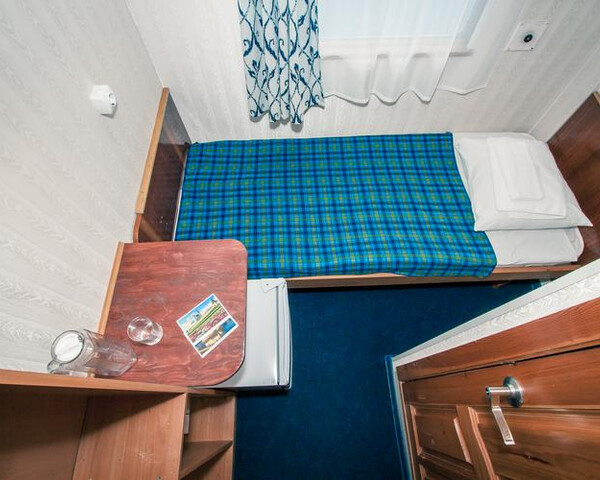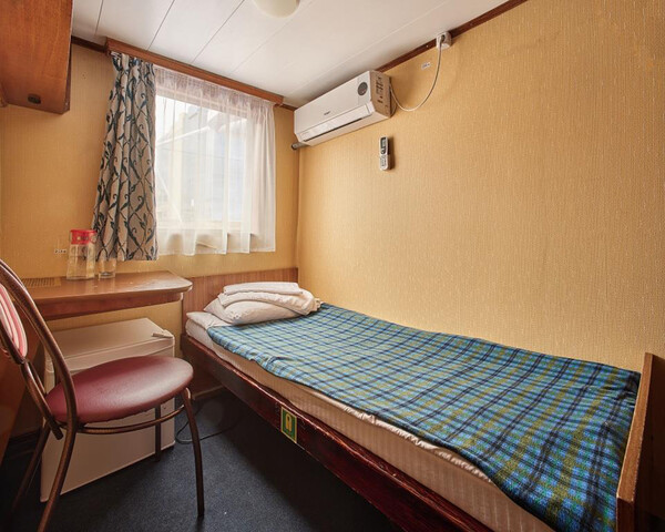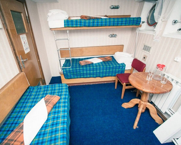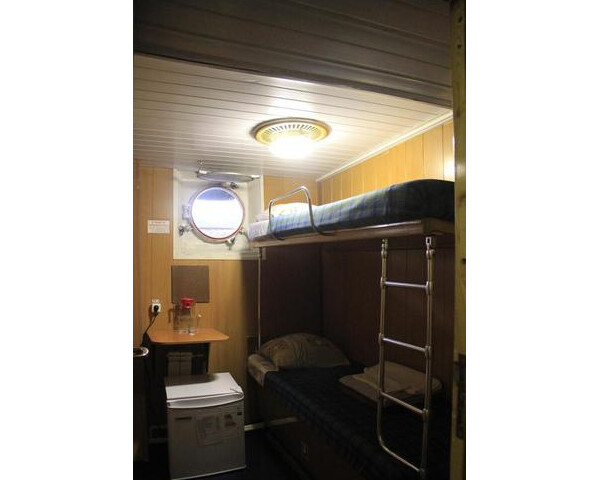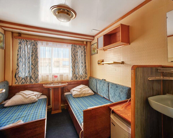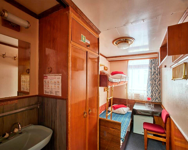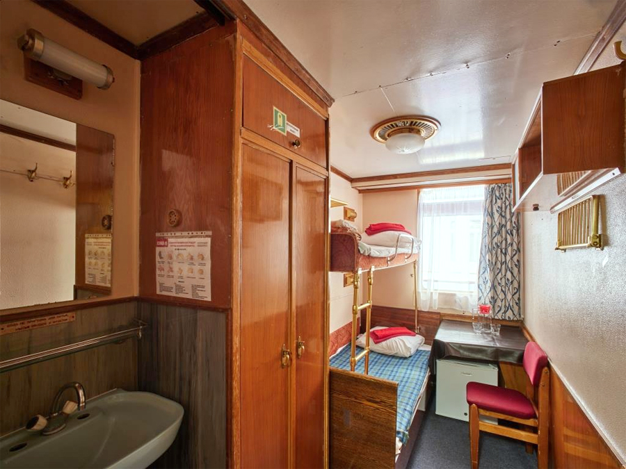 В каюте: двухъярусная кровать, раковина с горячей и холодной водой, шкаф для одежды, столик, зеркало, радио, розетка, иллюминатор.
