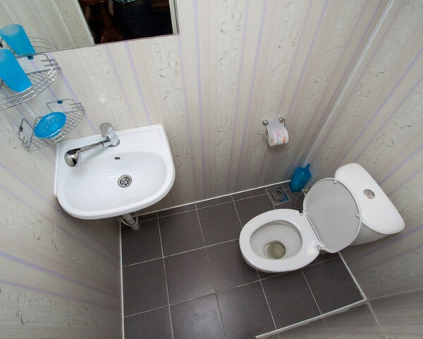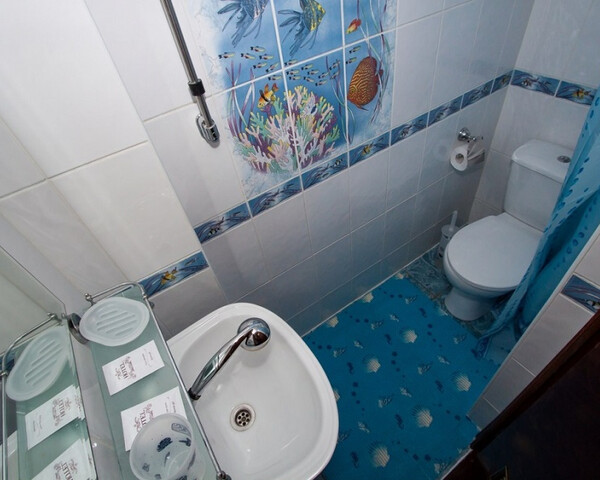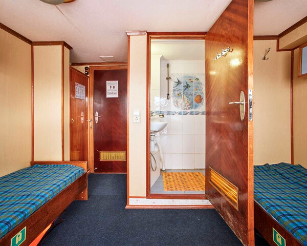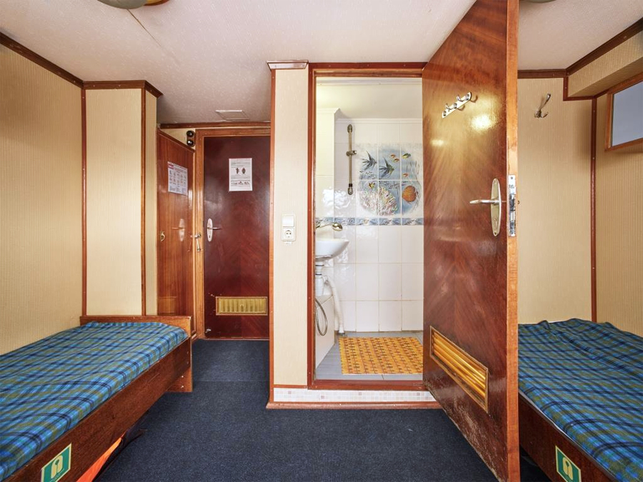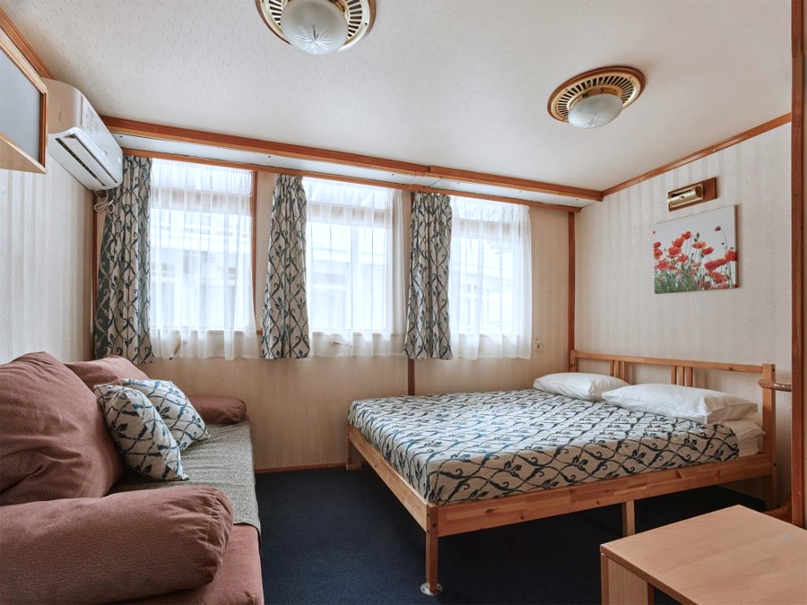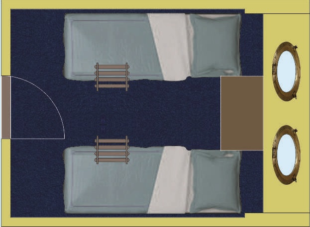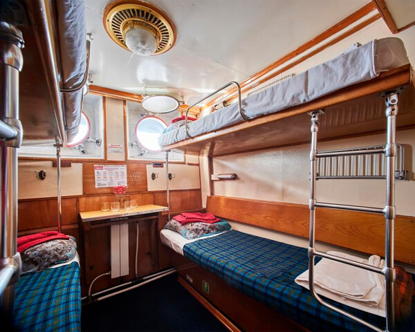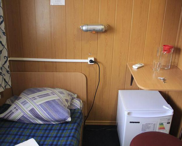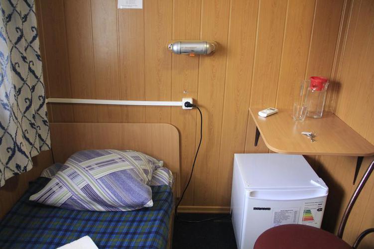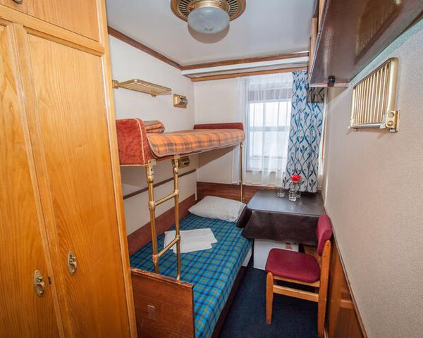 В каюте: двухъярусная кровать, раковина с горячей и холодной водой, шкаф для одежды, столик, зеркало, радио, розетка, иллюминатор.