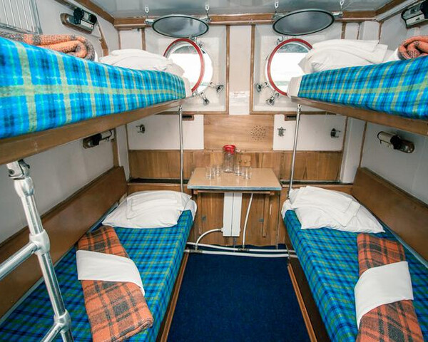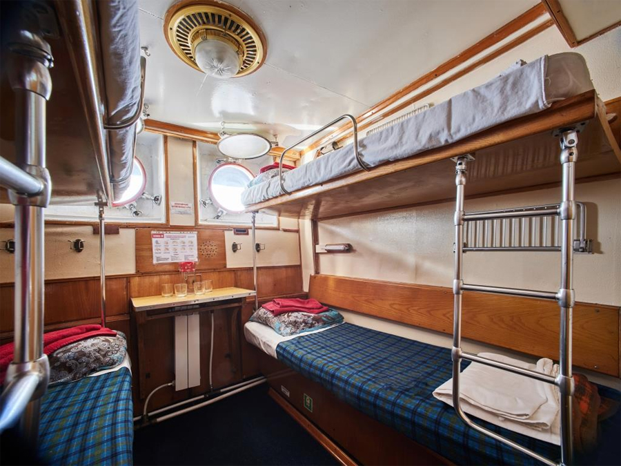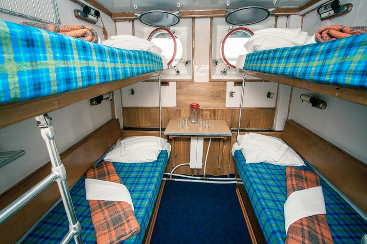В каюте: две двухъярусные кровати, столик, крючки для одежды, радио, розетка, иллюминатор.