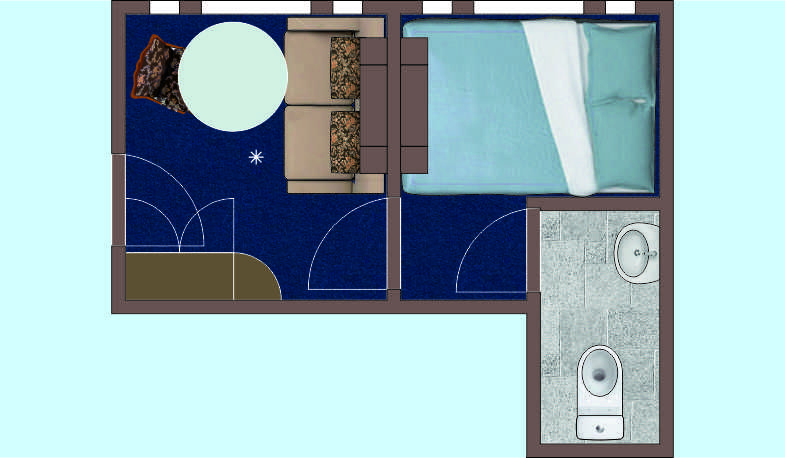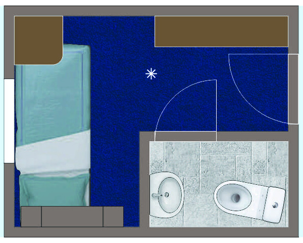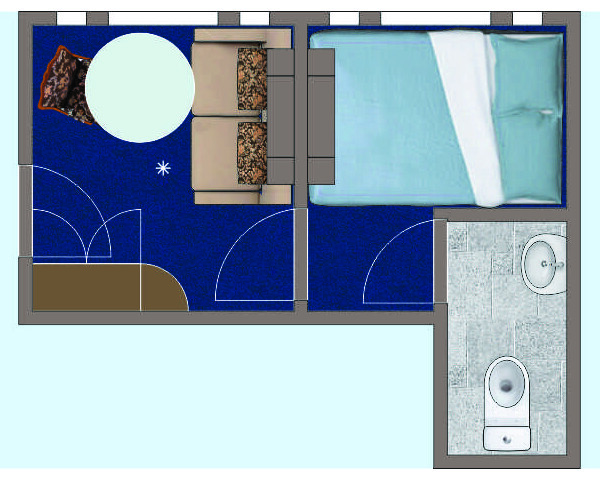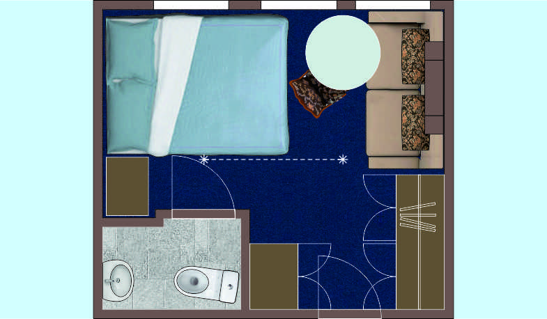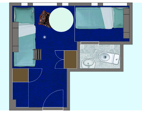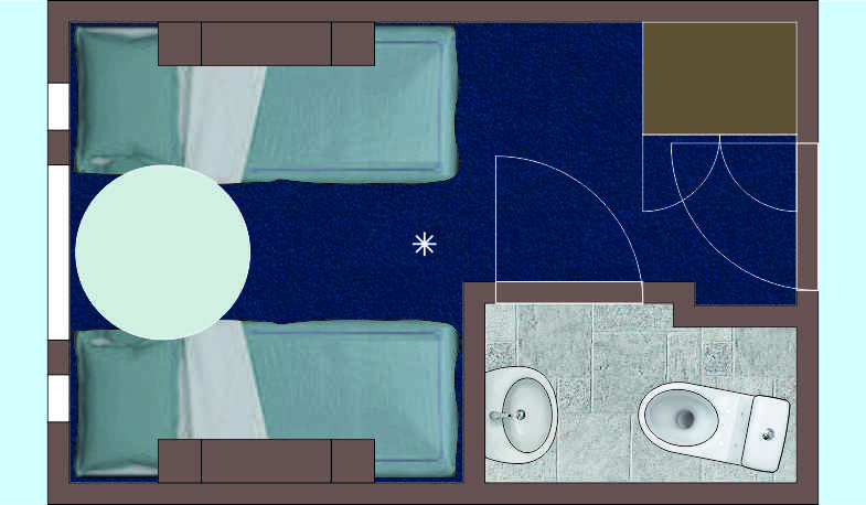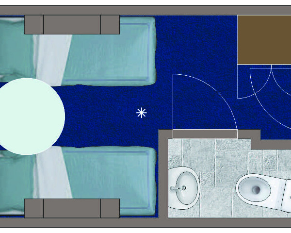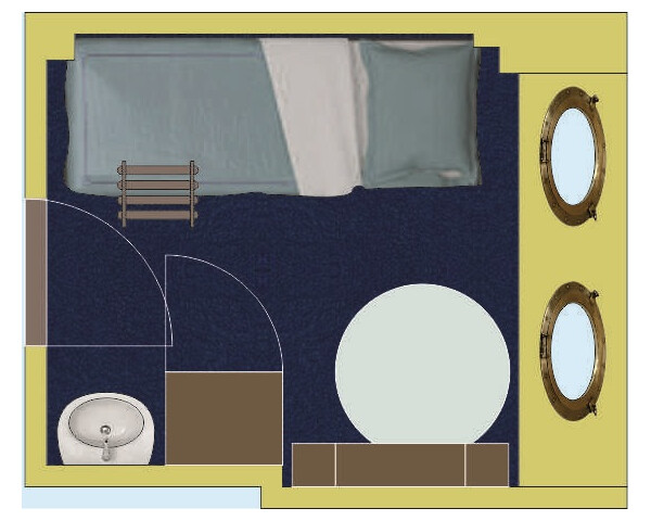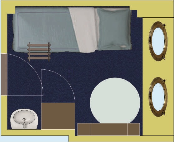 К категории 1А класс 2-местная относятся каюты: 58, 60–63, 65.Двухместная каюта, расположенная на средней палубе.Площадь каюты ≈ 7 м².