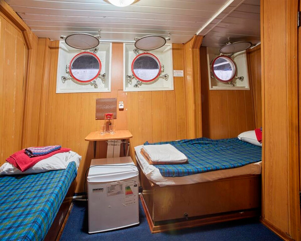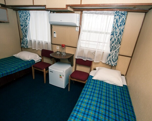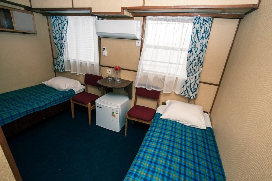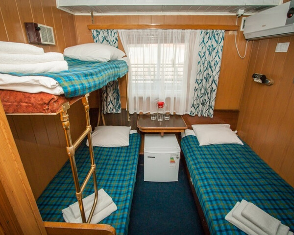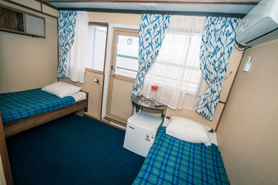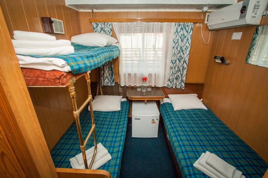 В каюте: двухъярусная кровать, раковина с холодной и горячей водой, шкаф для одежды, настенная полка, холодильник, столик, зеркало, радио, розетка, обзорное окно.