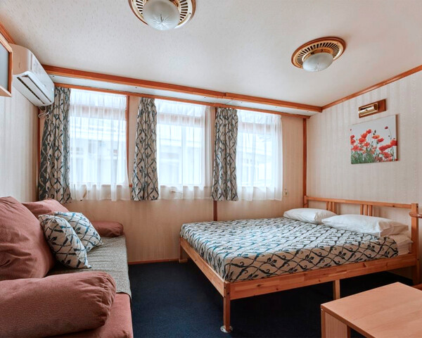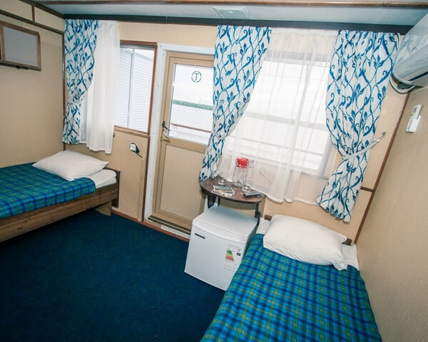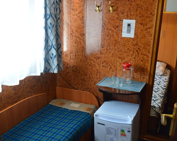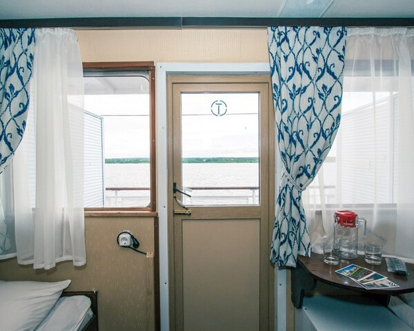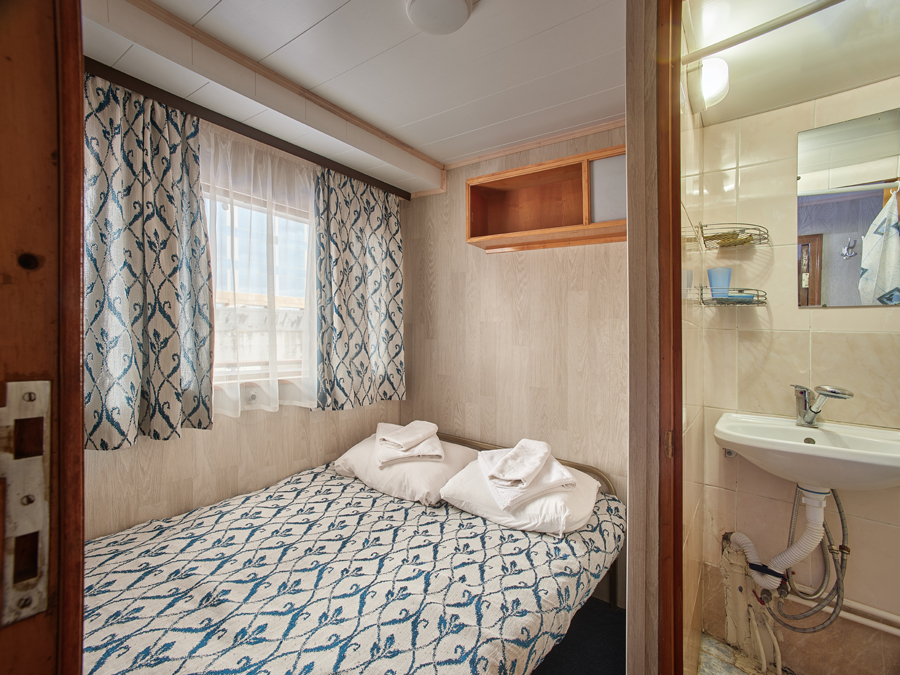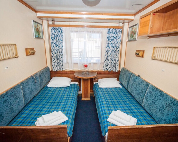 В каюте: два спальных места, раковина с холодной и горячей водой, шкаф для одежды, настенная полка, холодильник, столик, зеркало, радио, розетка, обзорное окно.