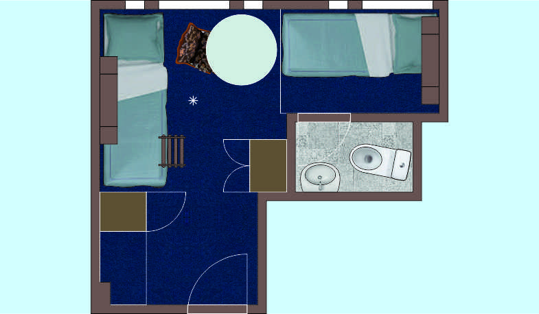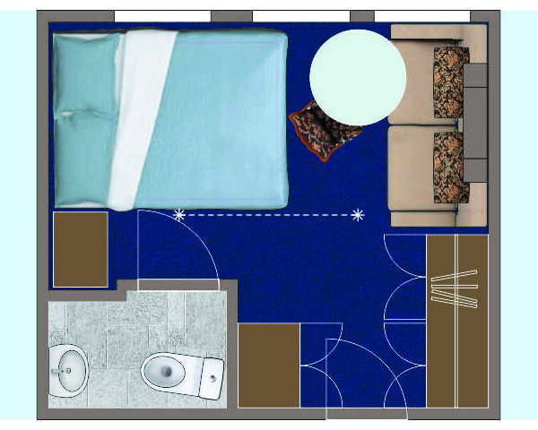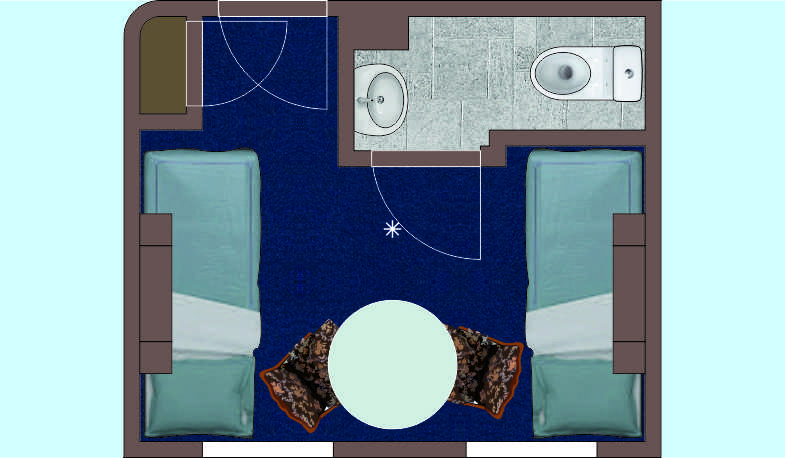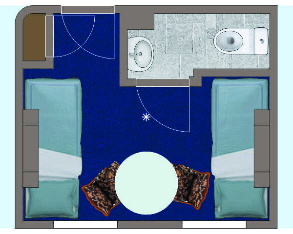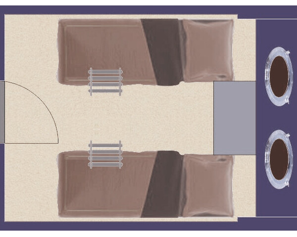 В каюте: две односпальные кровати, ванная комната (раковина, душ, туалет), шкаф для одежды, настенная полка, кондиционер, холодильник, столик, радио, розетка, обзорное окно.