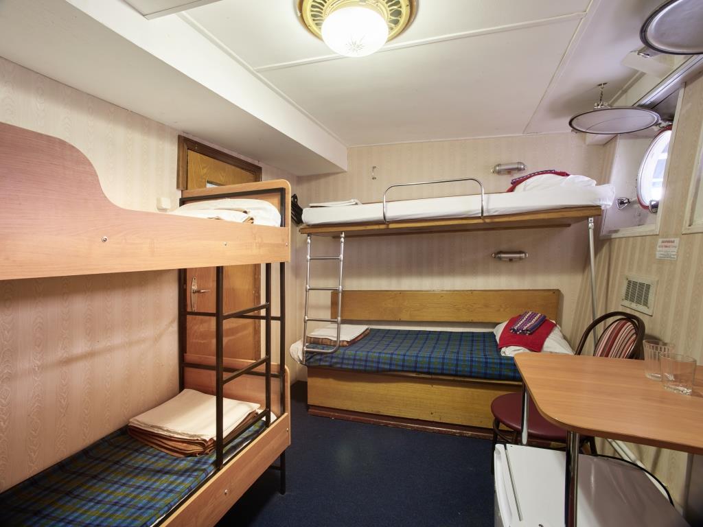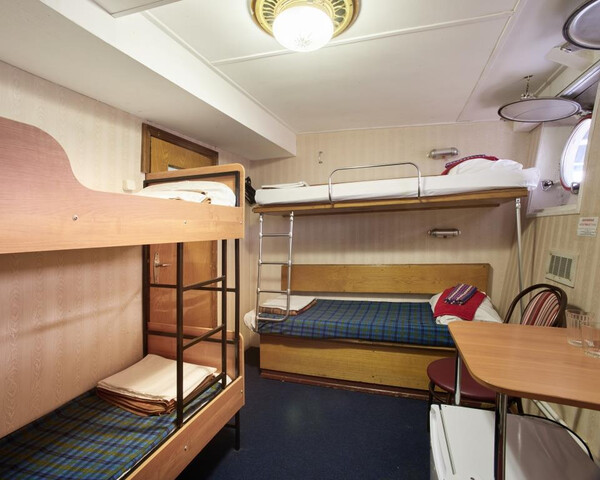 В каюте: две двухъярусные кровати, раковина с холодной и горячей водой, шкаф для одежды, стол и стул, радио, розетка, обзорное окно.