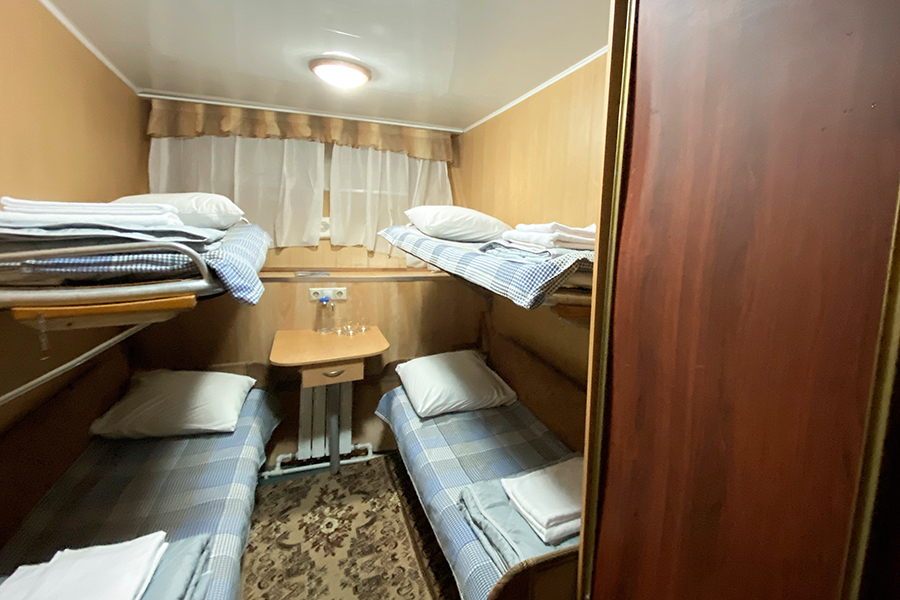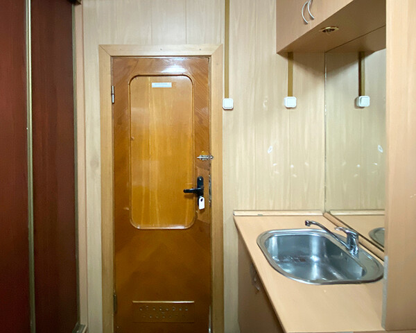 В каюте: две двухъярусные кровати, раковина с горячей и холодной водой, иллюминаторы.
