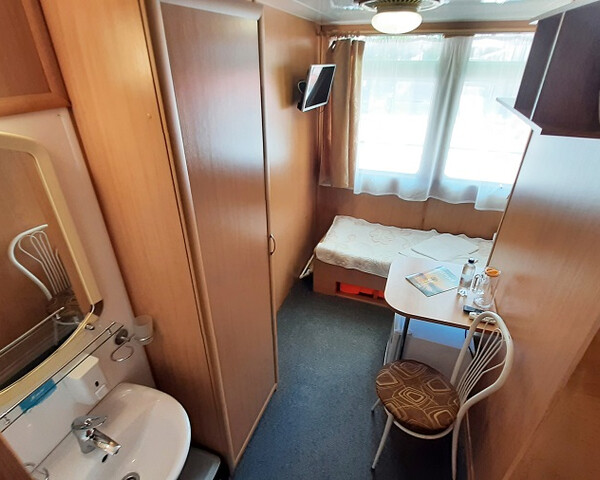 В каюте: две двухъярусные кровати, ванная комната (раковина, душ, туалет), шкаф для одежды, стол, мини-холодильник, телевизор, радио, розетка 220V, иллюминаторы.
