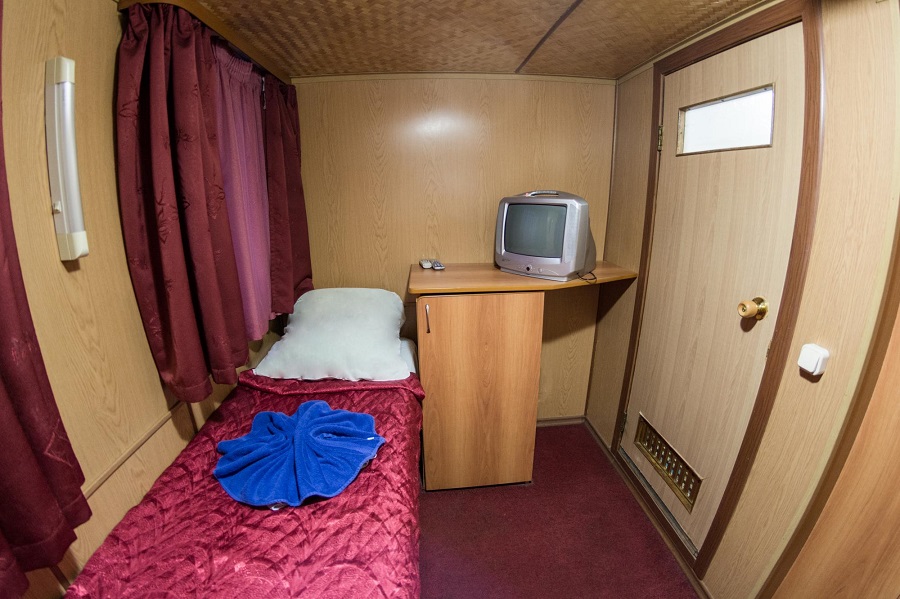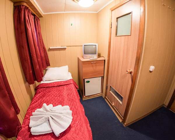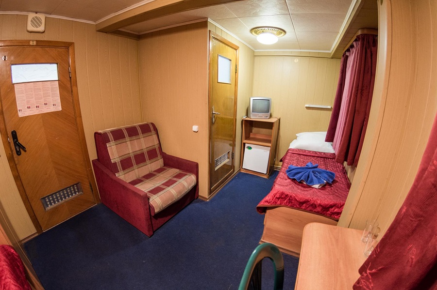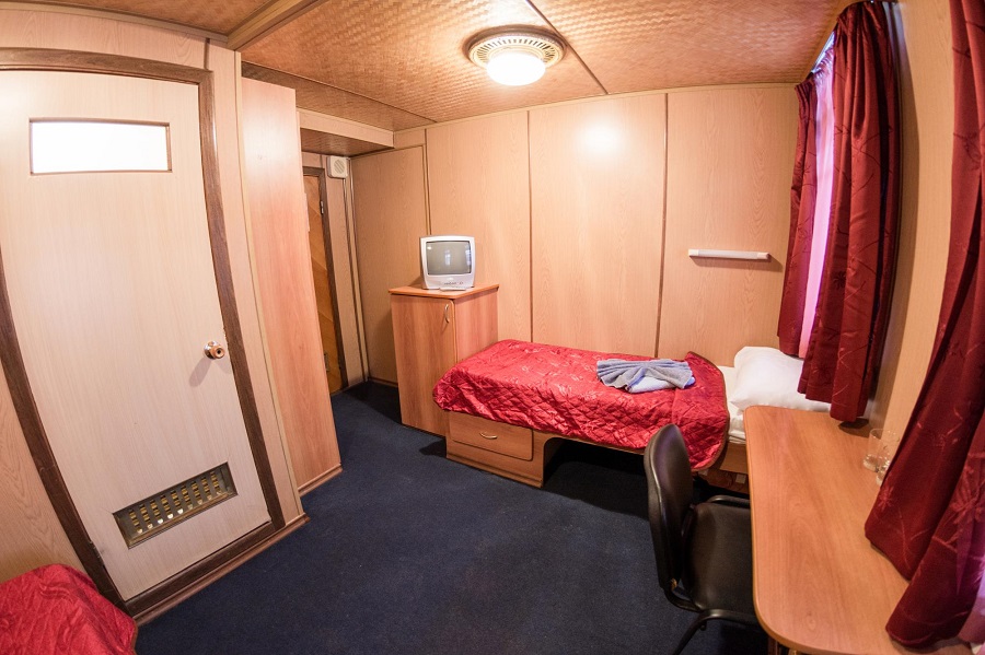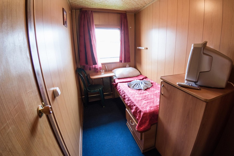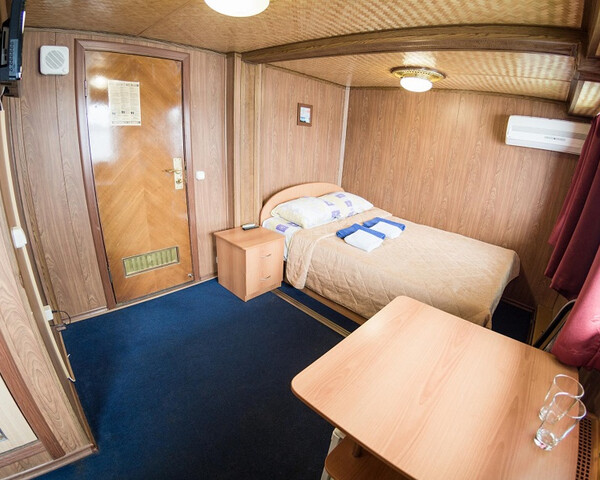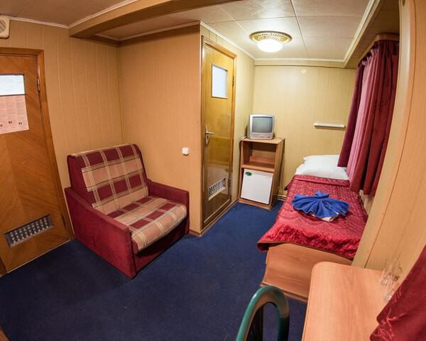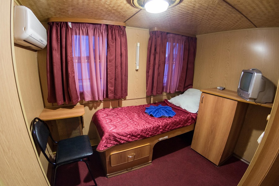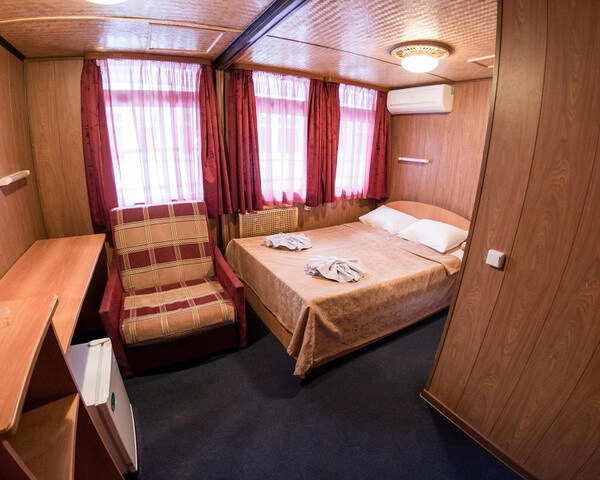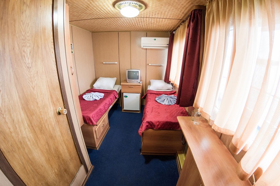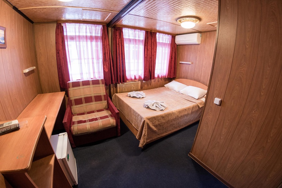 В каюте: двуспальная кровать, ванная комната (раковина, душ, туалет), кондиционер, шкаф для одежды, телевизор, холодильник, радио, два обзорных окна, розетка на 220V.