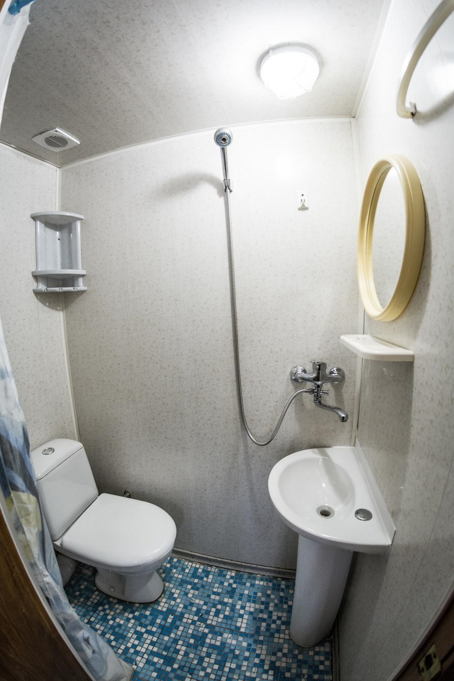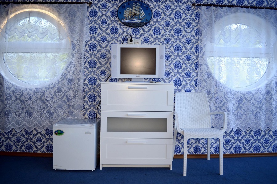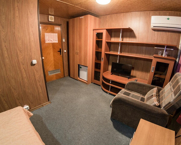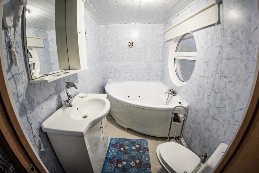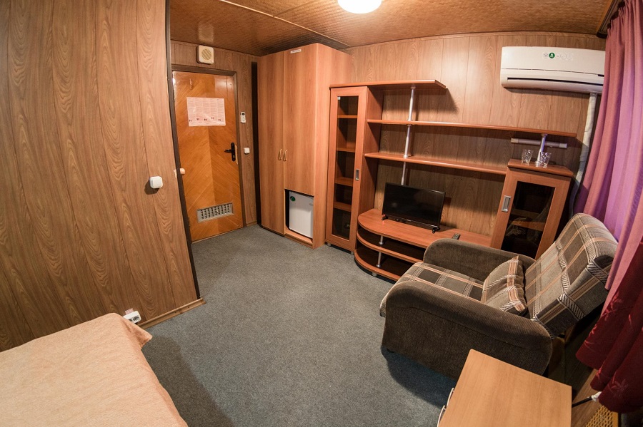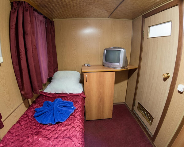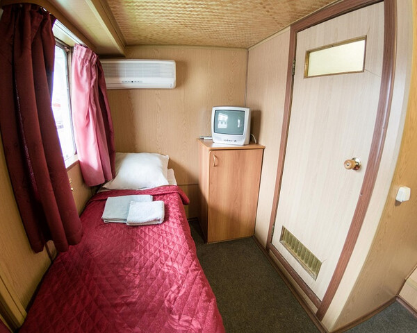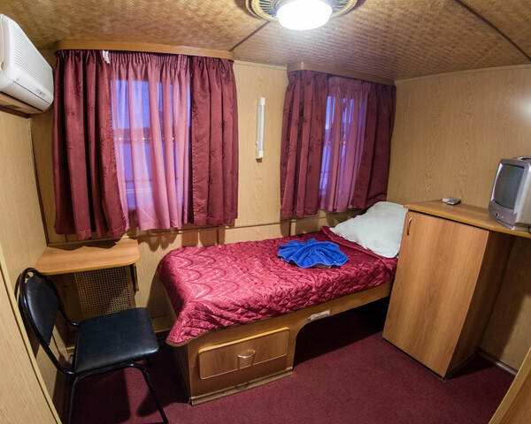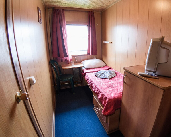 В каюте: двуспальная кровать, ванная комната (раковина, душ, туалет), кондиционер, шкаф для одежды, телевизор, холодильник, радио, два обзорных окна, розетка на 220V.