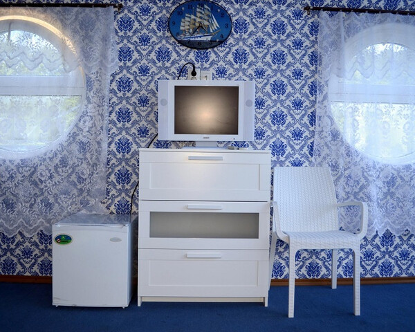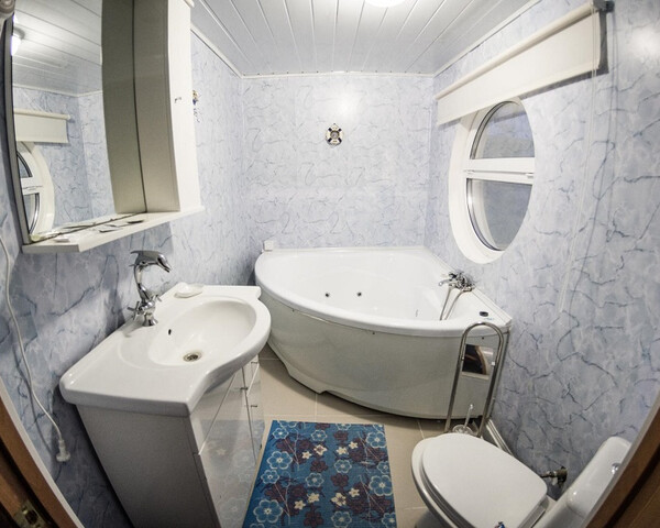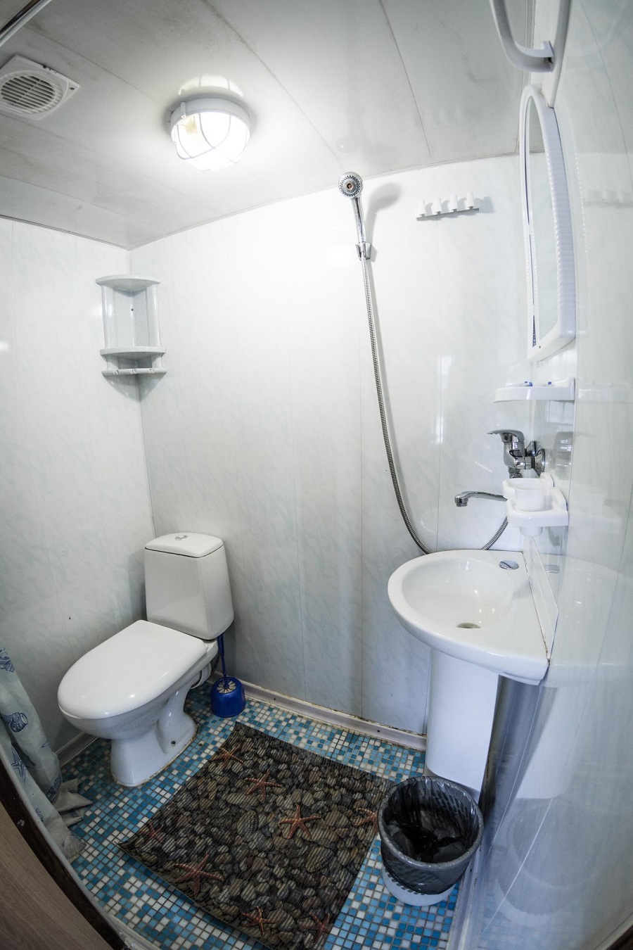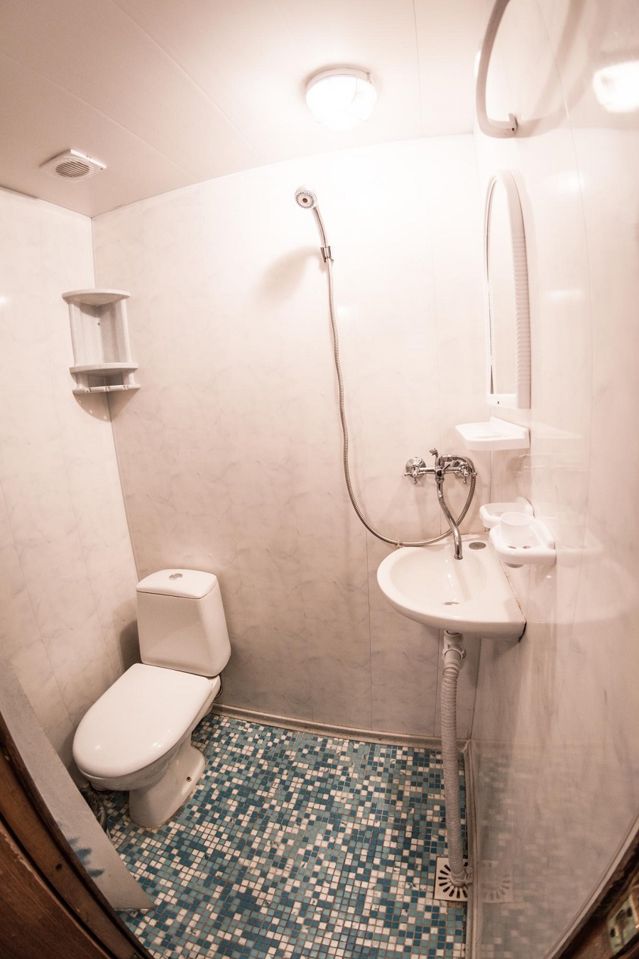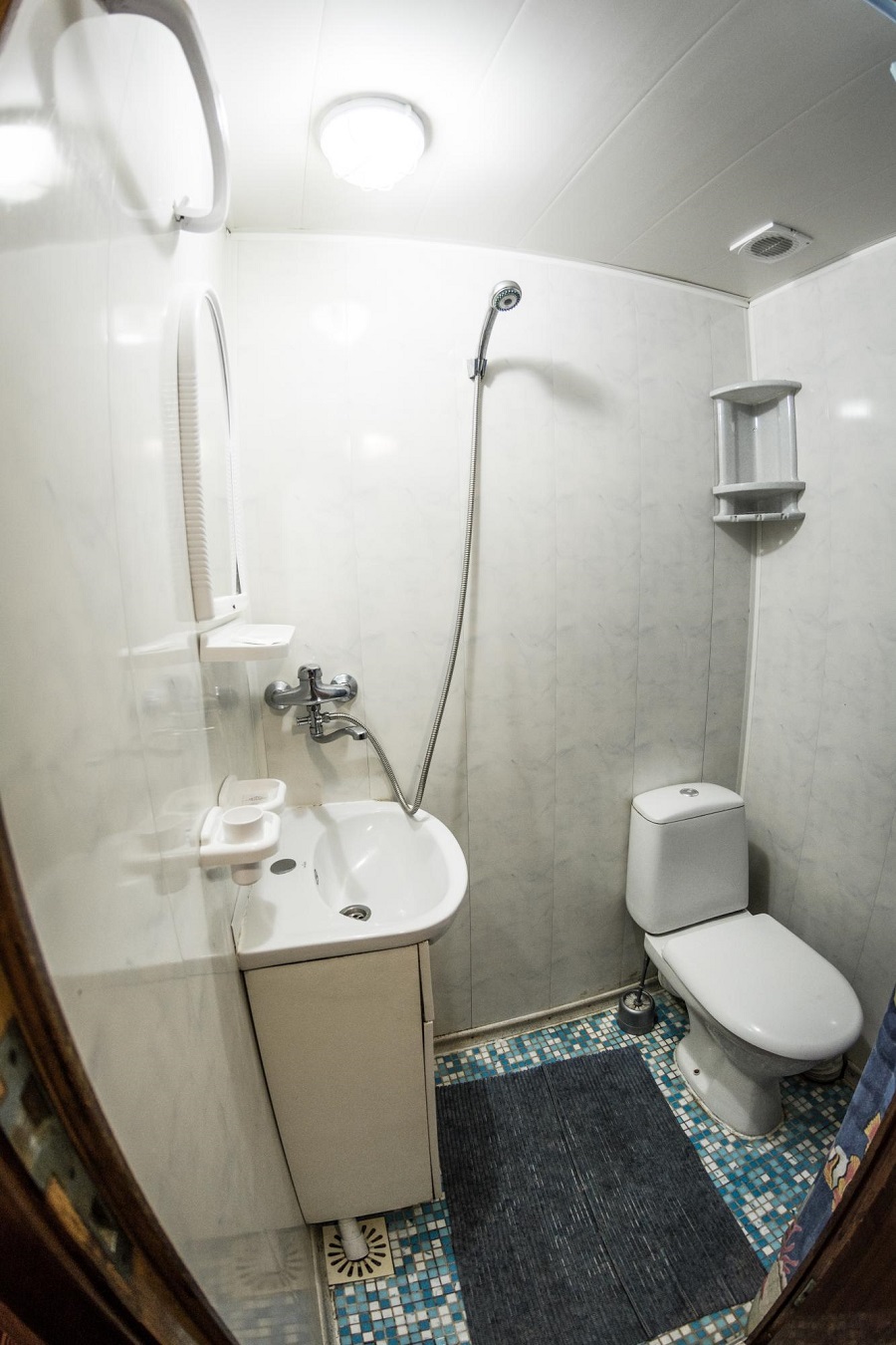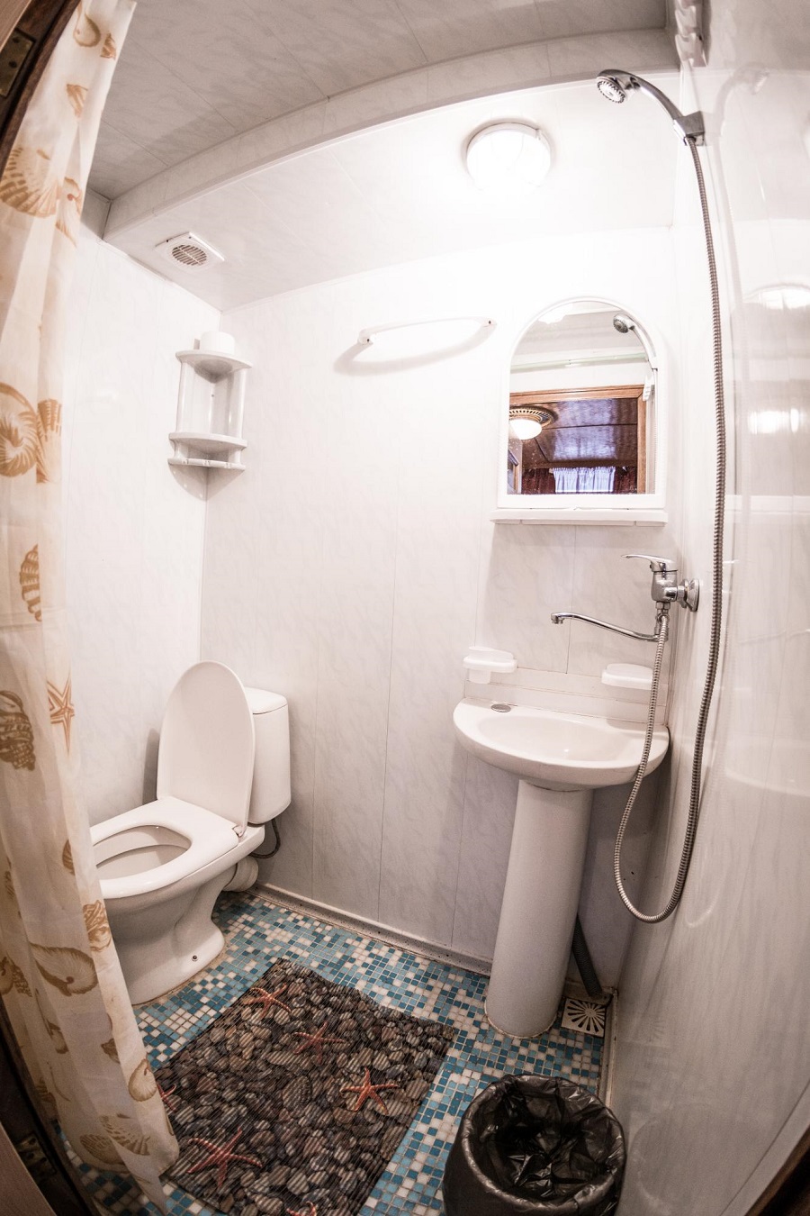 В каюте: двуспальная кровать, ванная комната (раковина, душ, туалет), кондиционер, шкаф для одежды, телевизор, холодильник, радио, два обзорных окна, розетка на 220V.