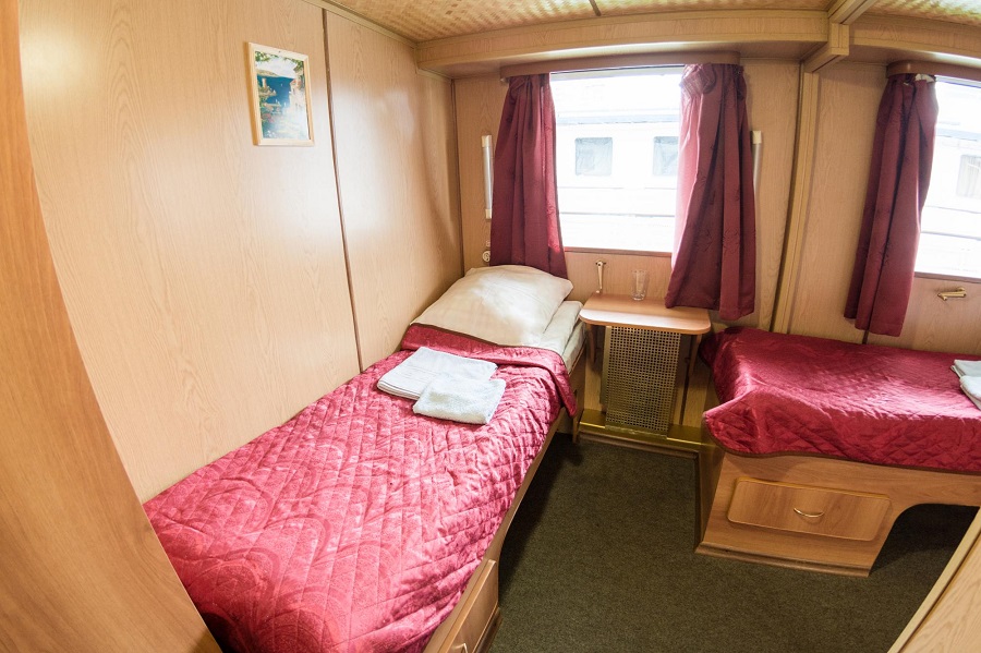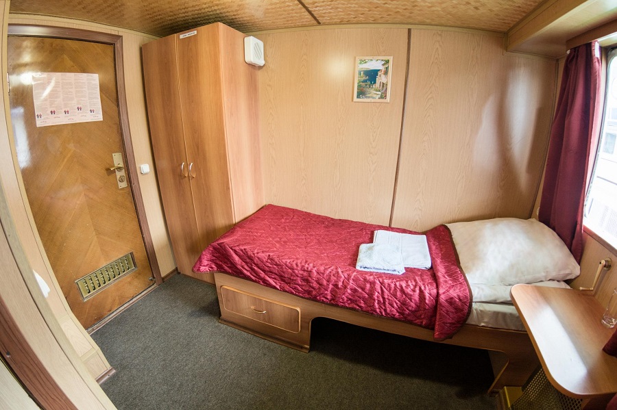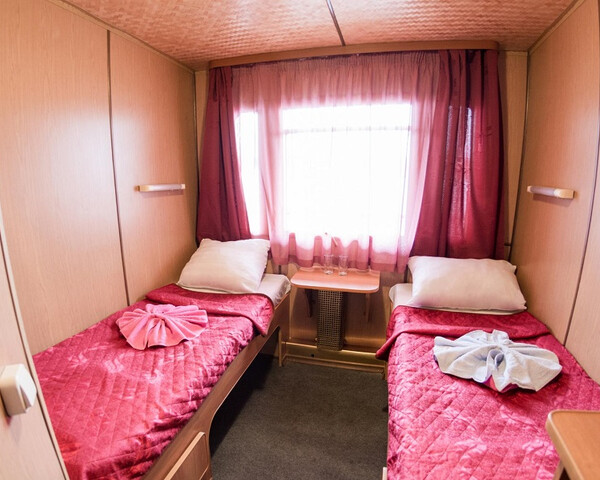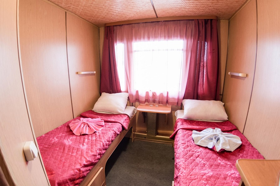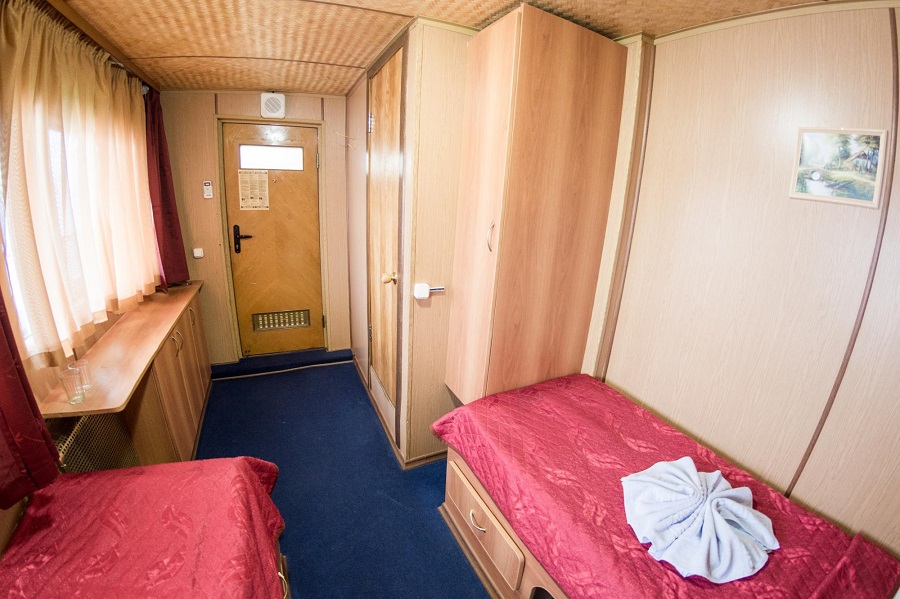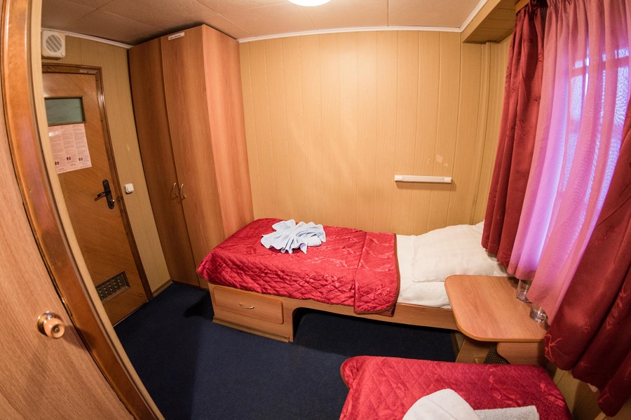 В каюте: две односпальные кровати, шкаф для одежды, ванная комната (раковина, душ, туалет), общая система вентиляции, телевизор, холодильник, радио, розетка на 220V, обзорное окно.