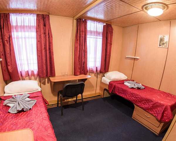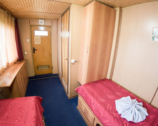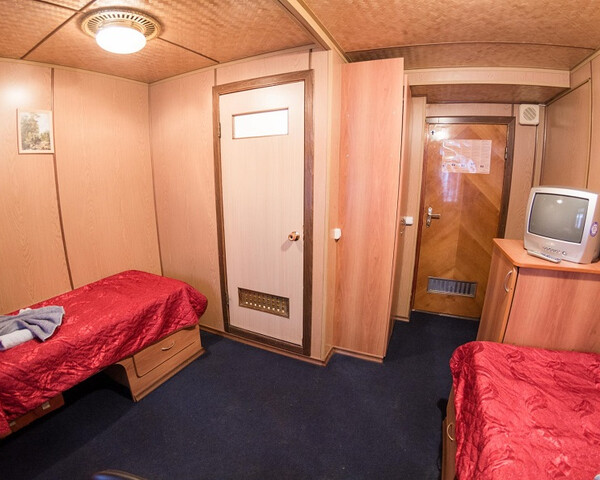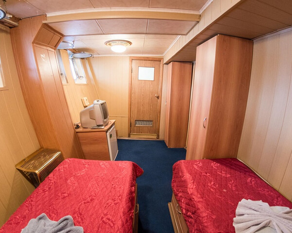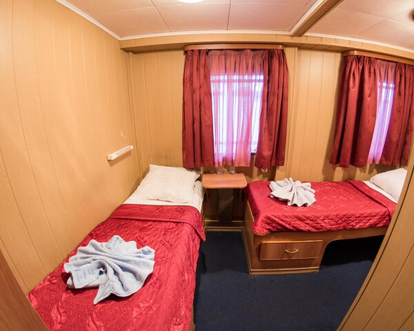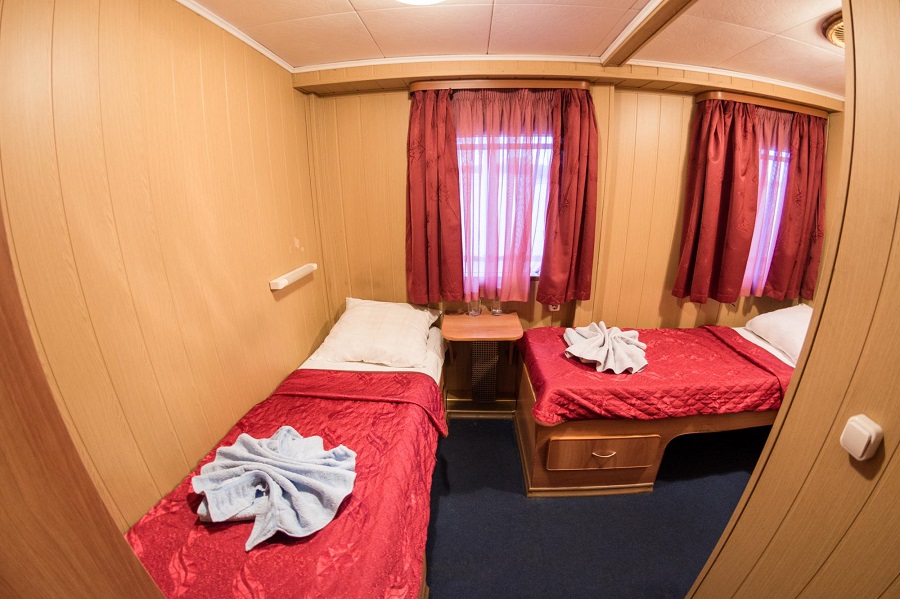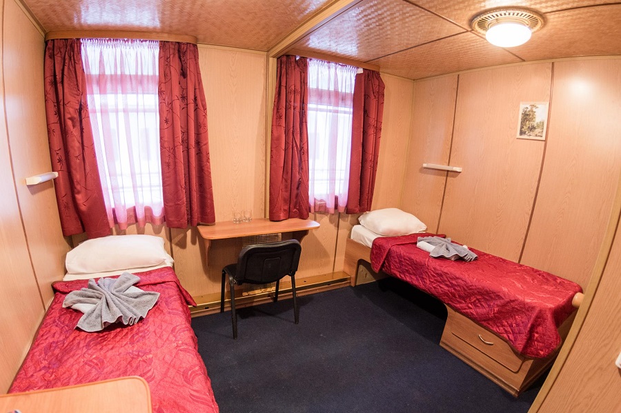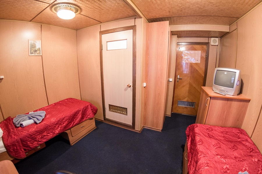 В каюте: две односпальные кровати, шкаф для одежды, ванная комната (раковина, душ, туалет), общая система вентиляции, телевизор, холодильник, радио, розетка на 220V, иллюминаторы.