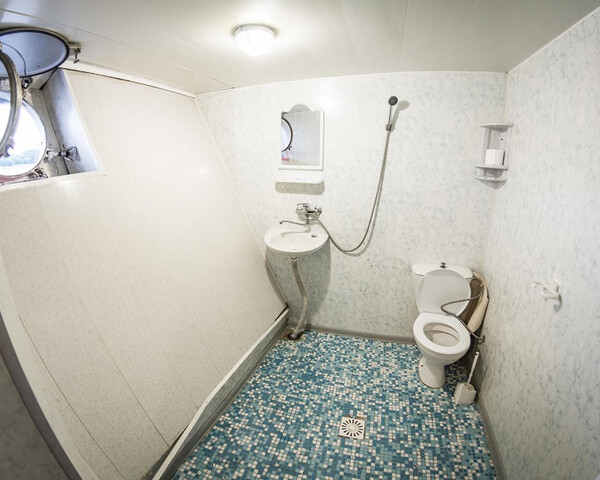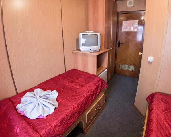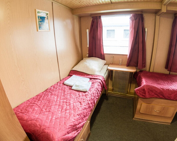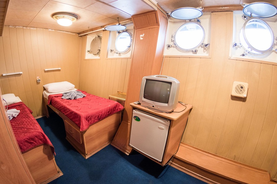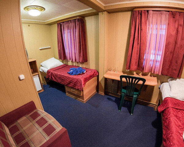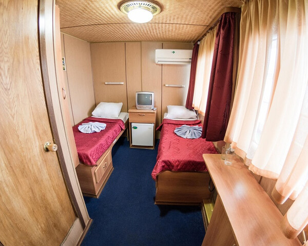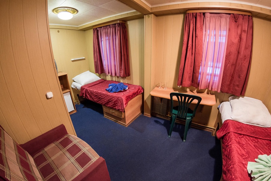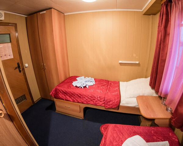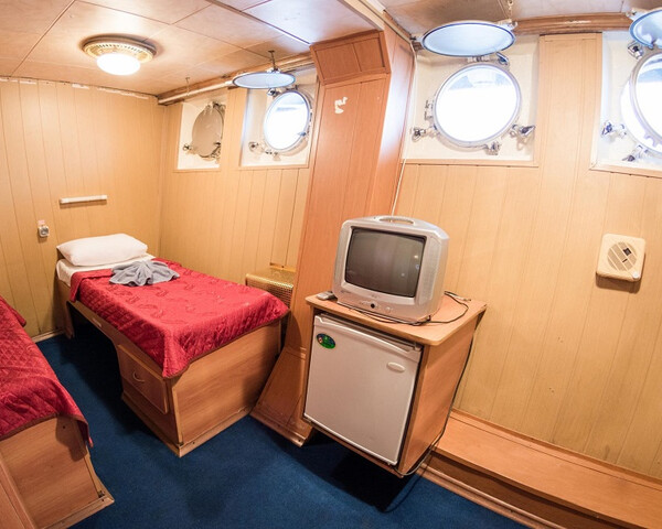 В каюте: две односпальные кровати, шкаф для одежды, ванная комната (раковина, душ, туалет), общая система вентиляции, телевизор, холодильник, радио, розетка на 220V, иллюминаторы.