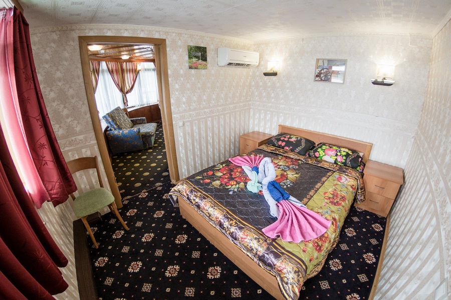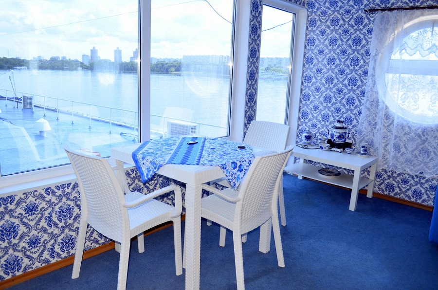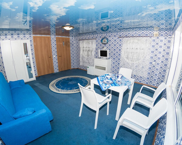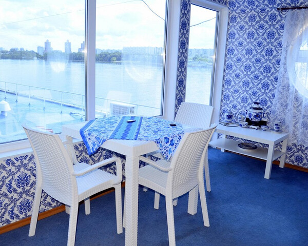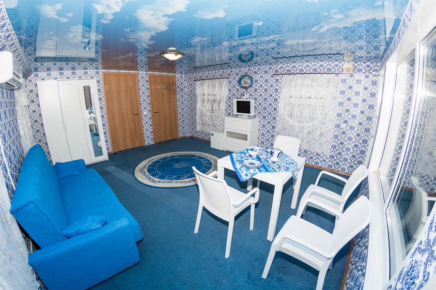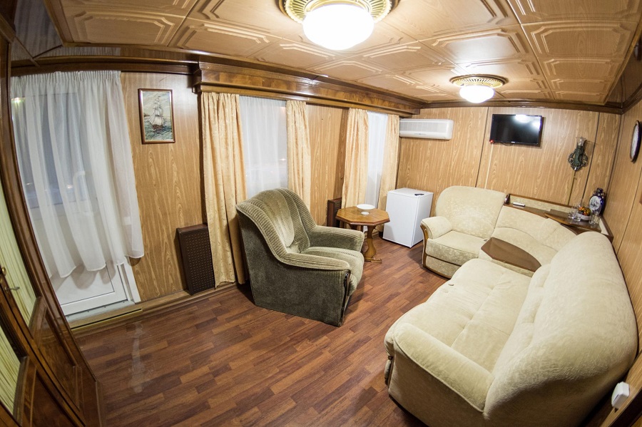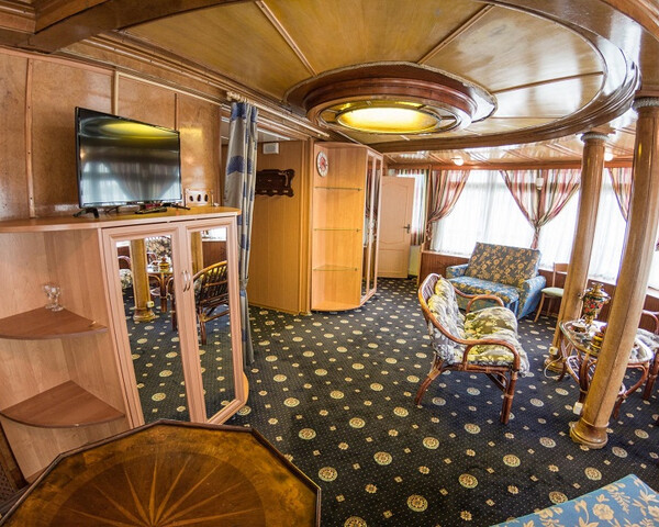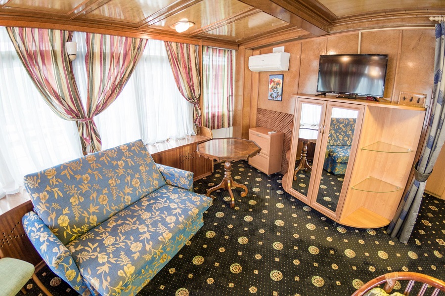 В каюте: двуспальная кровать, шкаф для одежды, ванная комната (ванна, туалет, раковина), кондиционер, мягкая мебель, телевизор, холодильник, радио, фен, обзорные окна, розетка на 220 V. Выполнена в стиле «Гжель».