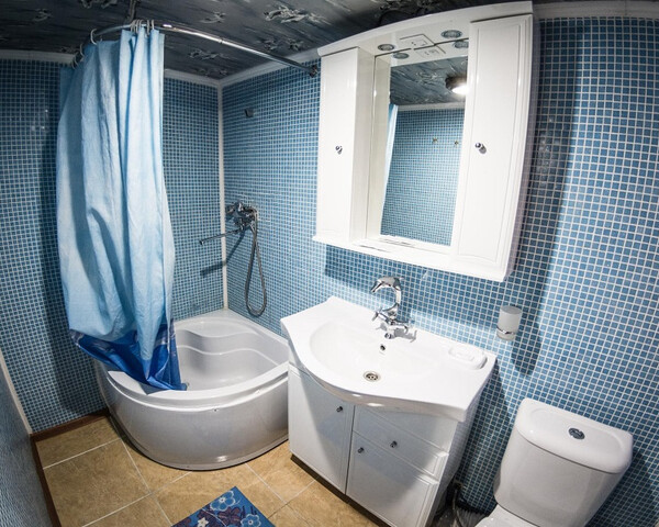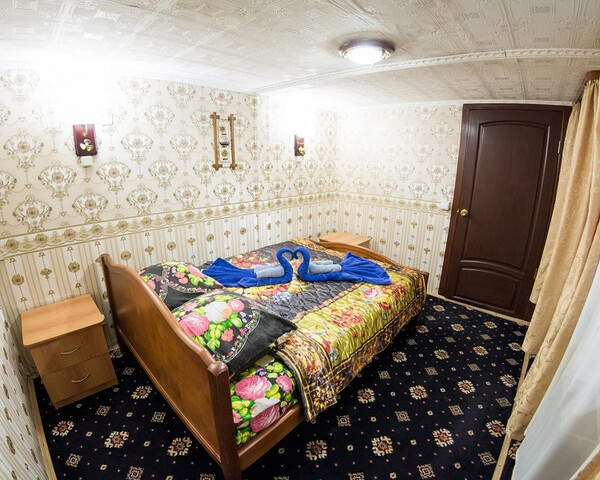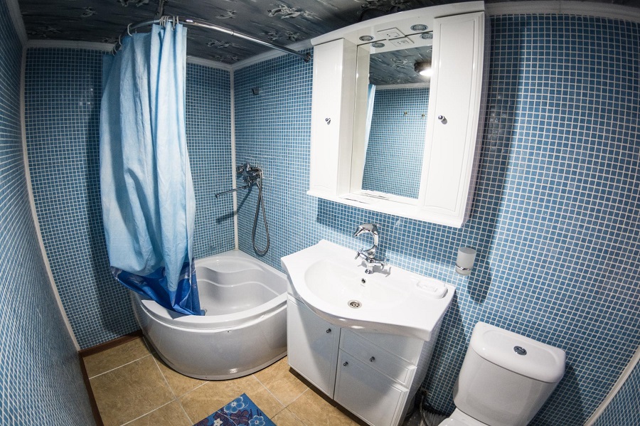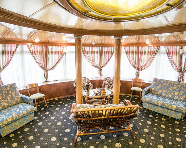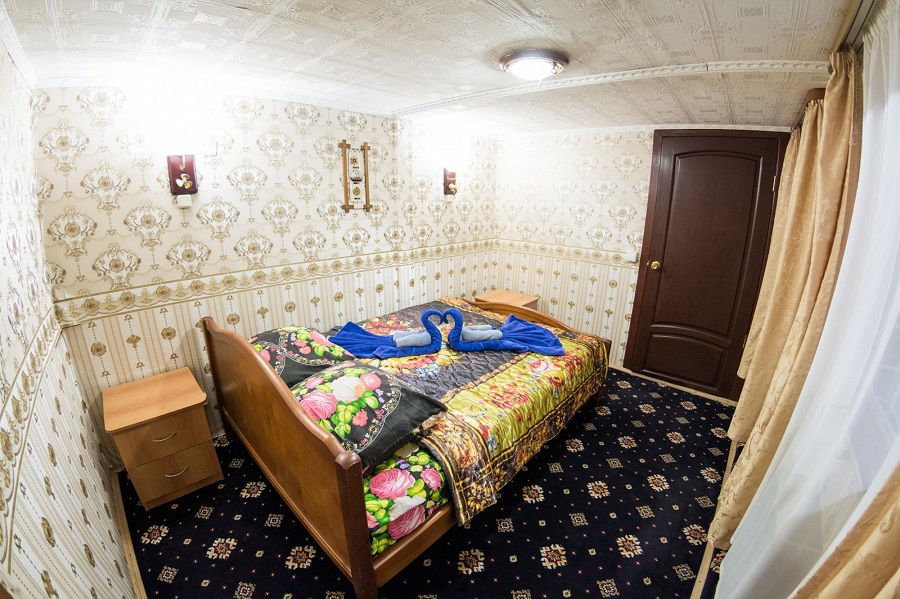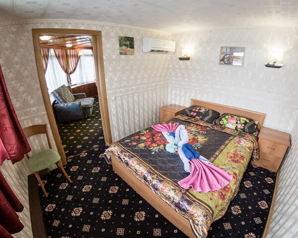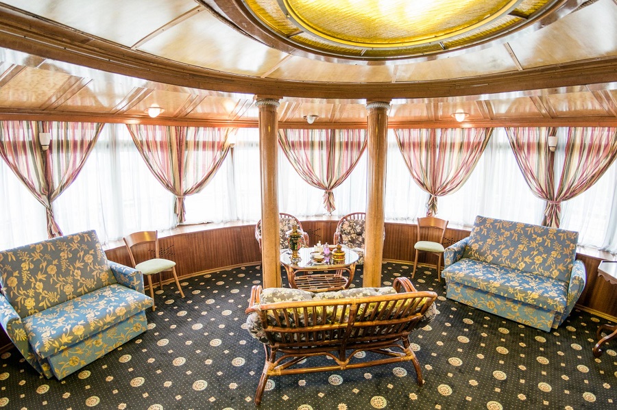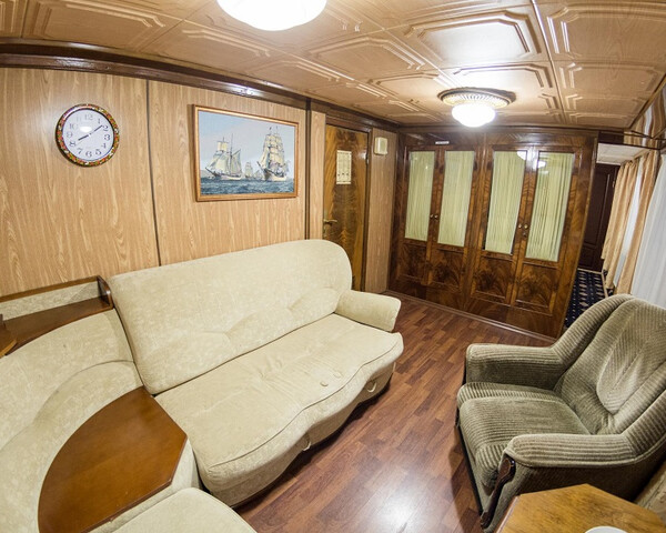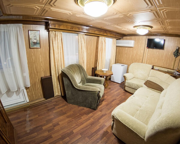 В каюте: двуспальная кровать, шкаф для одежды, ванная комната (ванна, туалет, раковина), кондиционер, мягкая мебель, телевизор, холодильник, радио, фен, обзорные окна, розетка на 220 V. Выполнена в стиле «Гжель».