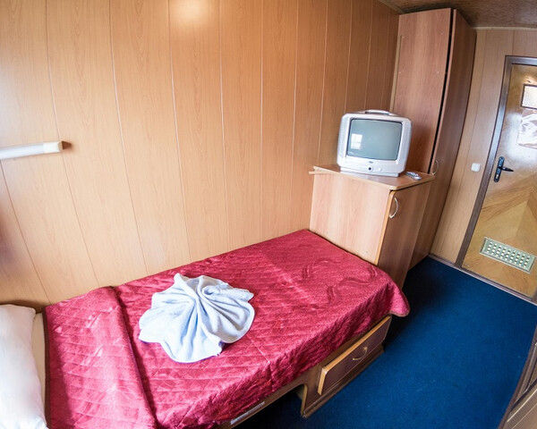 К категории А1 (I) относятся каюты: 403.Одноместная каюта со всеми удобствами, расположенная на шлюпочной палубе.В каюте: односпальная кровать, шкаф для одежды, ванная комната (раковина, душ, туалет), телевизор, холодильник, радио, розетка 220V, обзорное окно.
