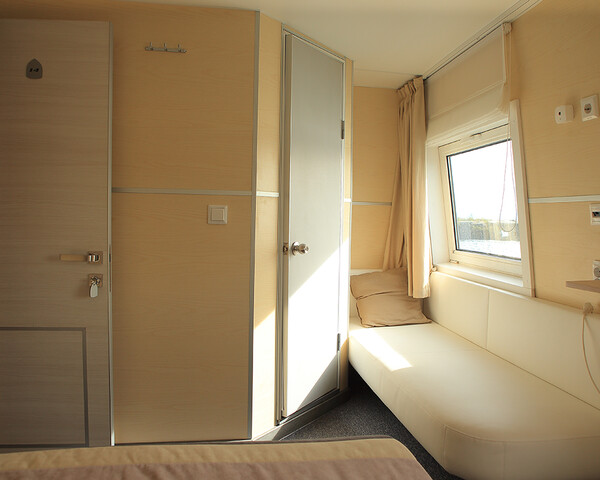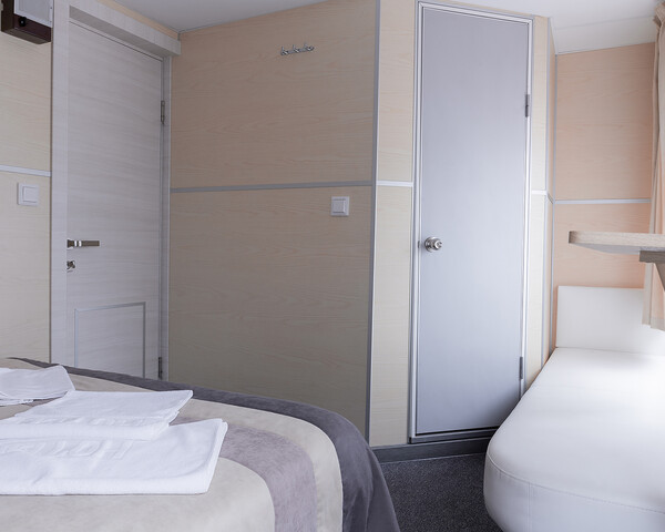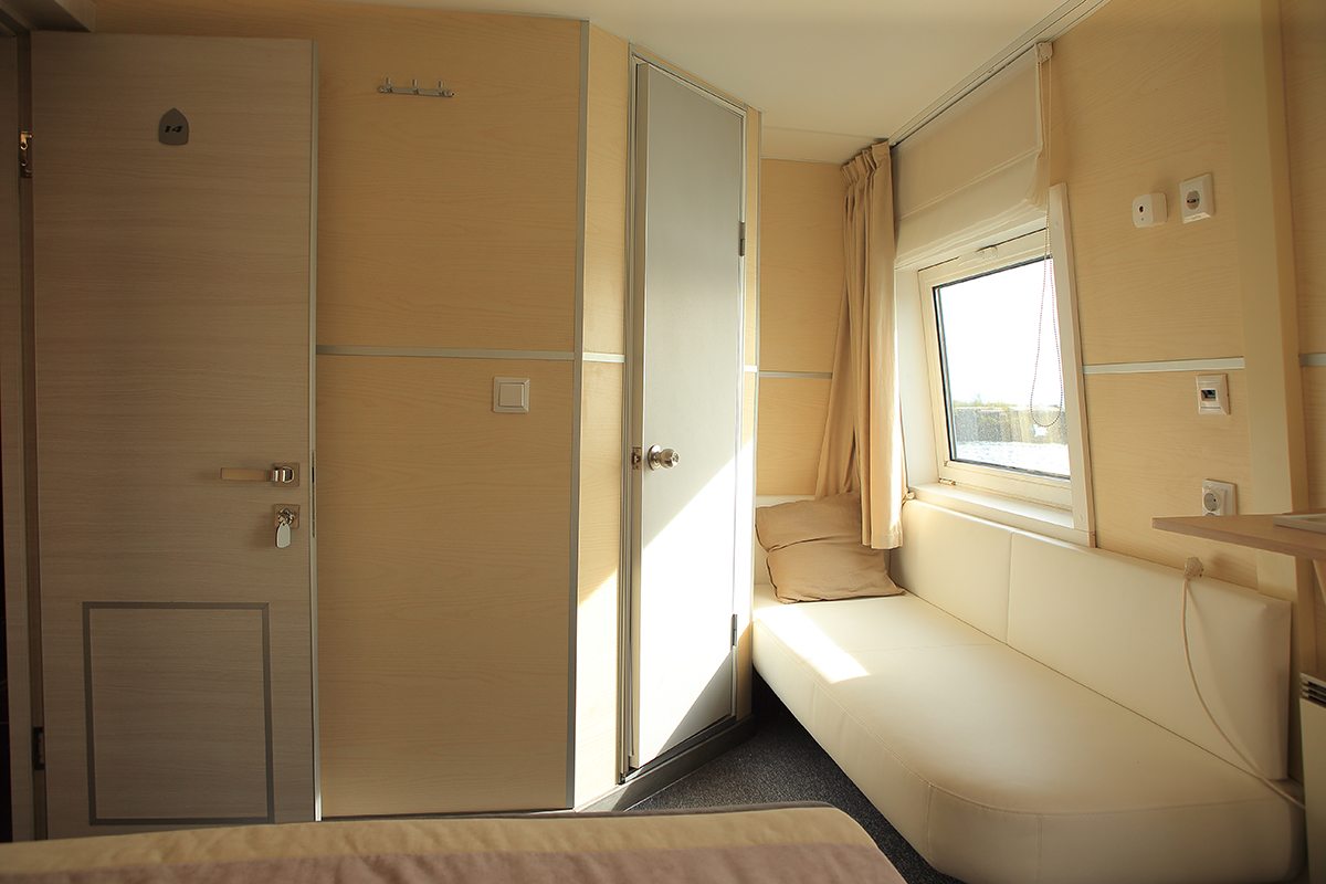 В каюте: двуспальная кровать, софа, ванная комната (душ, туалет, раковина), шкаф для одежды, стол, светильник, розетка 220V, обогреватель, фен, обзорные окна (открываются).